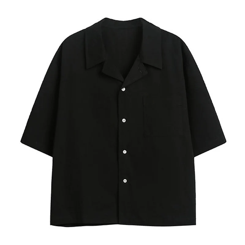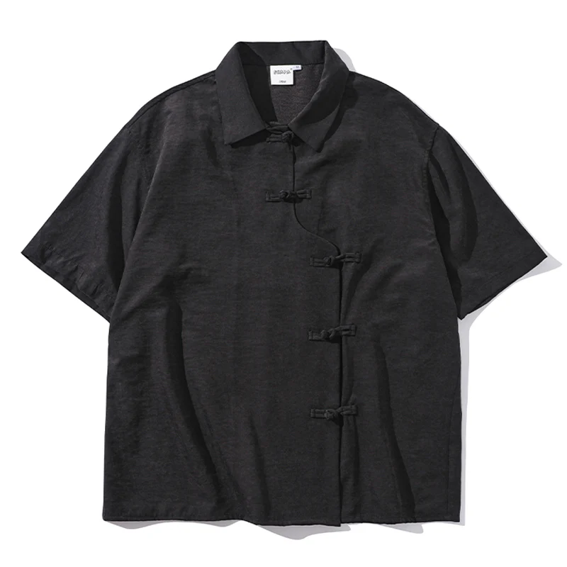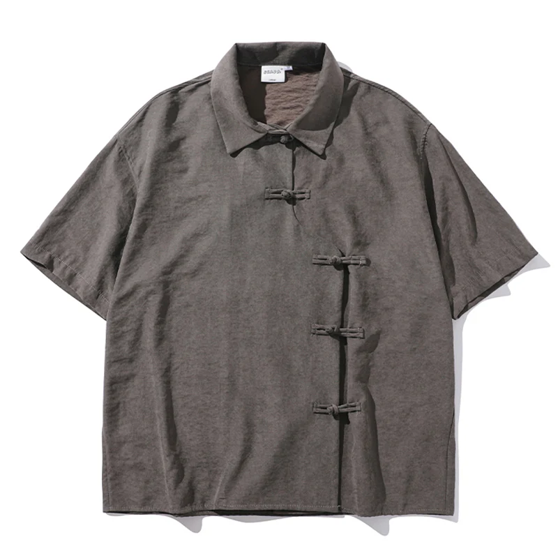 無地三色 チャイナボタン付き不規則前立シャツ