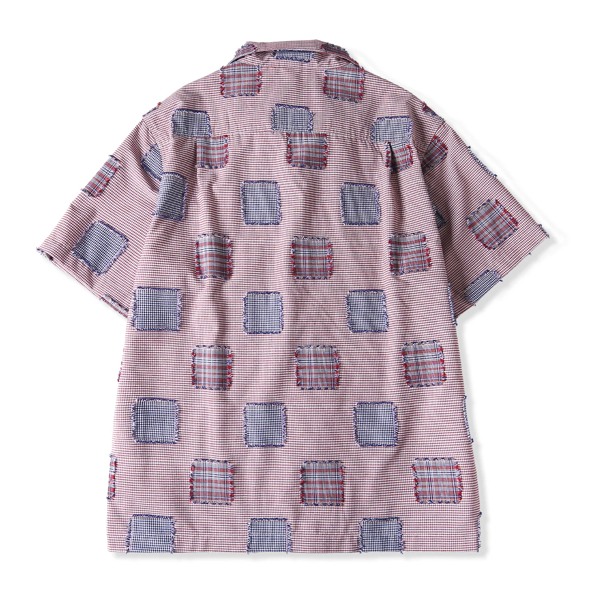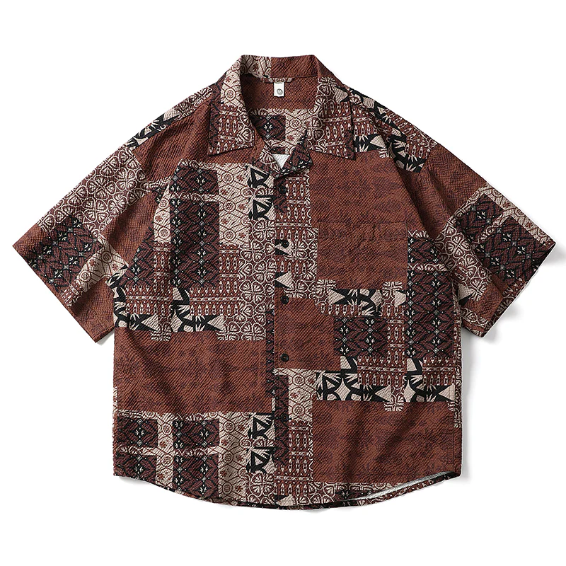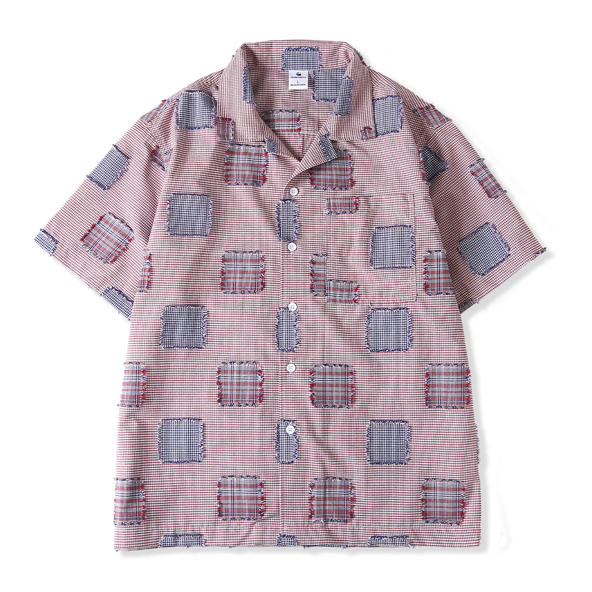 エスニック調パッチワーク風シアサッカー半袖キューバシャツ