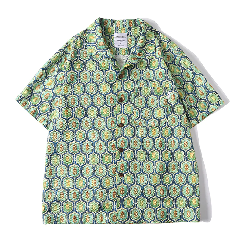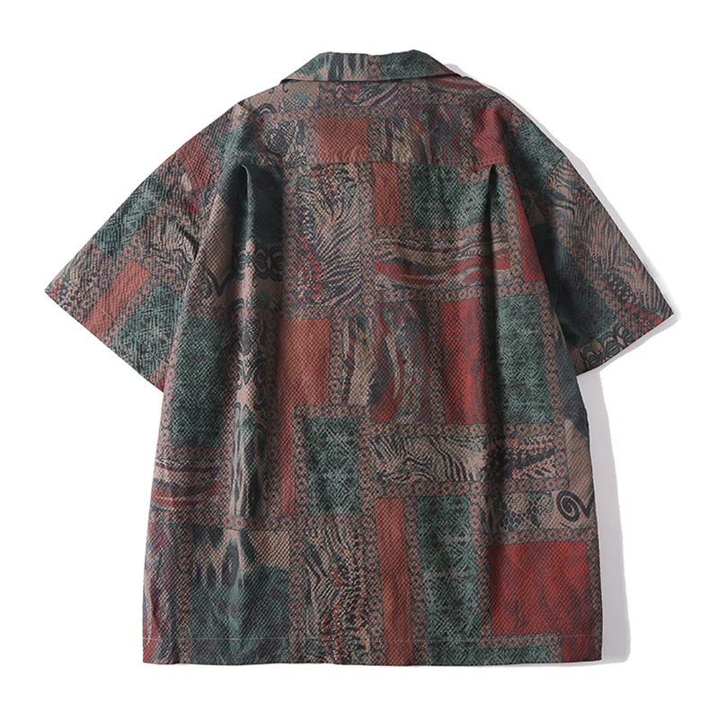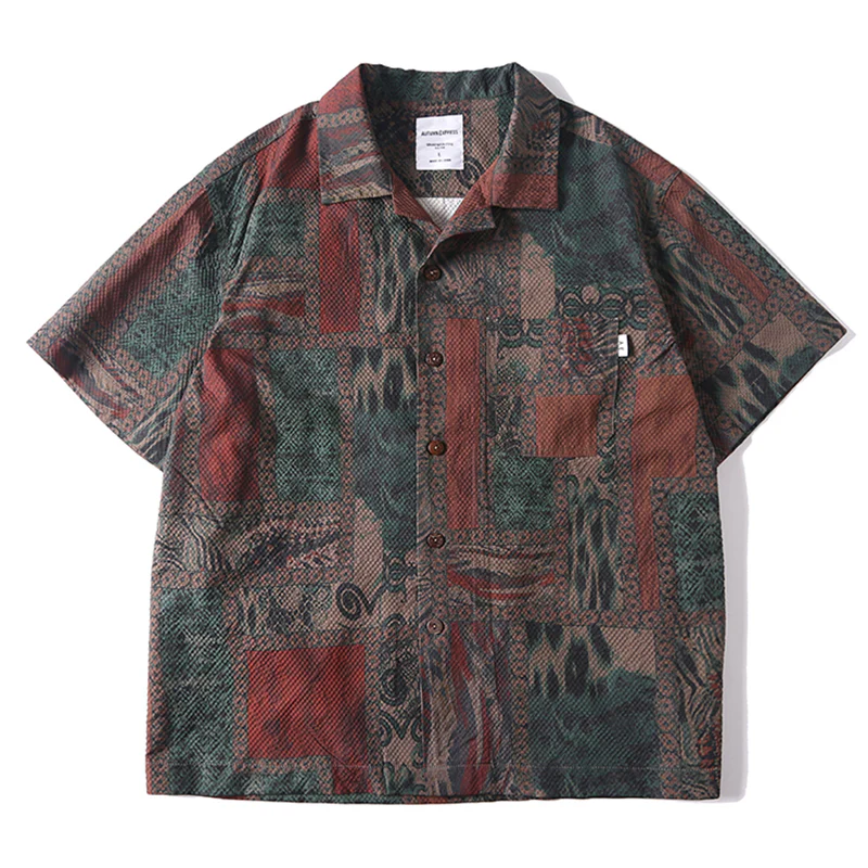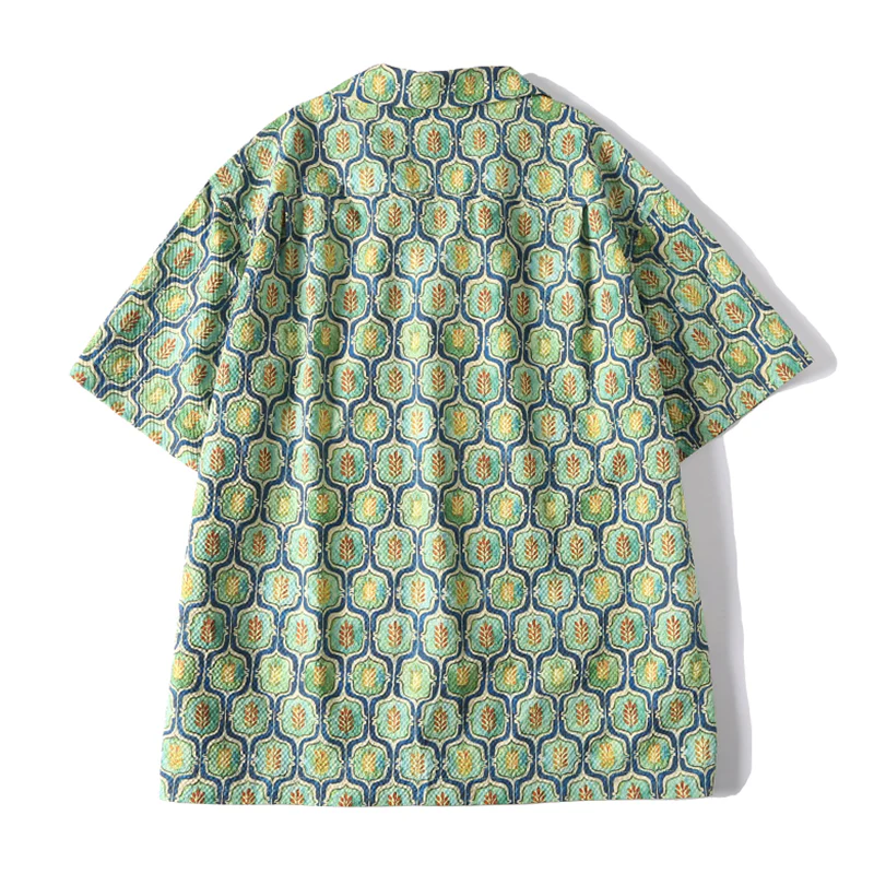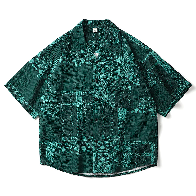 エスニック調パッチワーク風シアサッカー半袖キューバシャツ