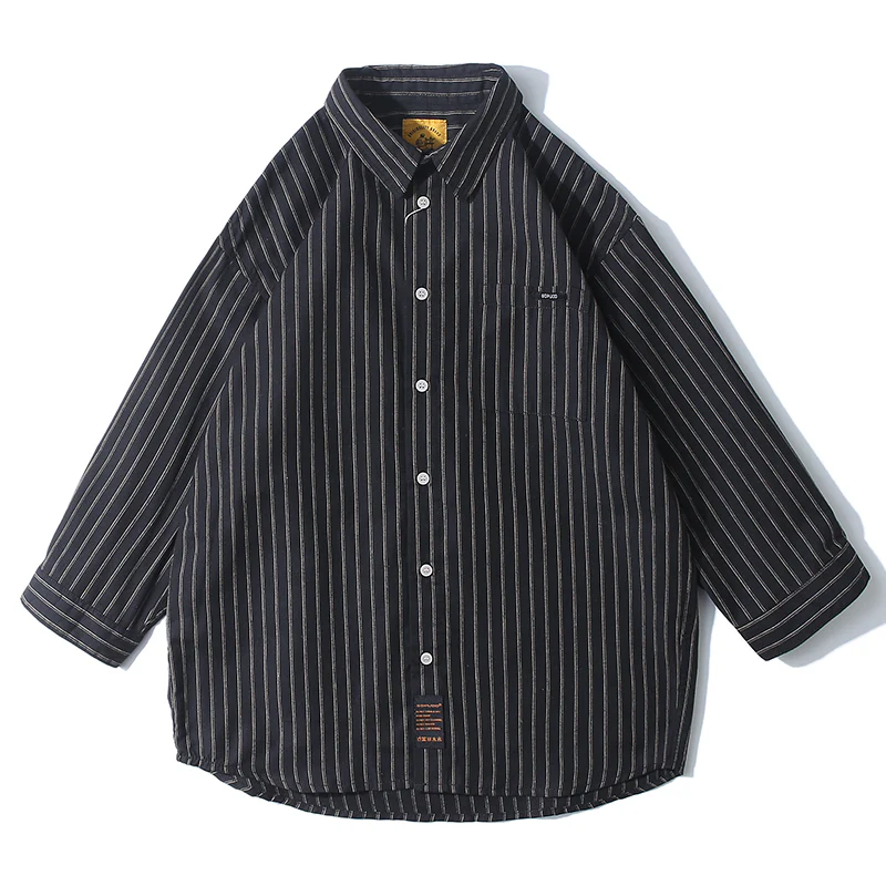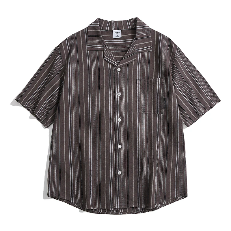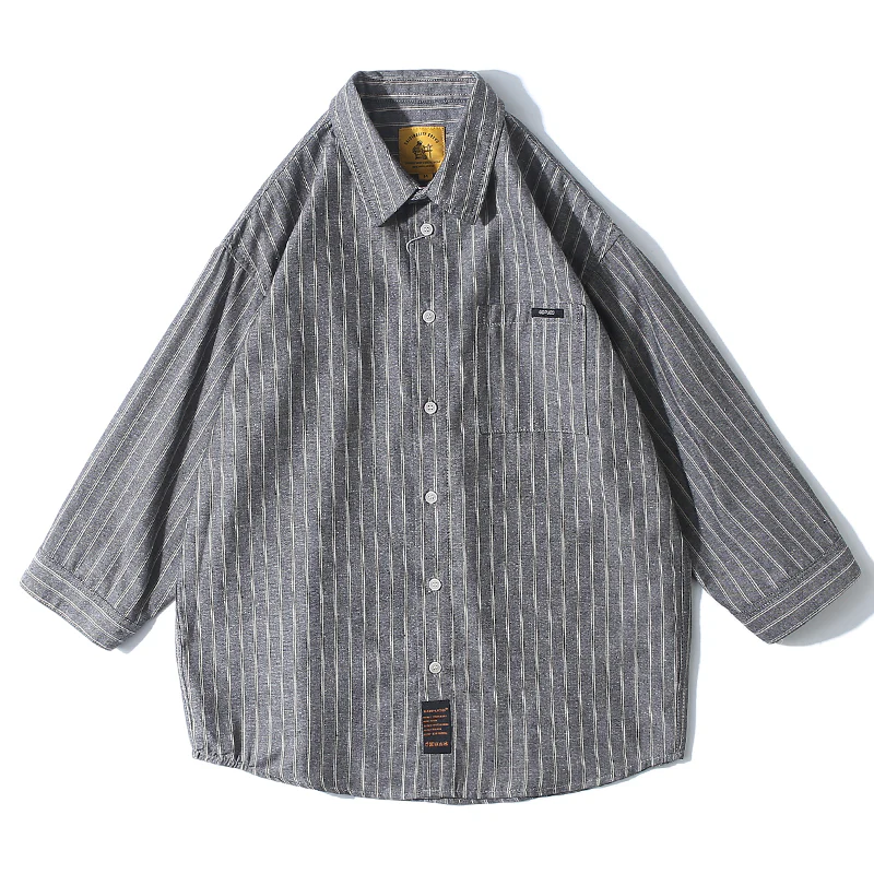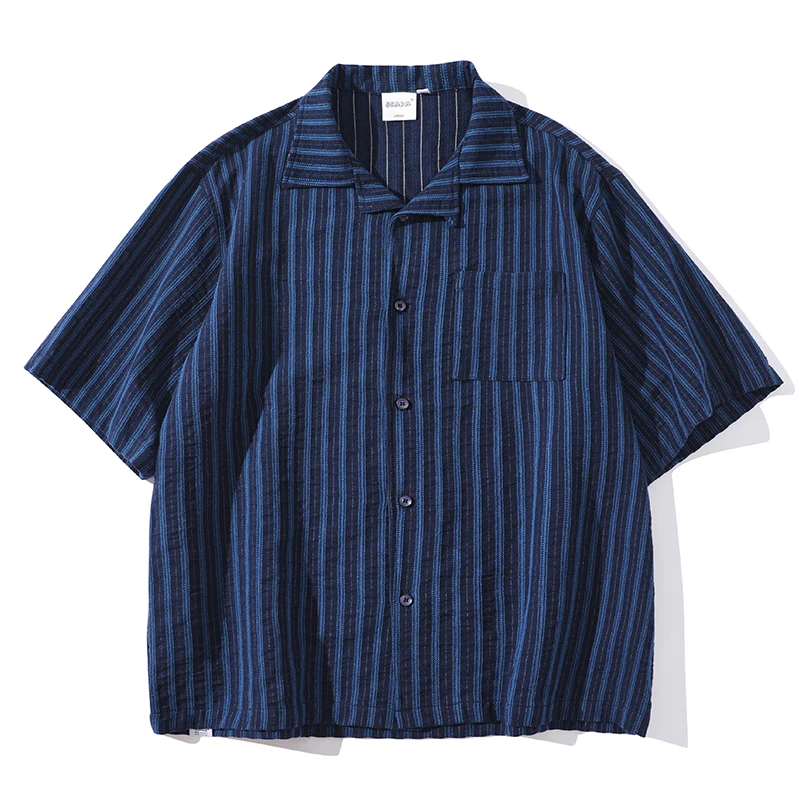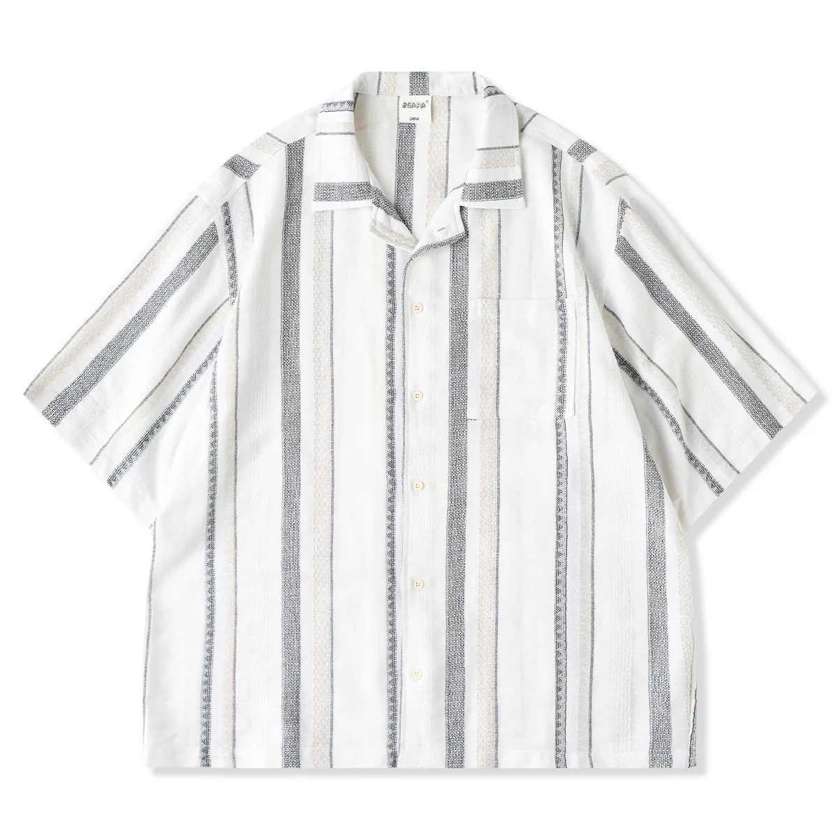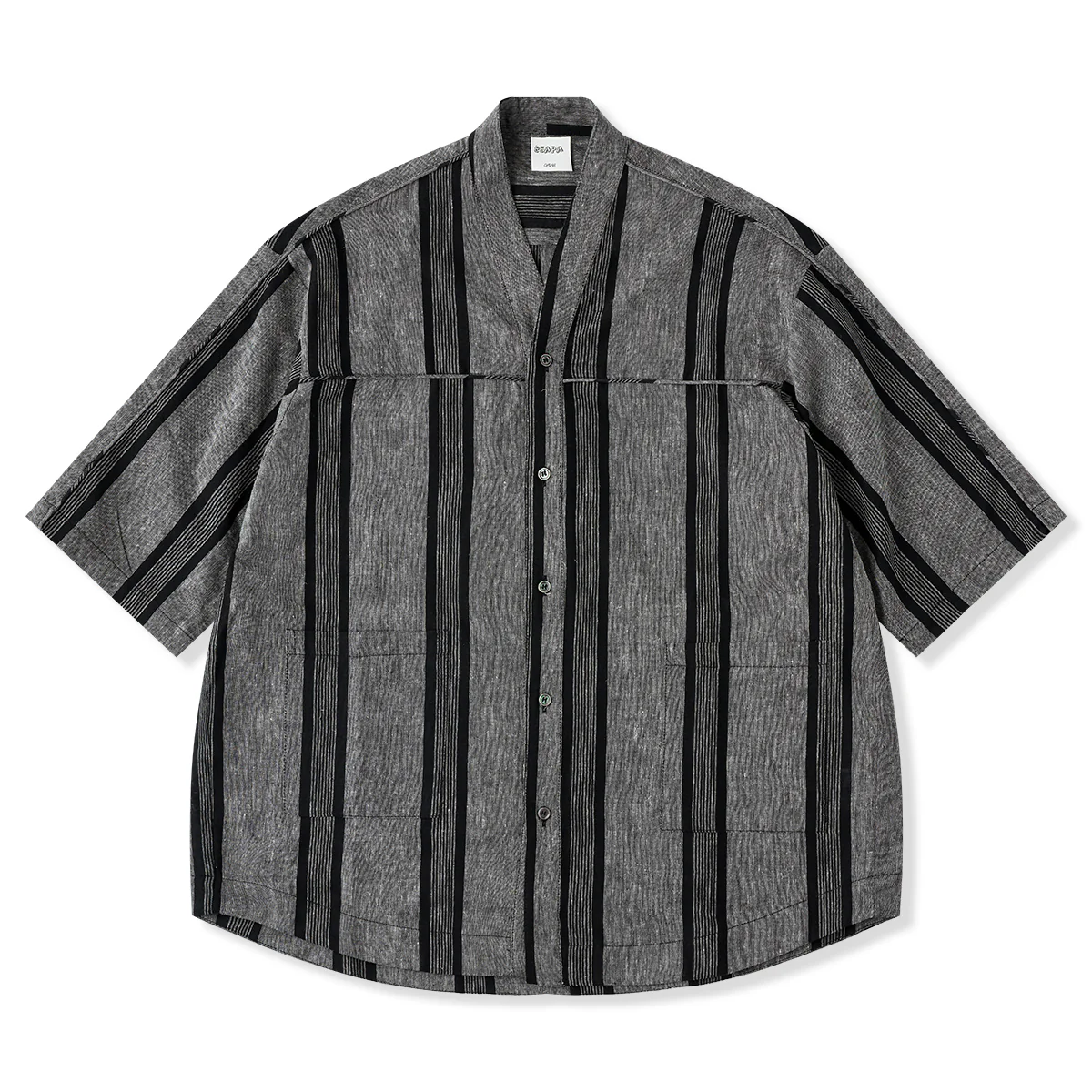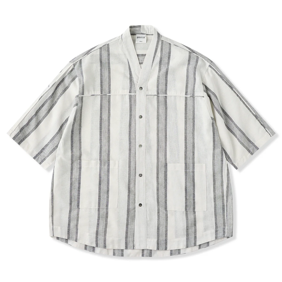 3色展開 改良型ストライプ柄綿麻半纏衿半袖シャツ