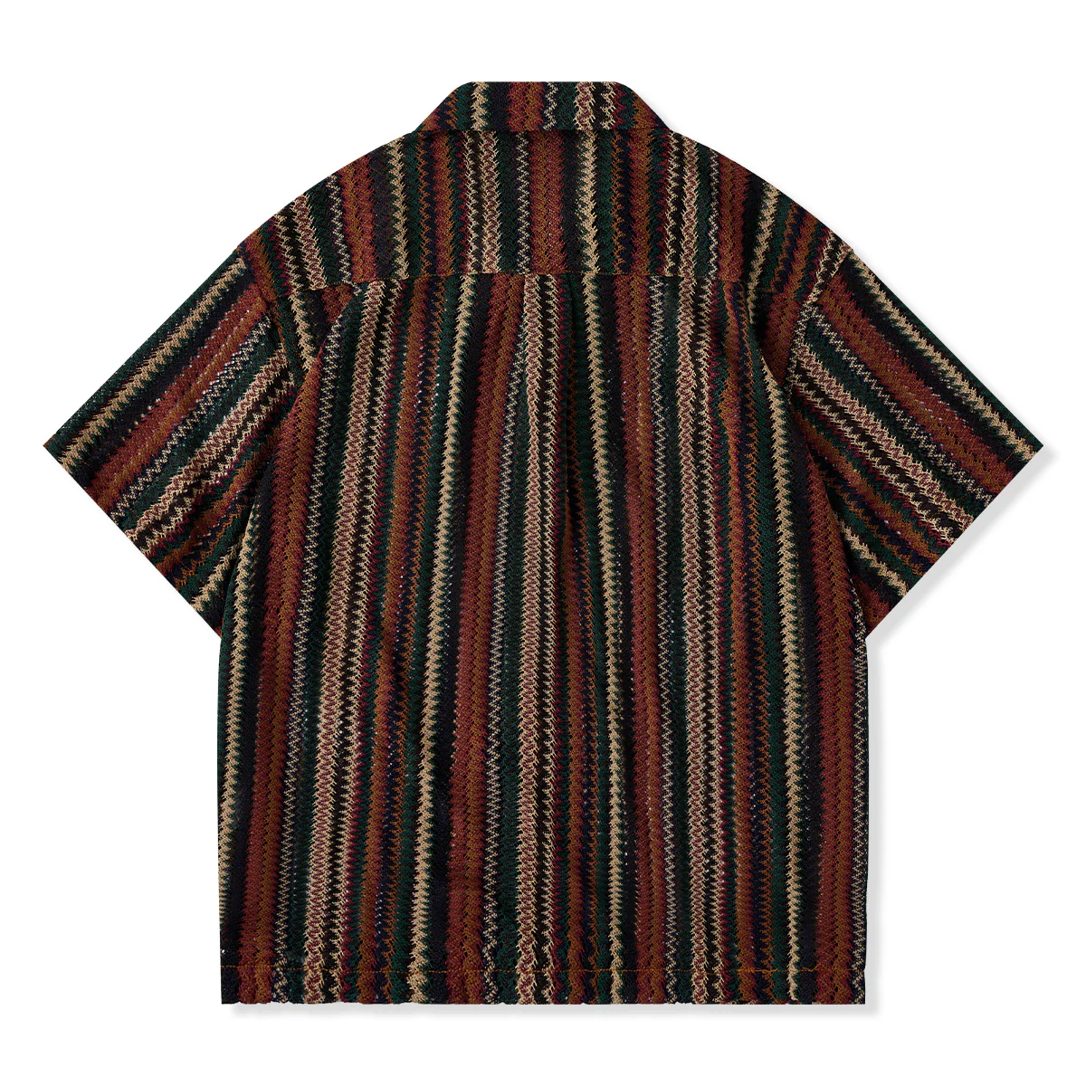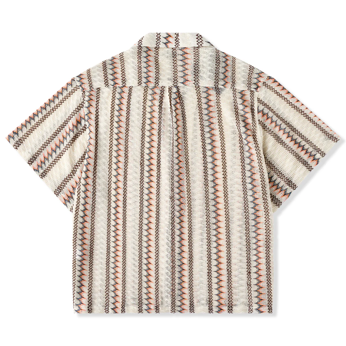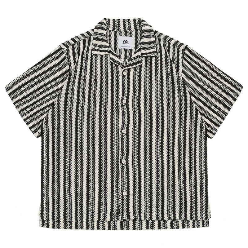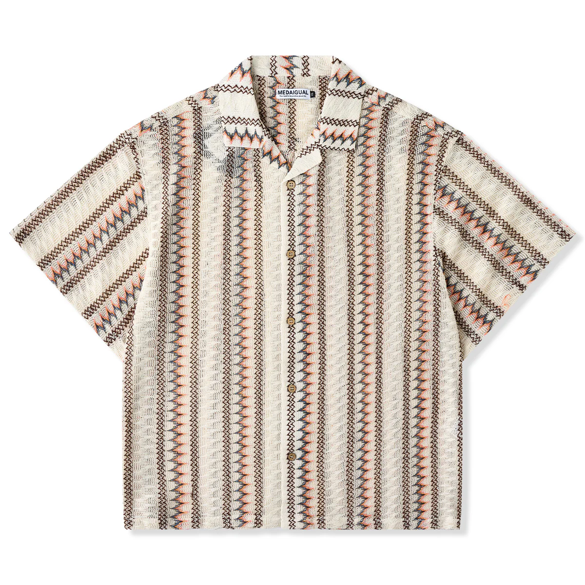 エスニック調 ニット編みストライプ柄透かし彫りオープンカラーシャツ