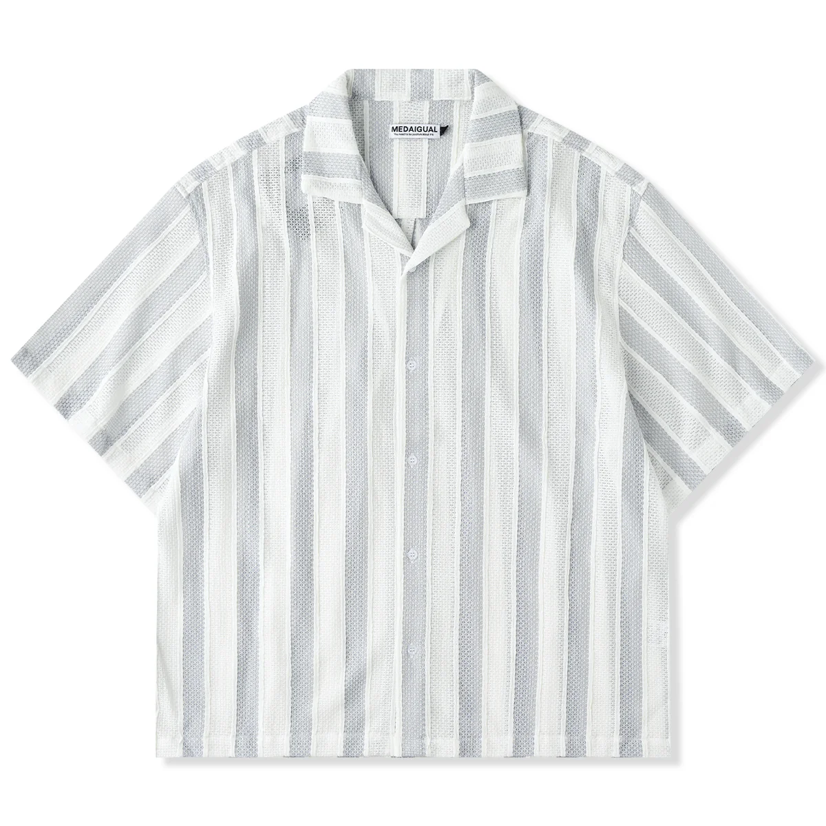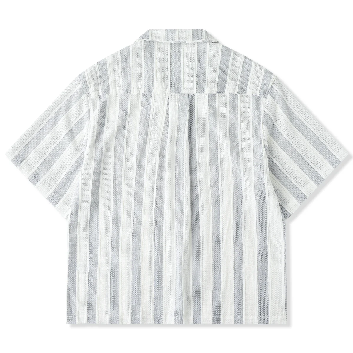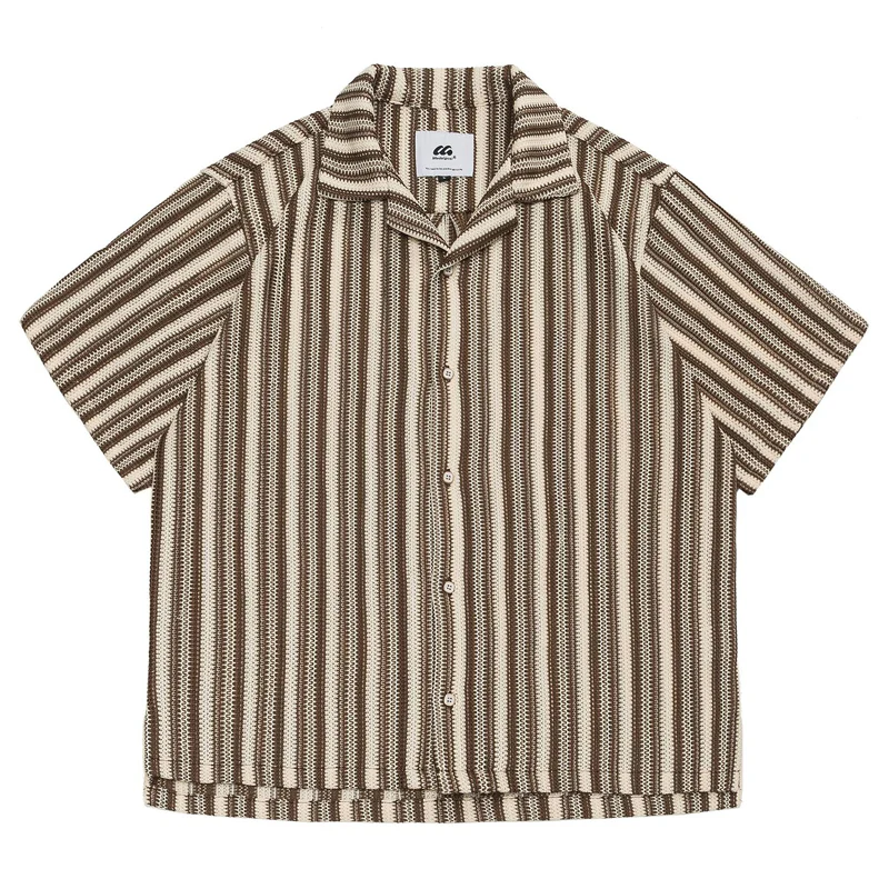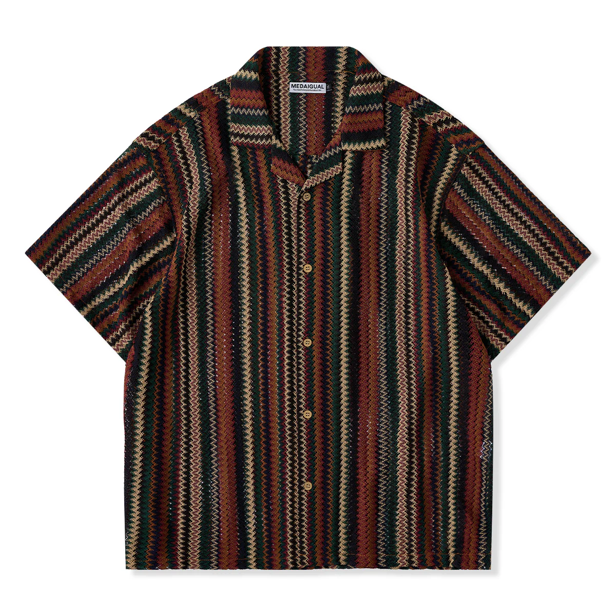 エスニック調 ニット編みストライプ柄透かし彫りオープンカラーシャツ