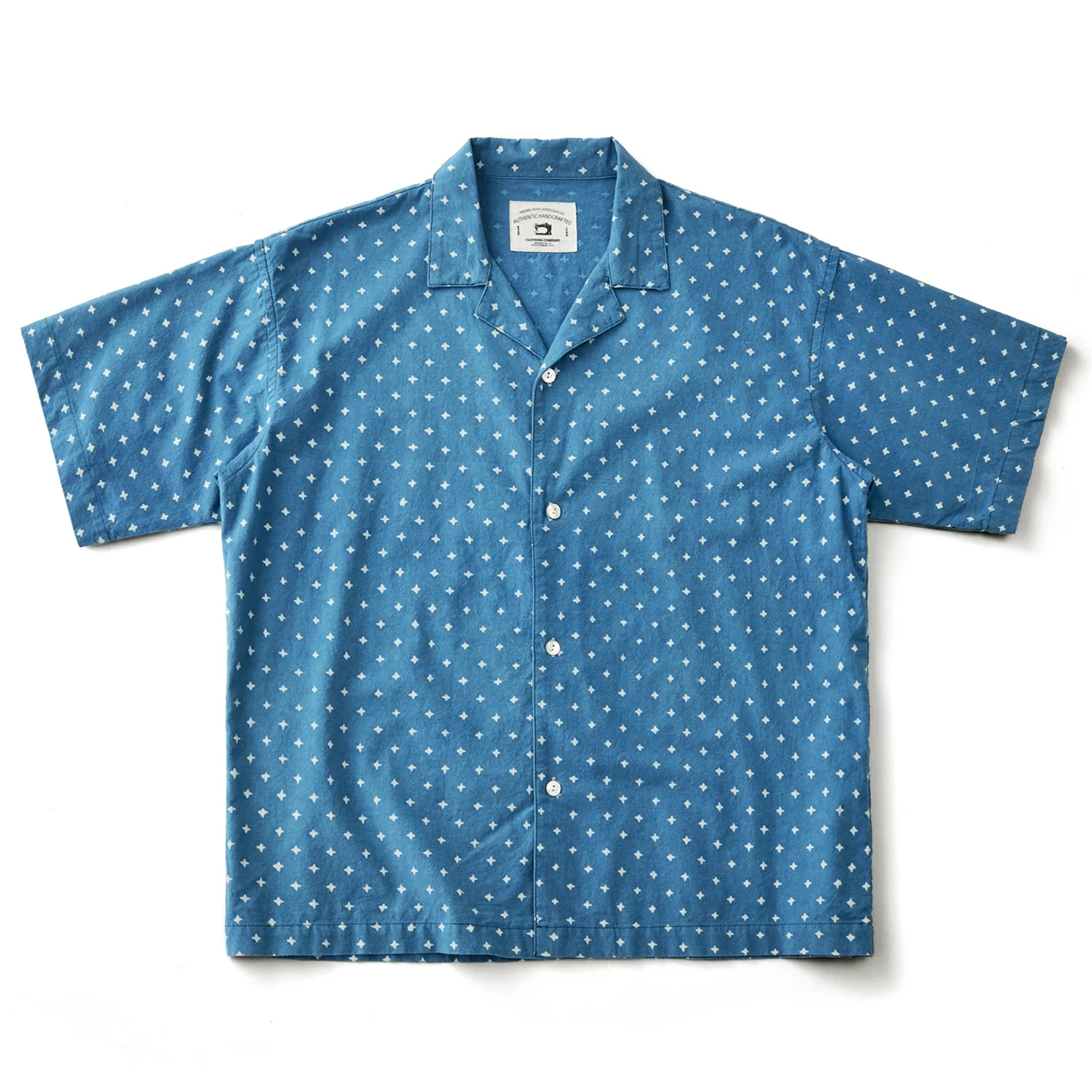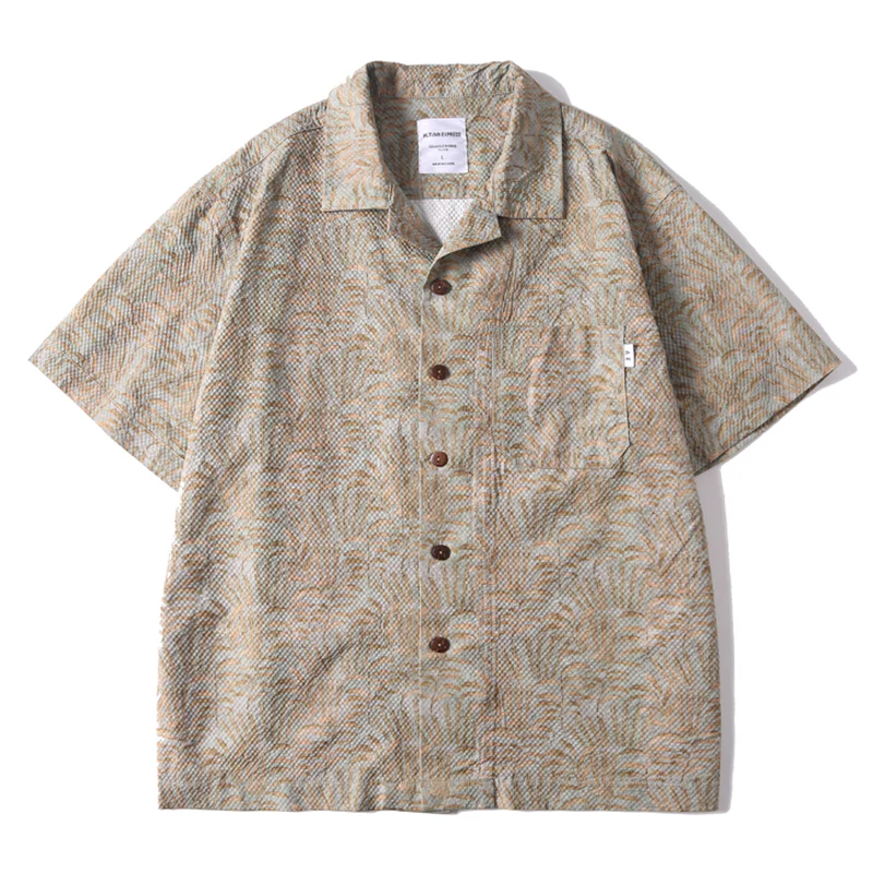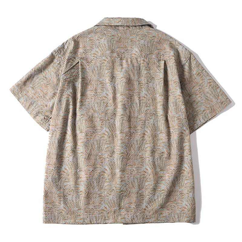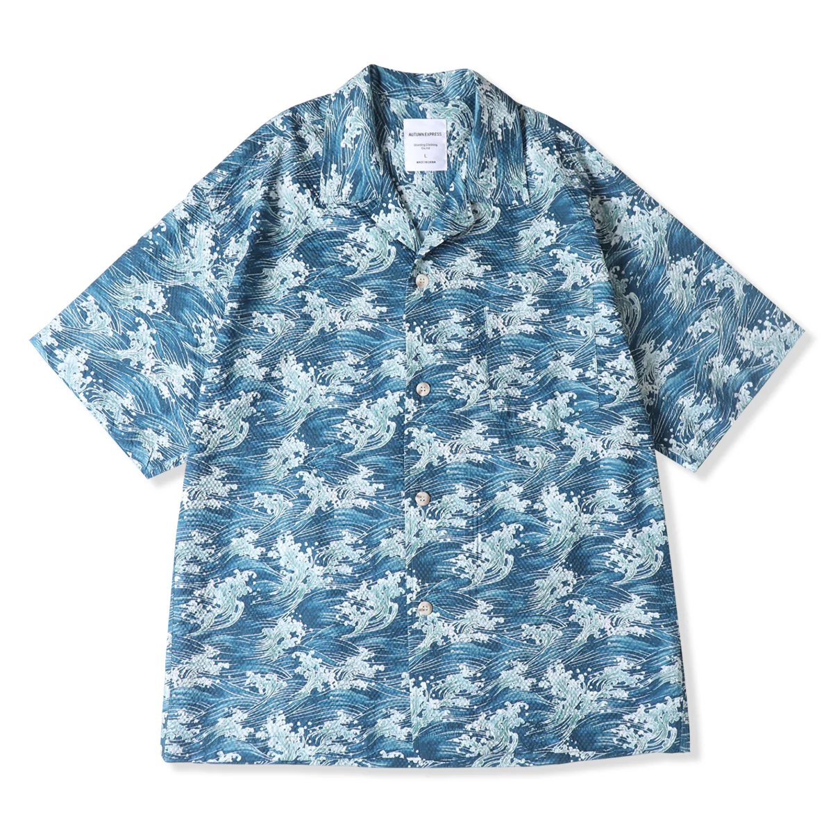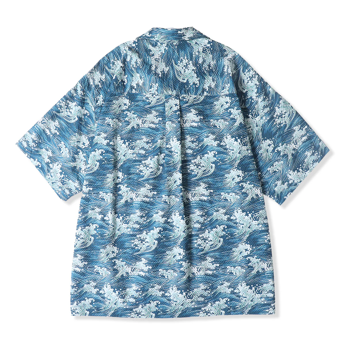シアサッカー 水彩風波総柄オープンカラーシャツ