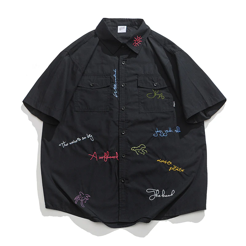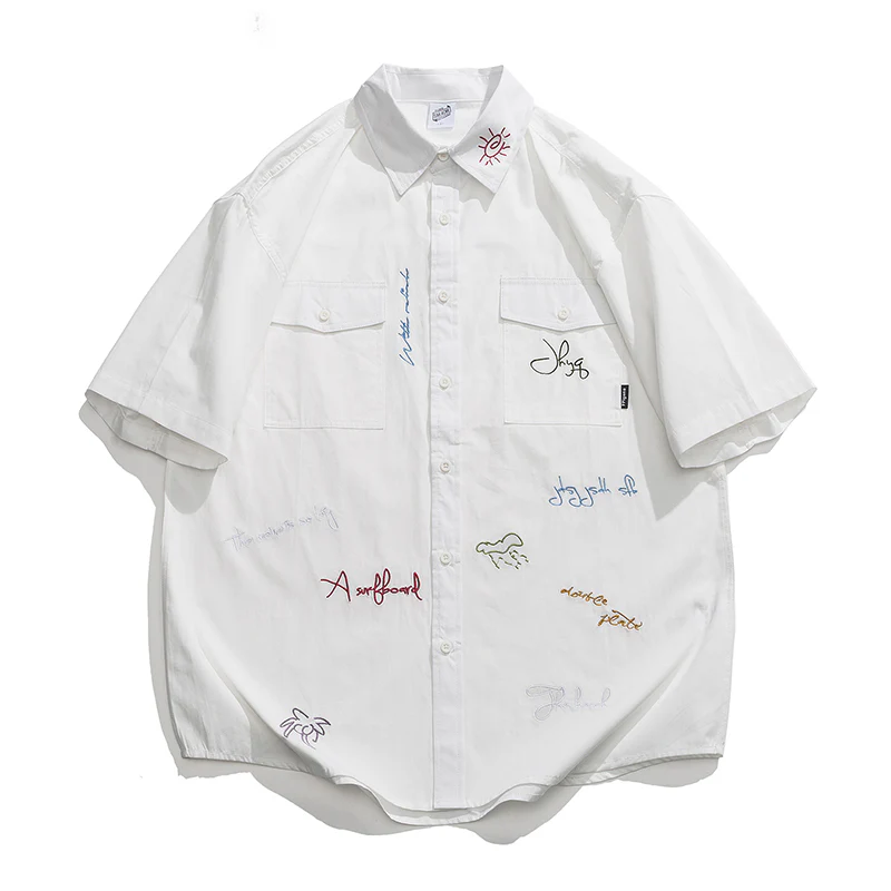 落書き風レタリング刺繍入り半袖ワークシャツ