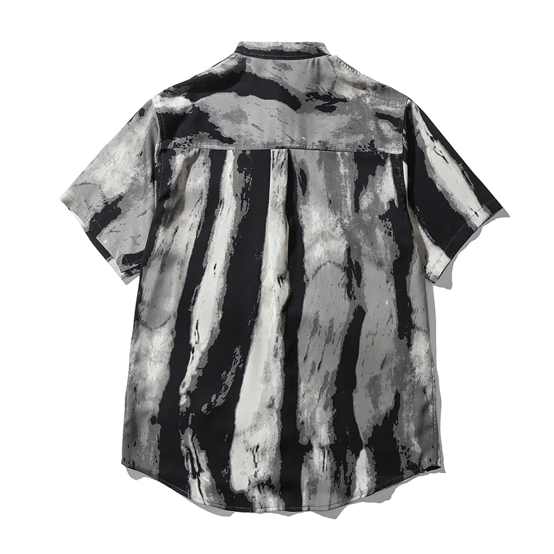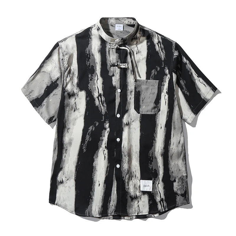 チャイナボタン切替 水墨画風プリントスタンドカラーシャツ