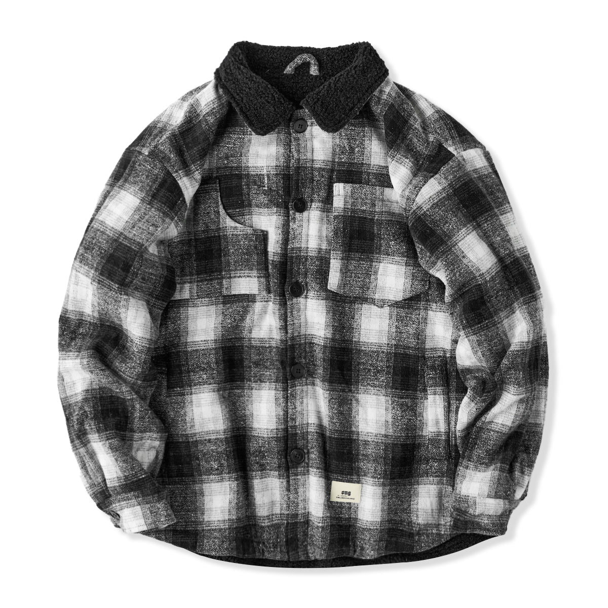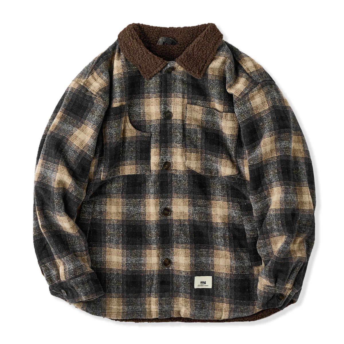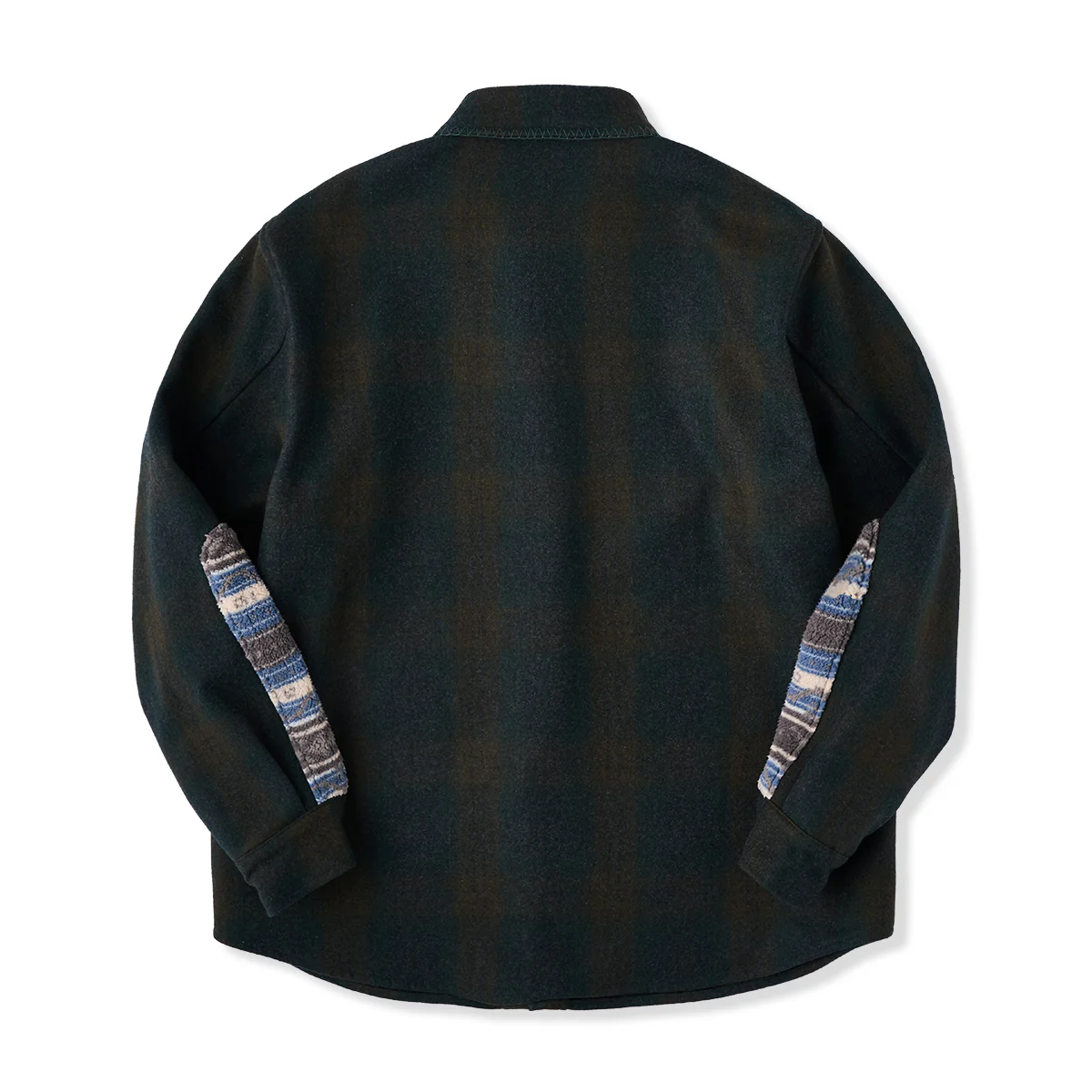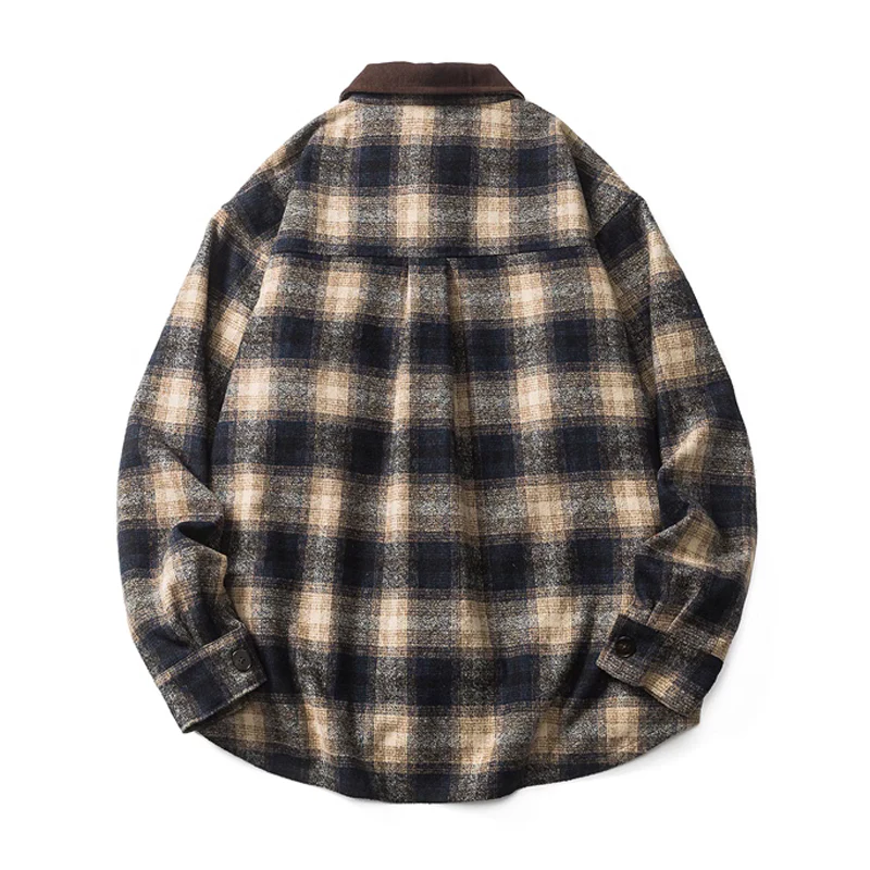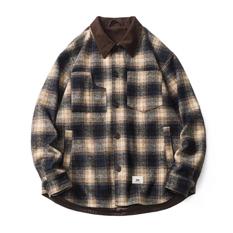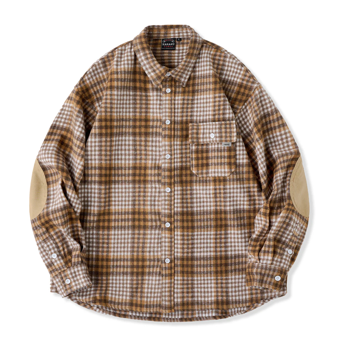 ウール混 コーデュロイ襟切替ツイードチェック柄長袖シャツ