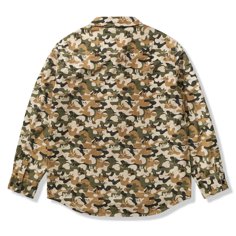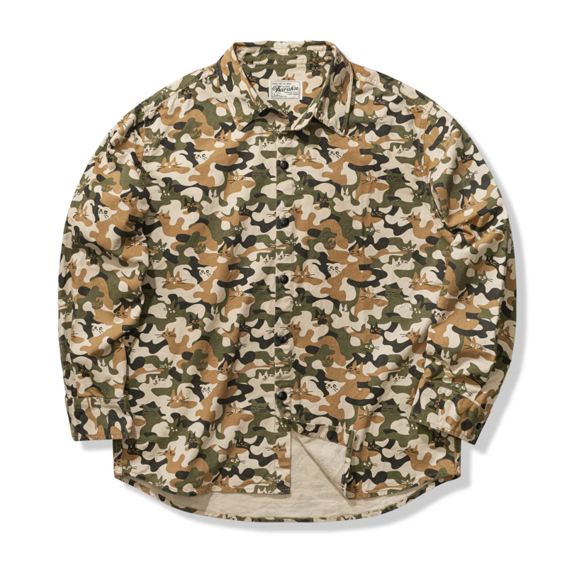 「猫が迷彩に溶け込む」総柄 ミリタリー風ワークシャツ