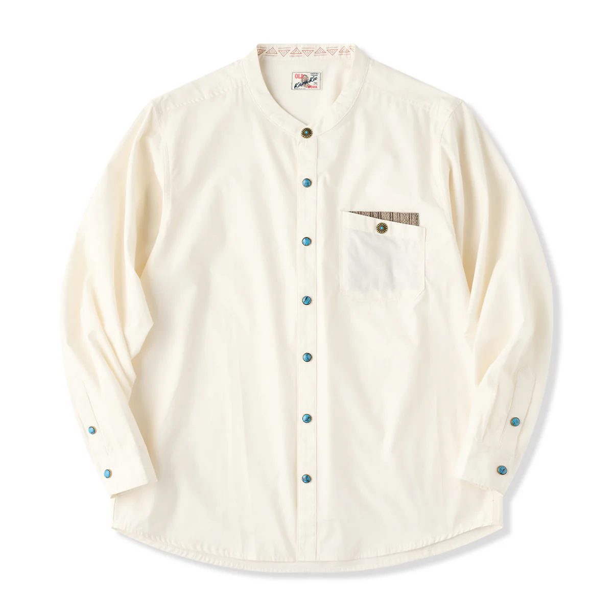 エスニック調ジャカード ターコイズ風ボタン付き長袖シャツ