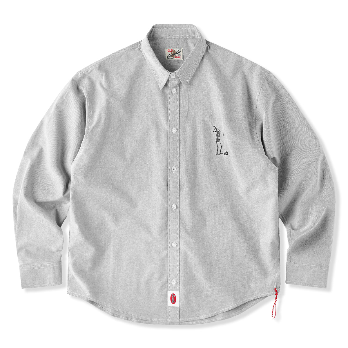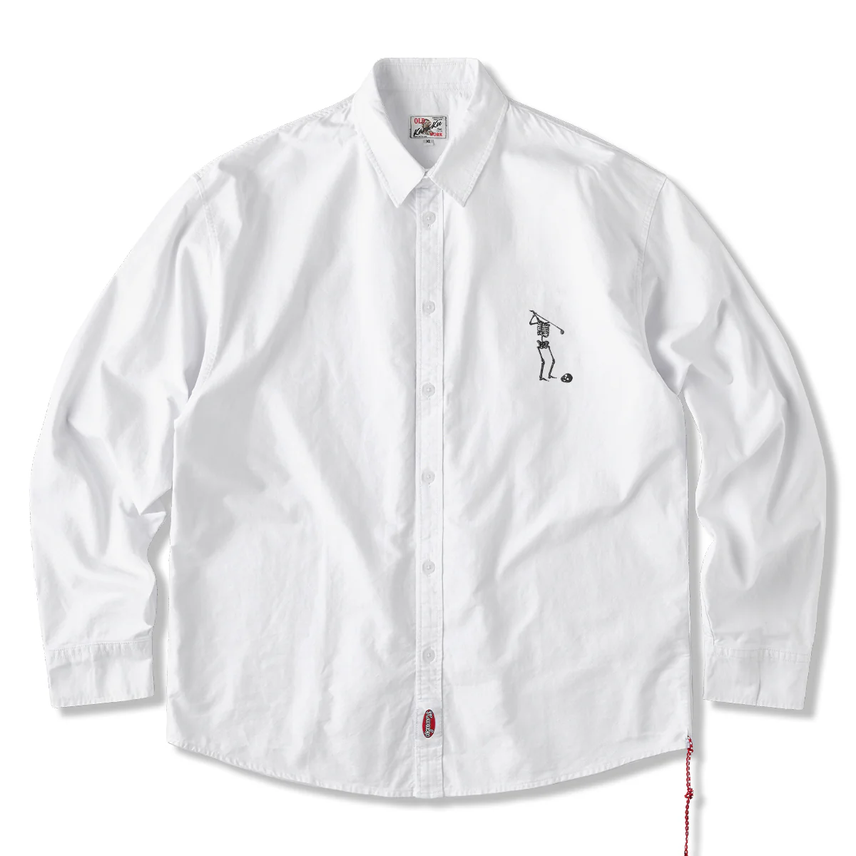 赤ヒモ付き 「ゴルフスイングの首が落ちた骸骨」刺繍入りオックスフォード長袖シャツ