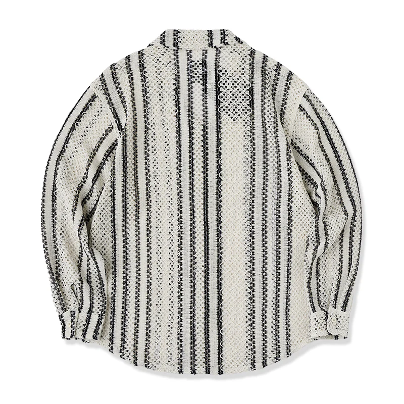 ニット編みストライプ柄 透かし彫りオープンカラーバルファスレースシャツ