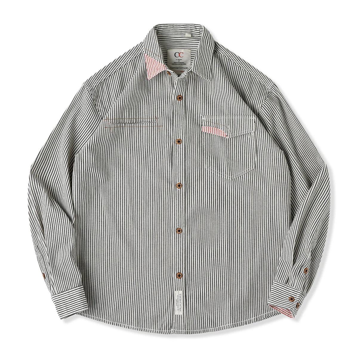 再構築 襟・ポケット・袖口配色切替ヒッコリーストライプワークシャツ