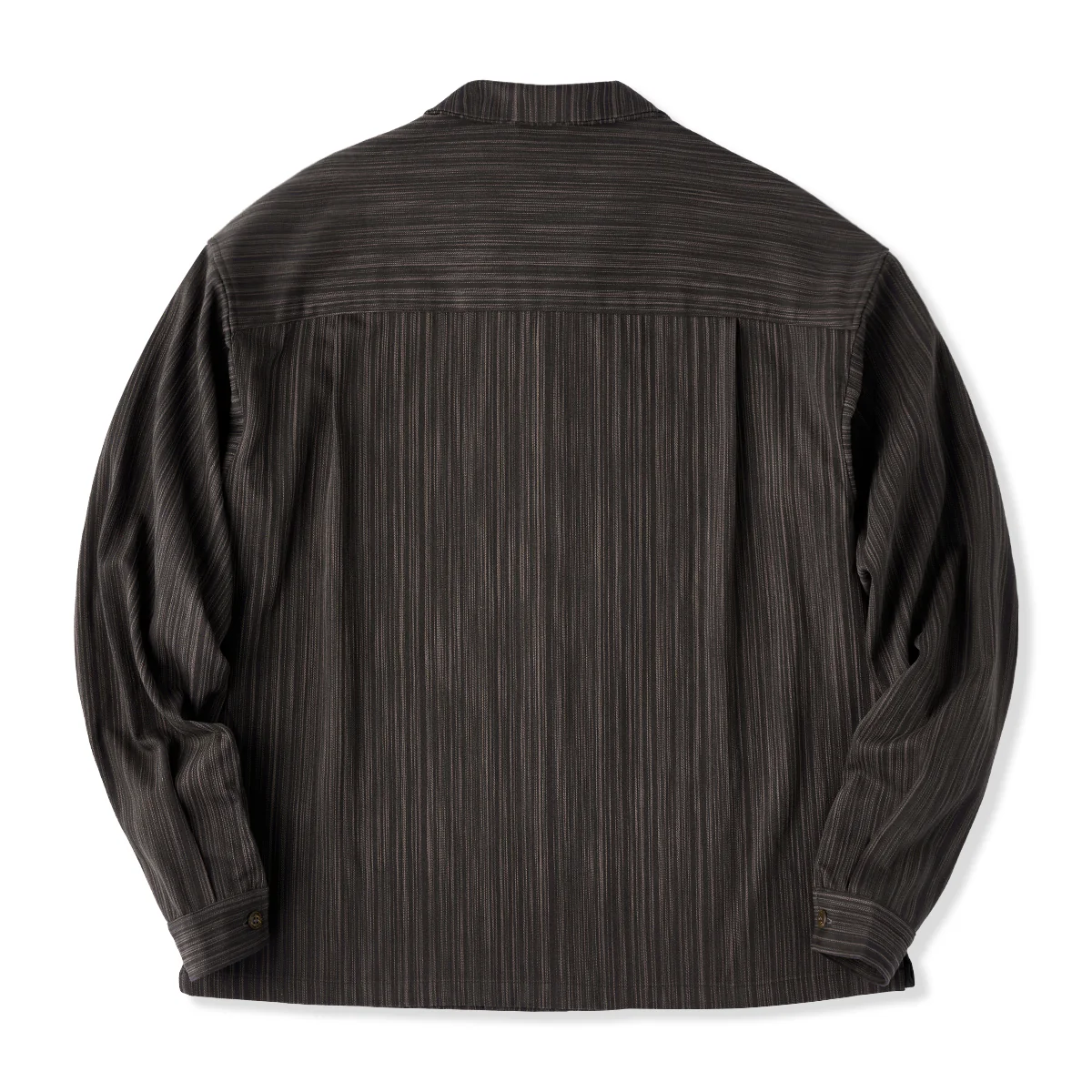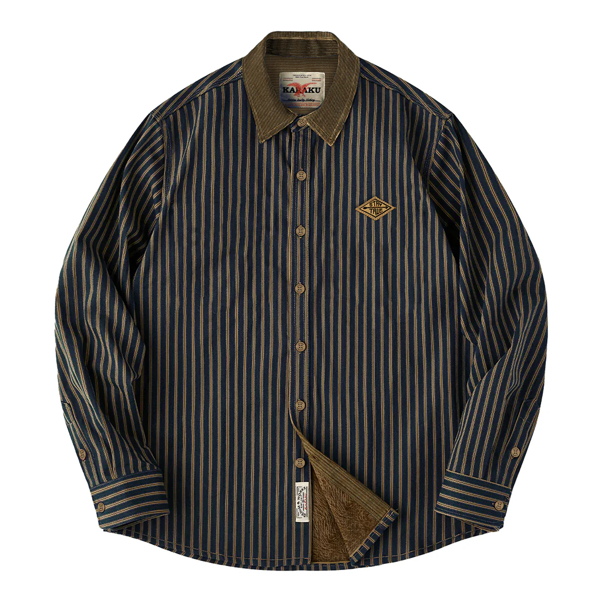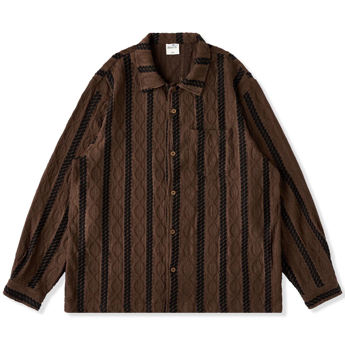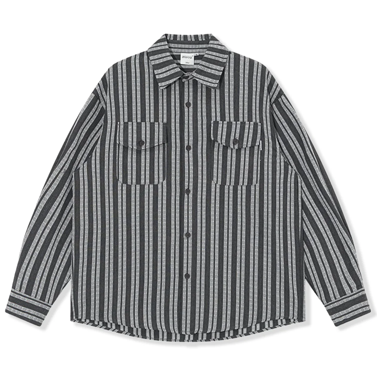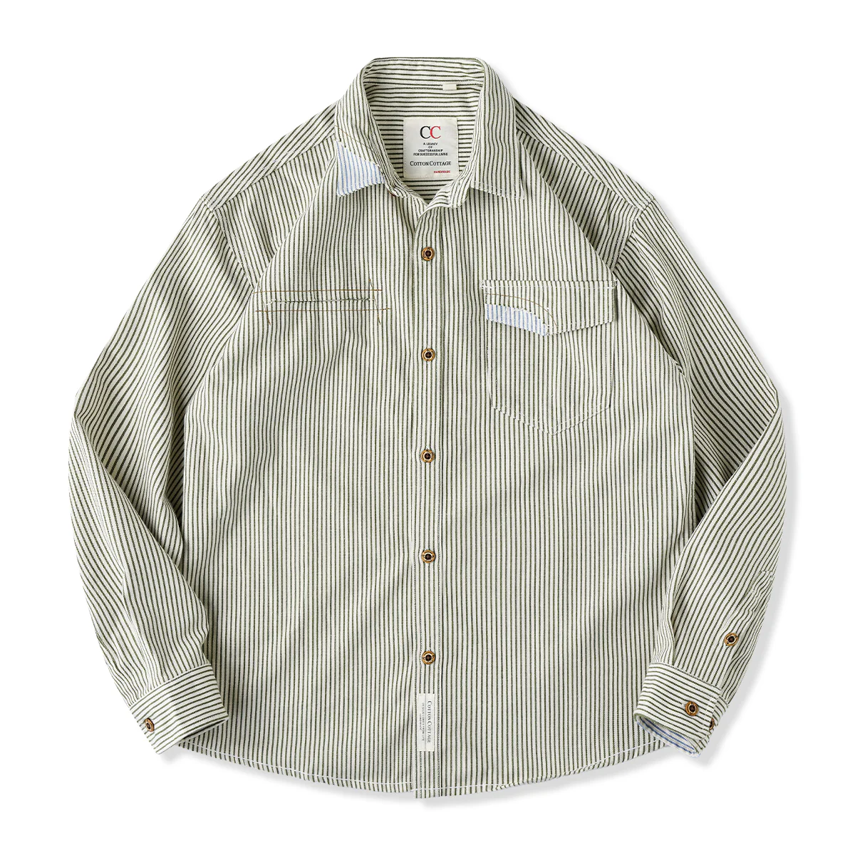 ユーズド風ボタン付き レトロ調ストライプ柄ジャカード織りワークシャツ