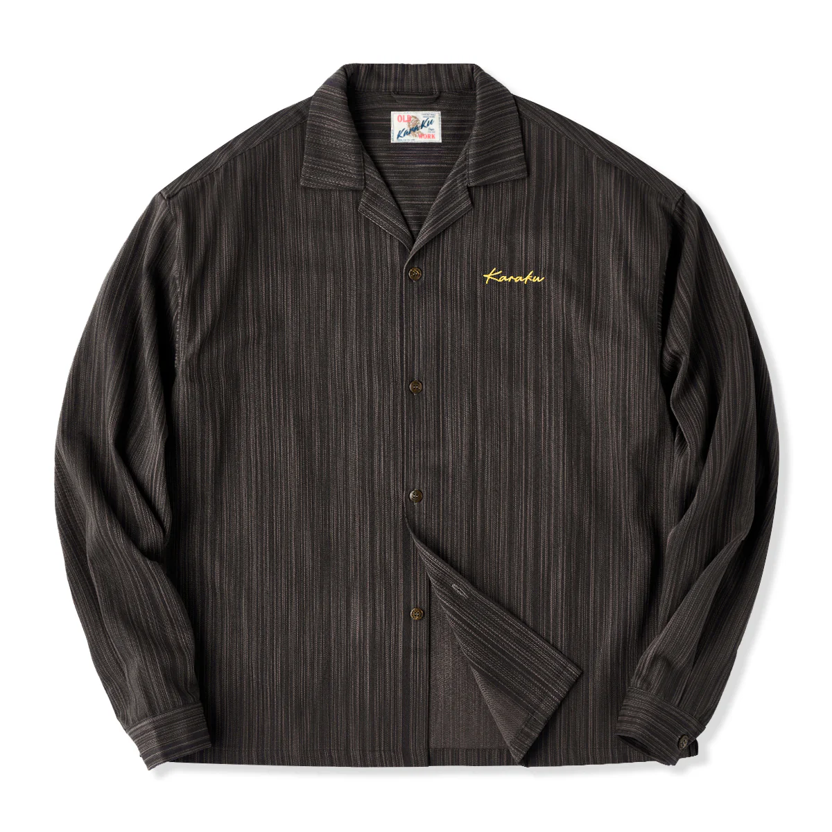 「Karaku」刺繍入り ストライプジャカード織りオープンカラーシャツ