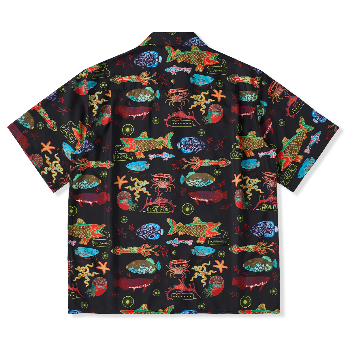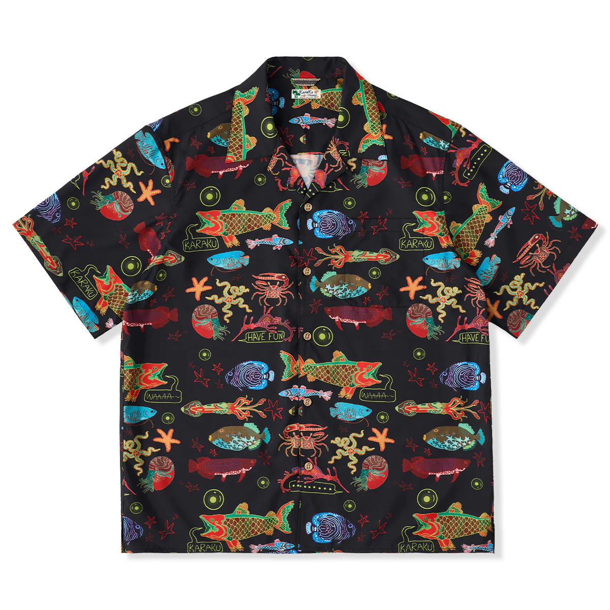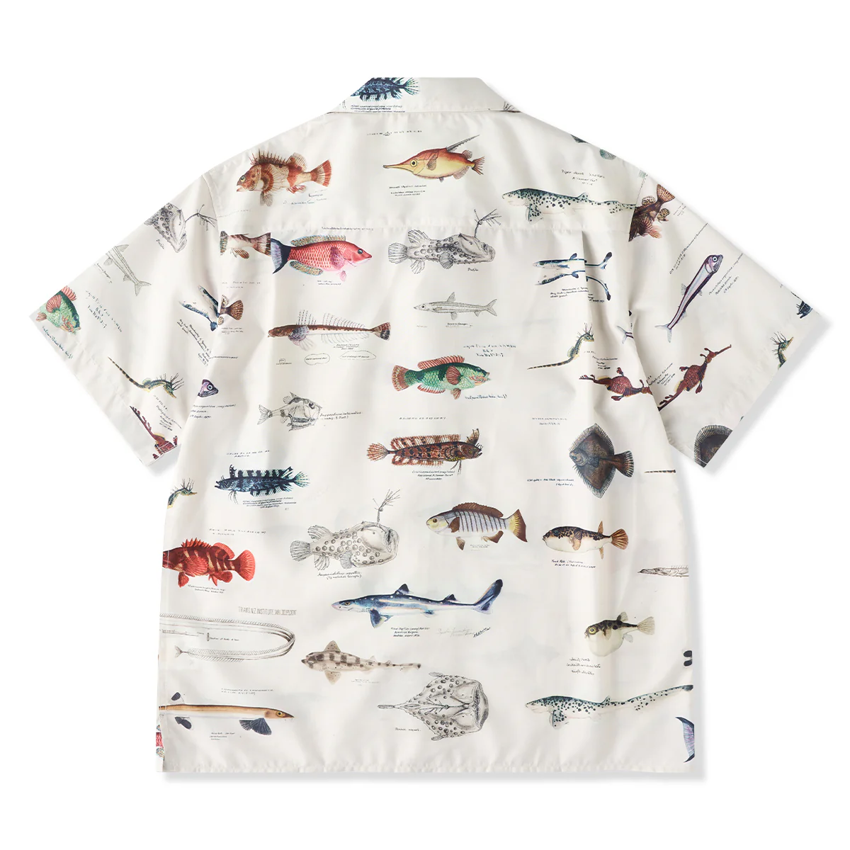 「博物図鑑・深海魚」総柄 パール調ボタン付きオープンカラーシャツ