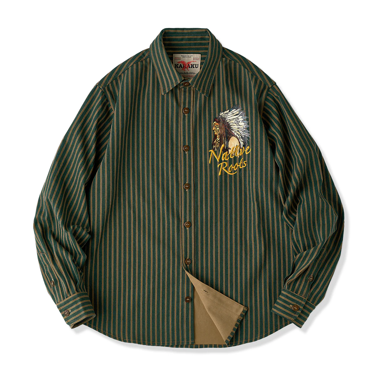 インディアン酋長プリント&刺繍入り ストライプ柄ヘビーウェイトオーバーシャツ