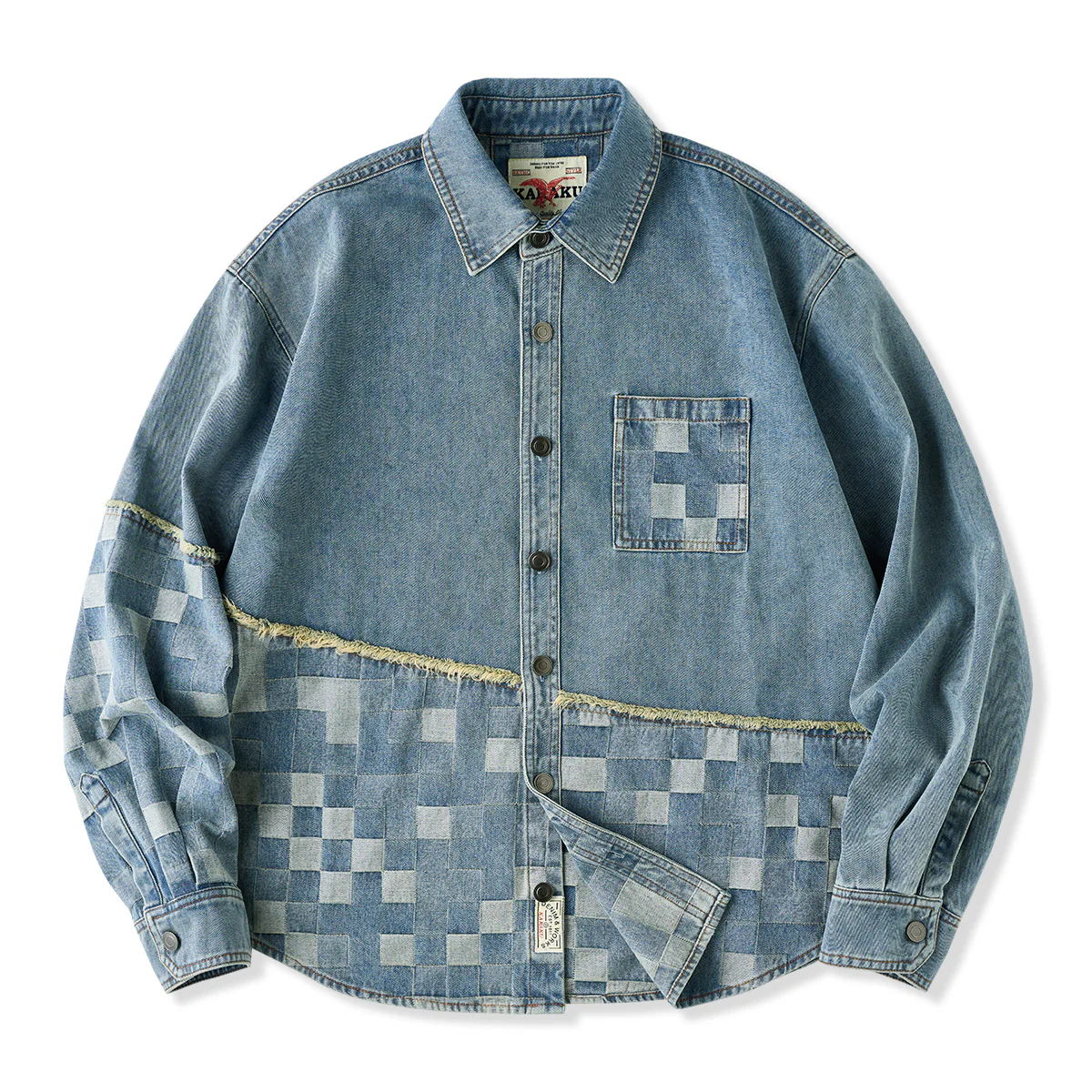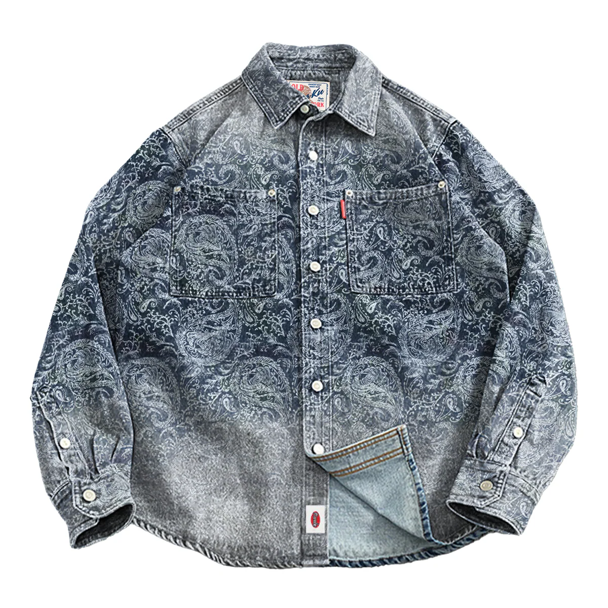 ジャガードペイズリー柄ユーズド加工デニムシャツ