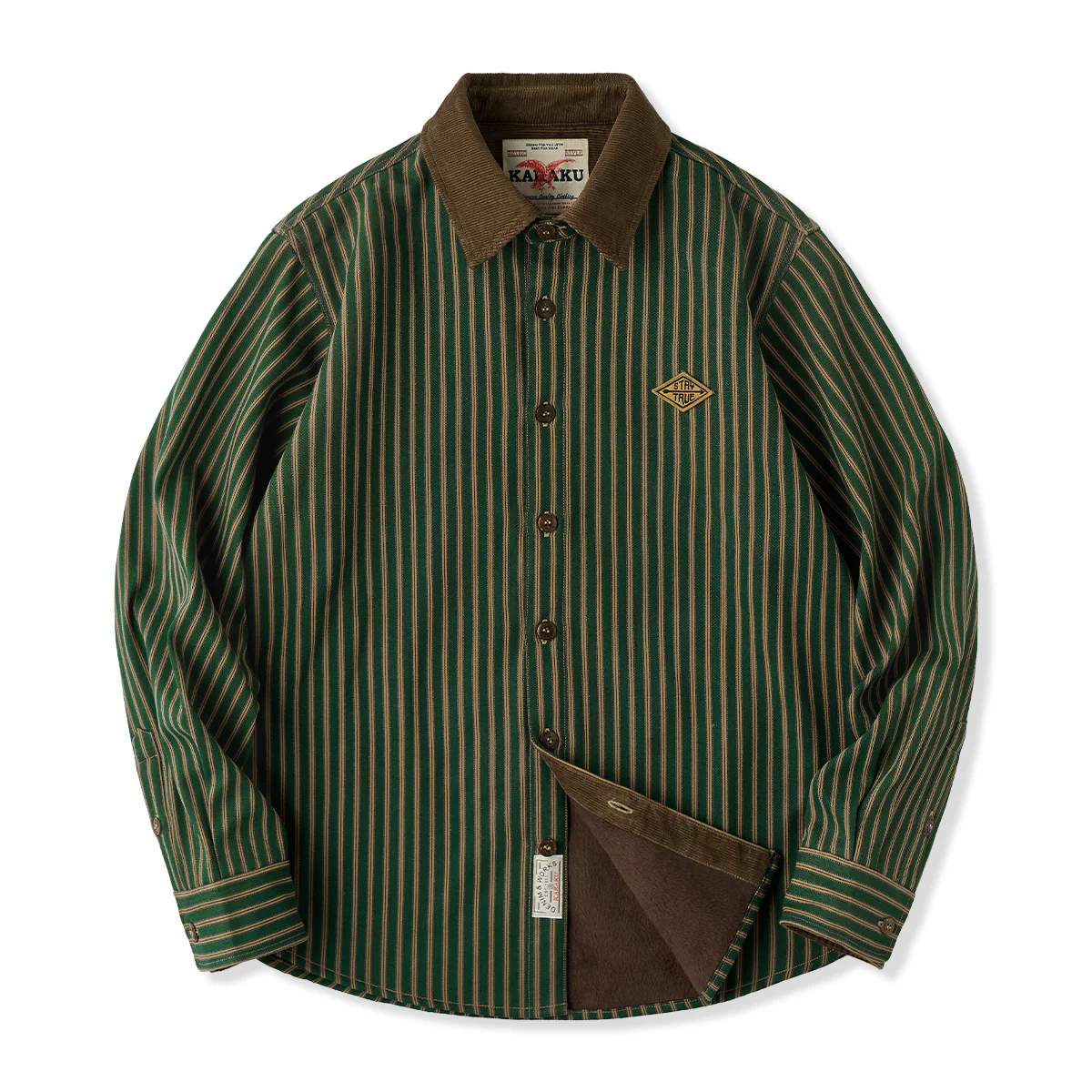 「STAY TRUE」刺繍ワッペン コーデュロイ切替裏フリースストライプシャツ