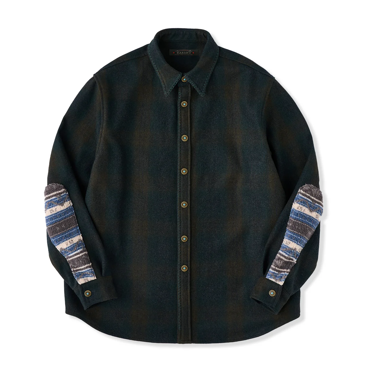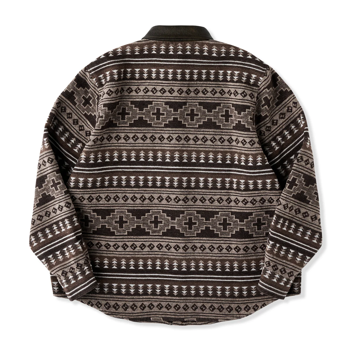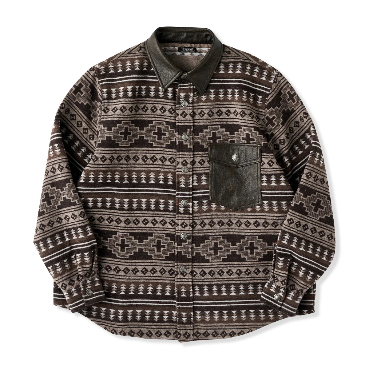 襟・ポケットレザーコンビ エスニック調ウール混ツイード長袖シャツ