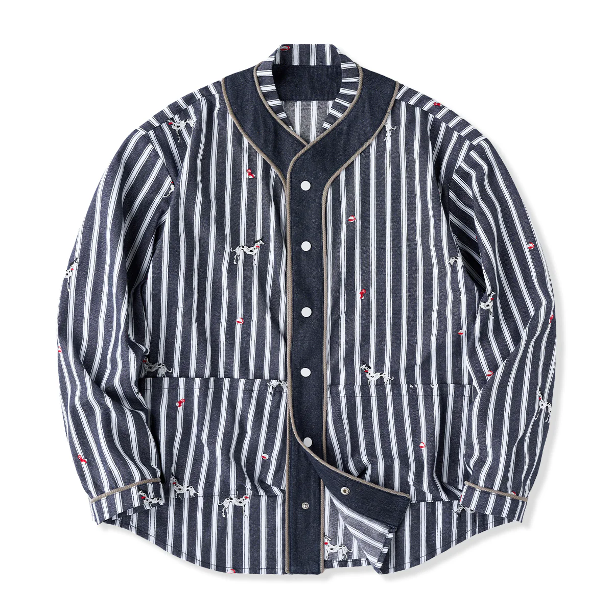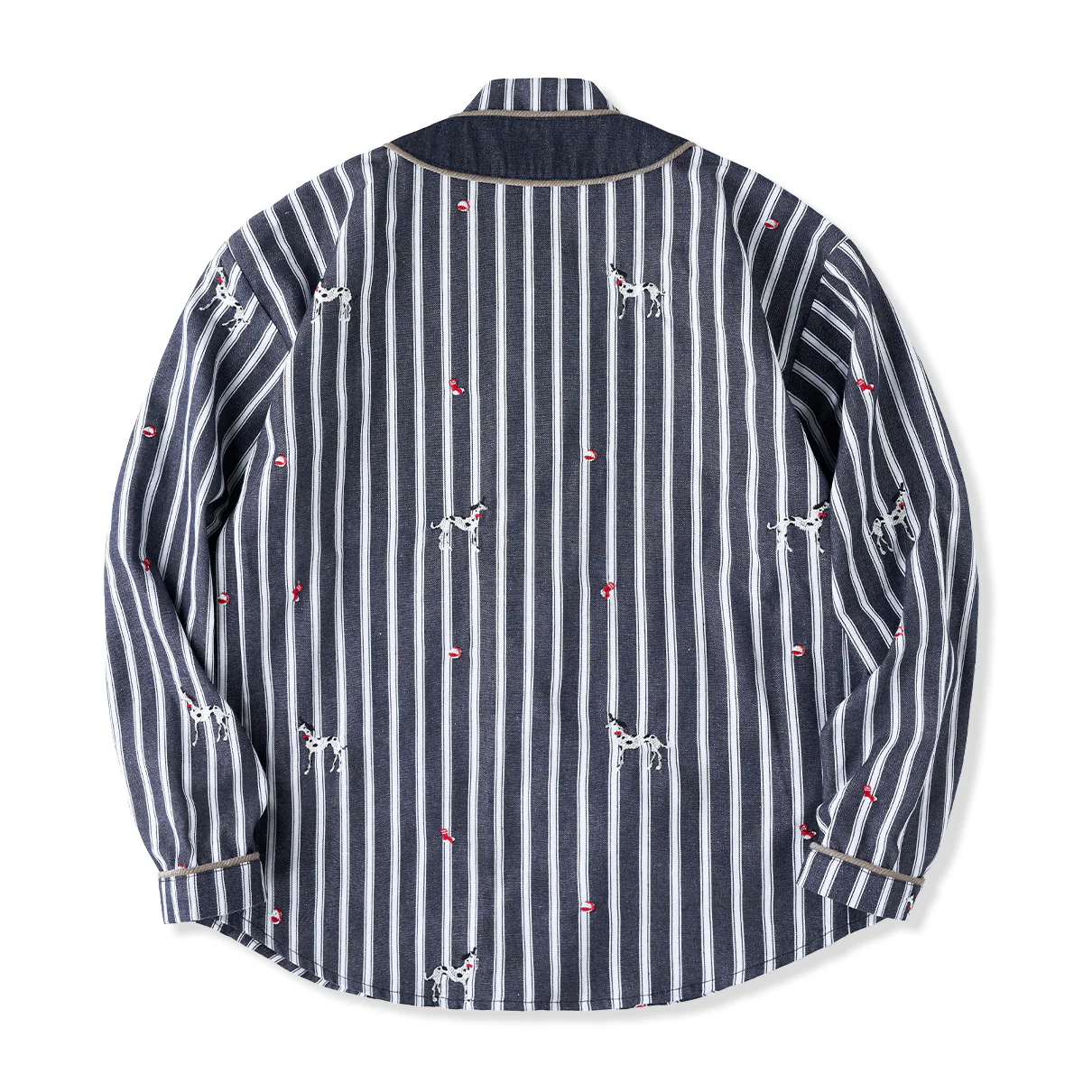 「ジェントルマンパピー」刺繍入り デニム切替ストライプベースボールカラーシャツ