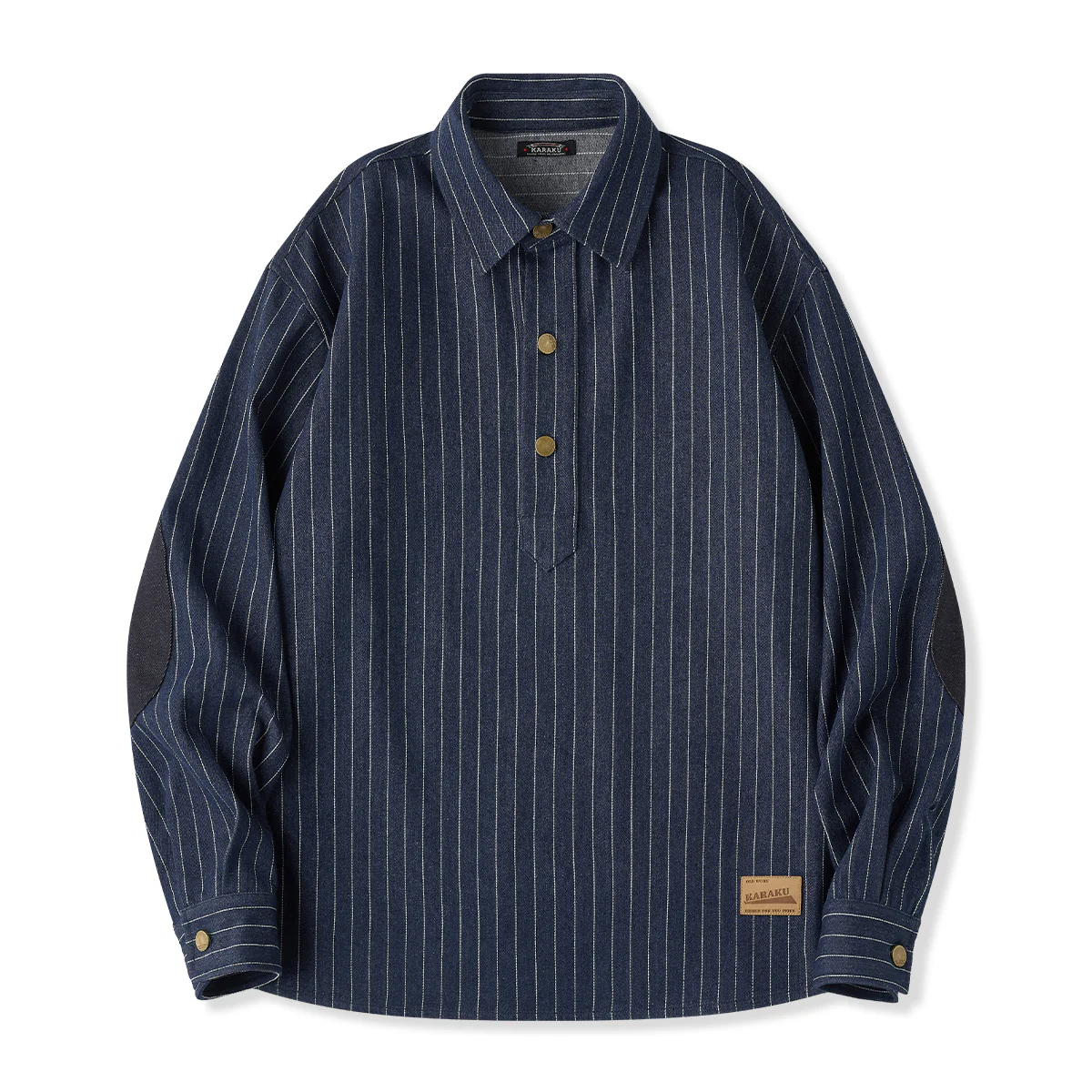肘パッチ入り ハーフボタン付きストライプ柄デニムプルオーバーシャツ
