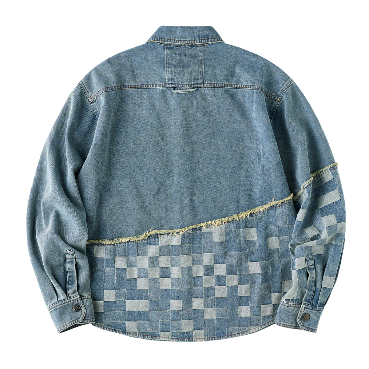 再構築 ギンガムチェック柄切替フリンジ加工デニムシャツ