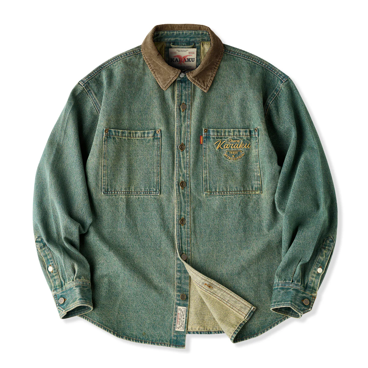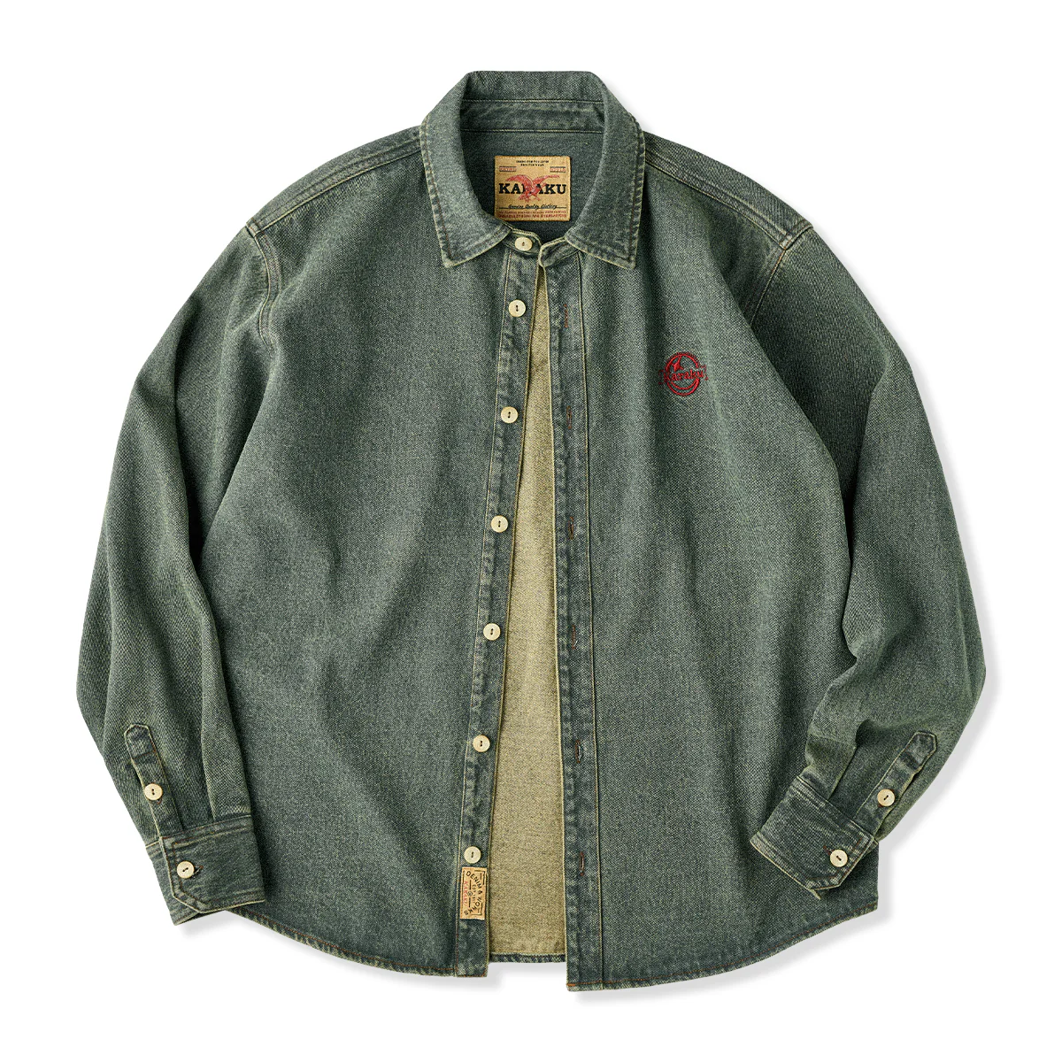 「KARAKU」ロゴ刺繍入り ウォッシュデニム長袖シャツ