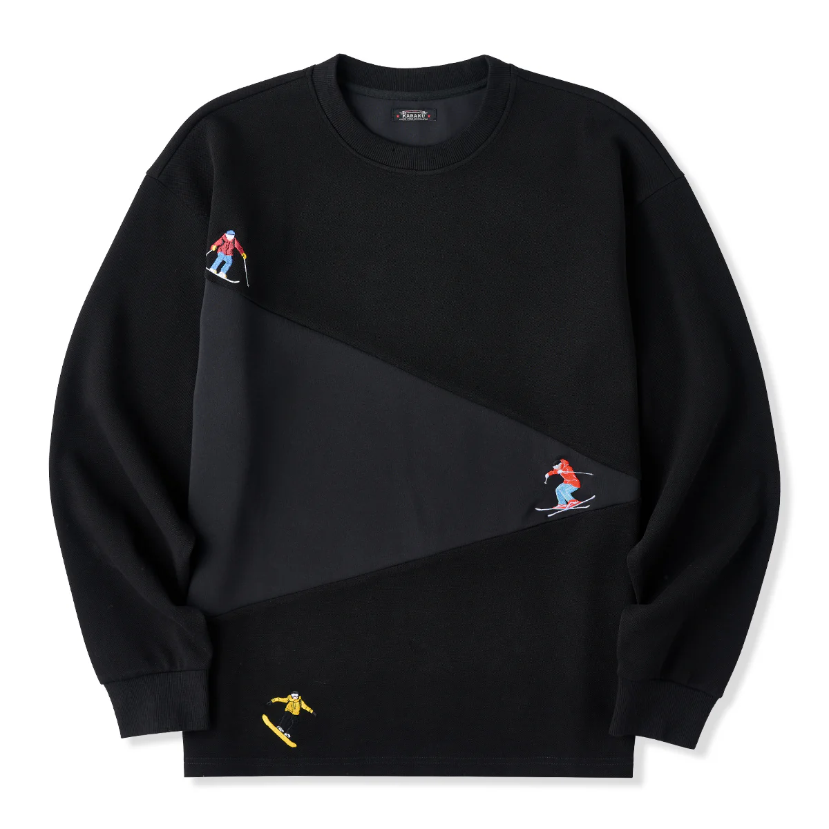 「雪山のスキーヤー」刺繍入り綿混紡切替長袖Tシャツ
