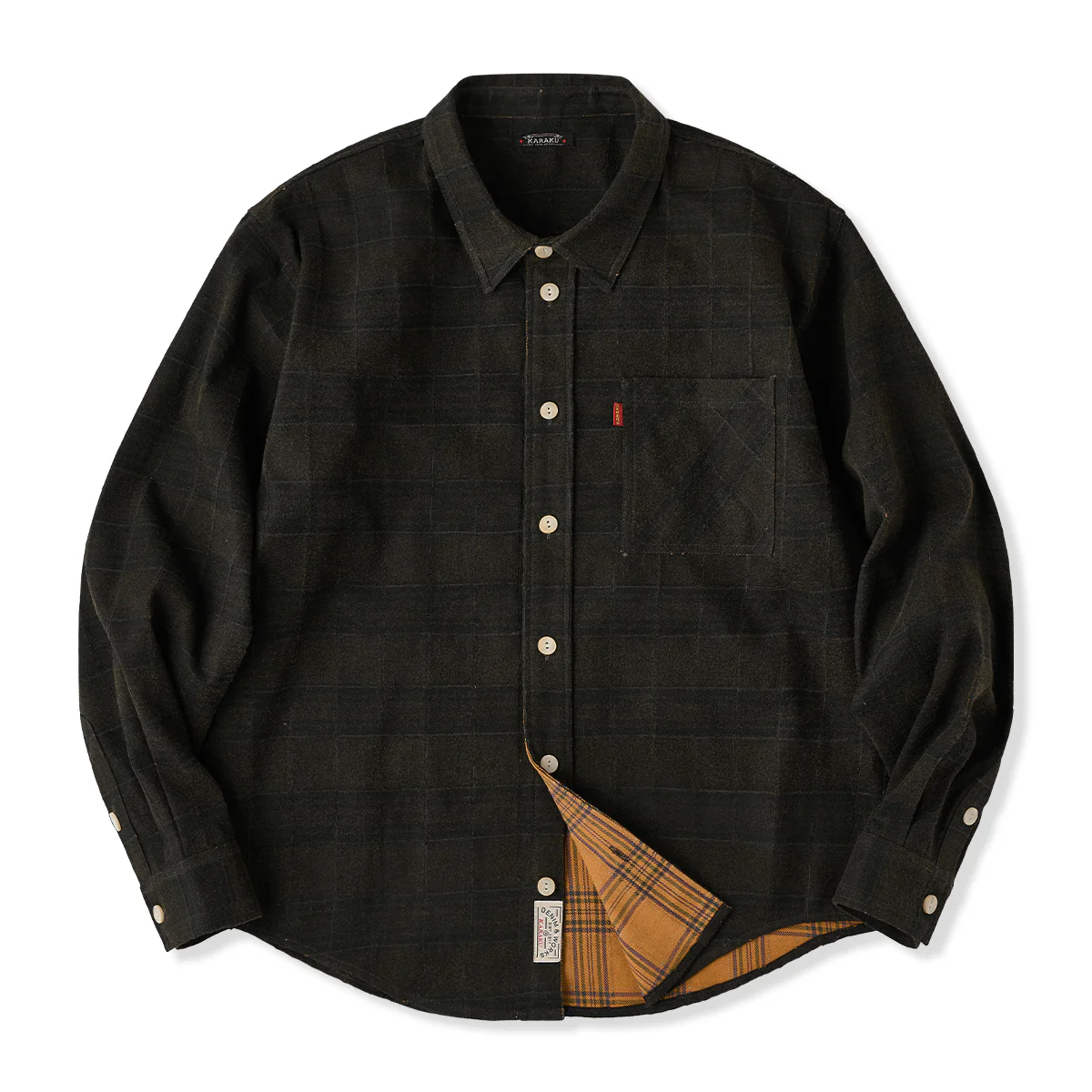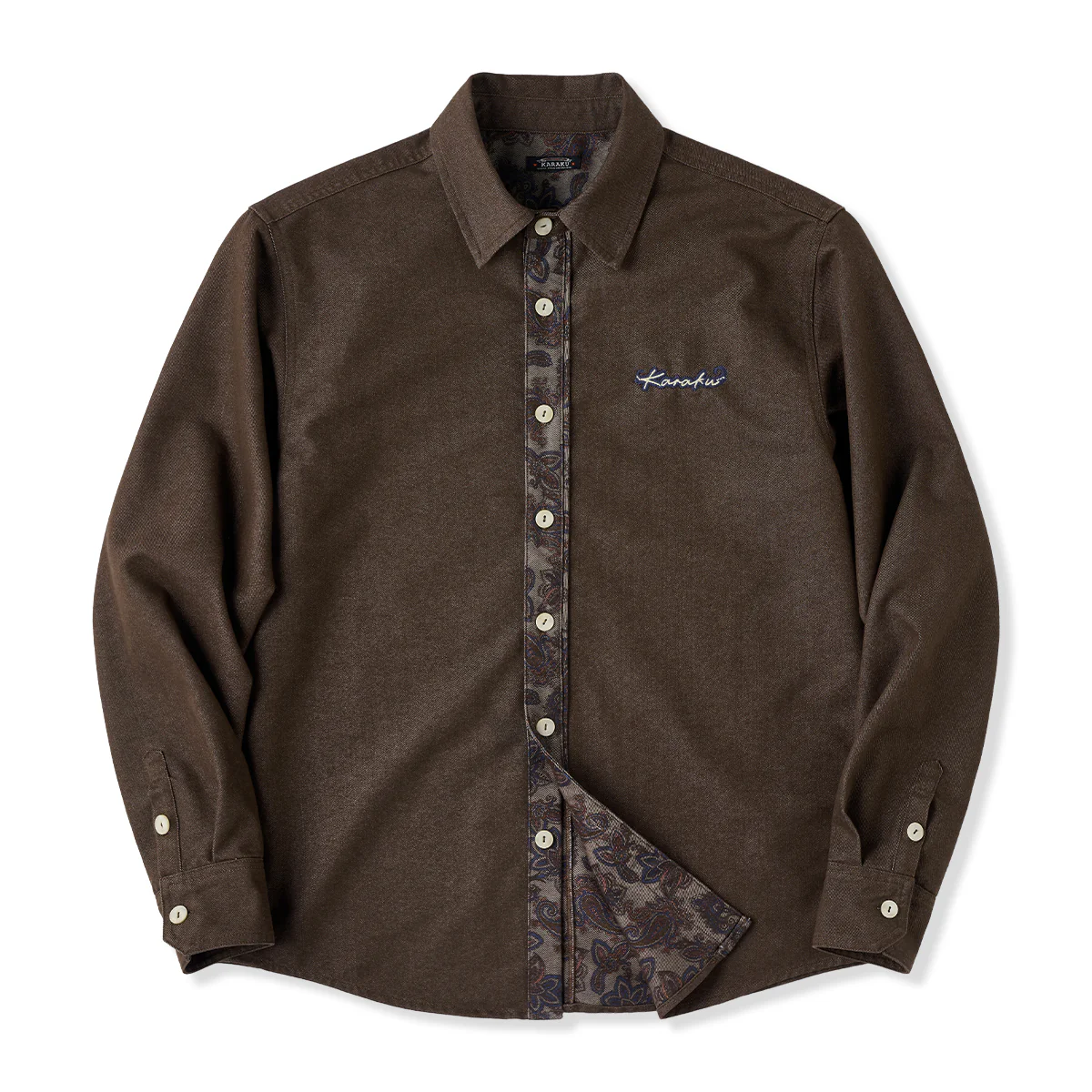 「Karaku」ロゴ刺繡入り 裏ペイズリー柄デニム長袖シャツ
