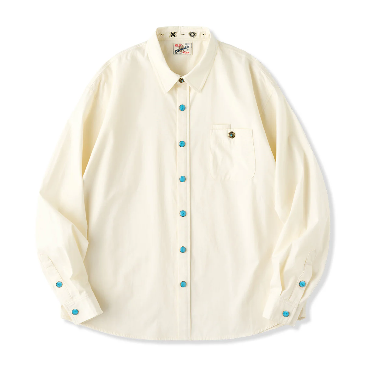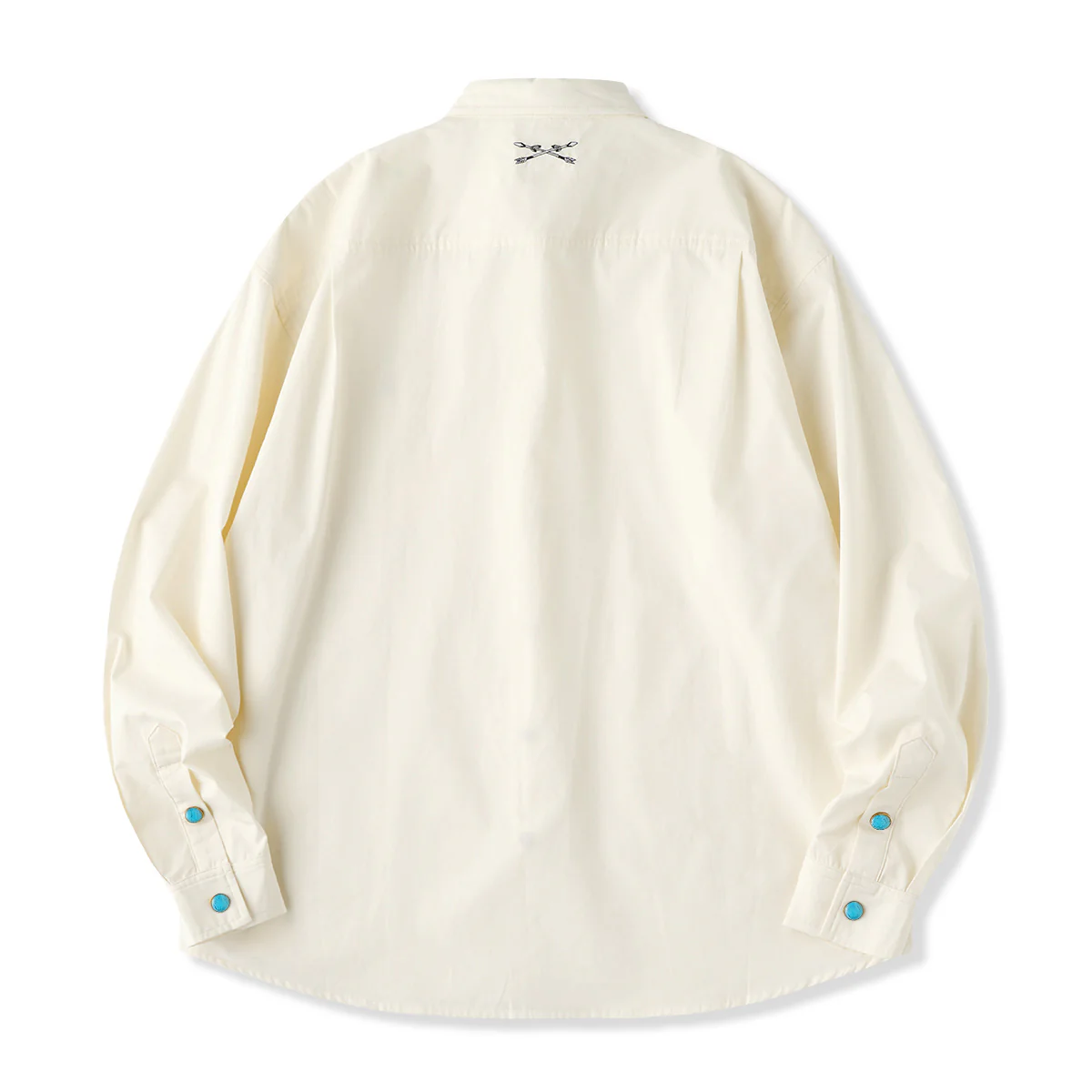 ワンポイント刺繍 ターコイズ風ボタン付き長袖シャツ