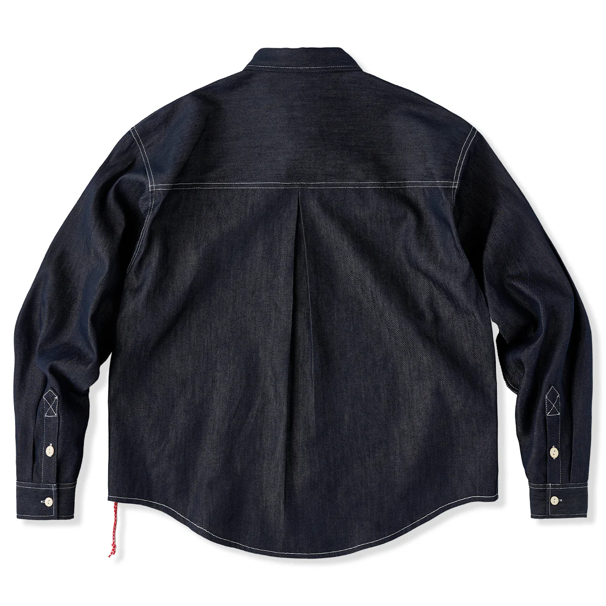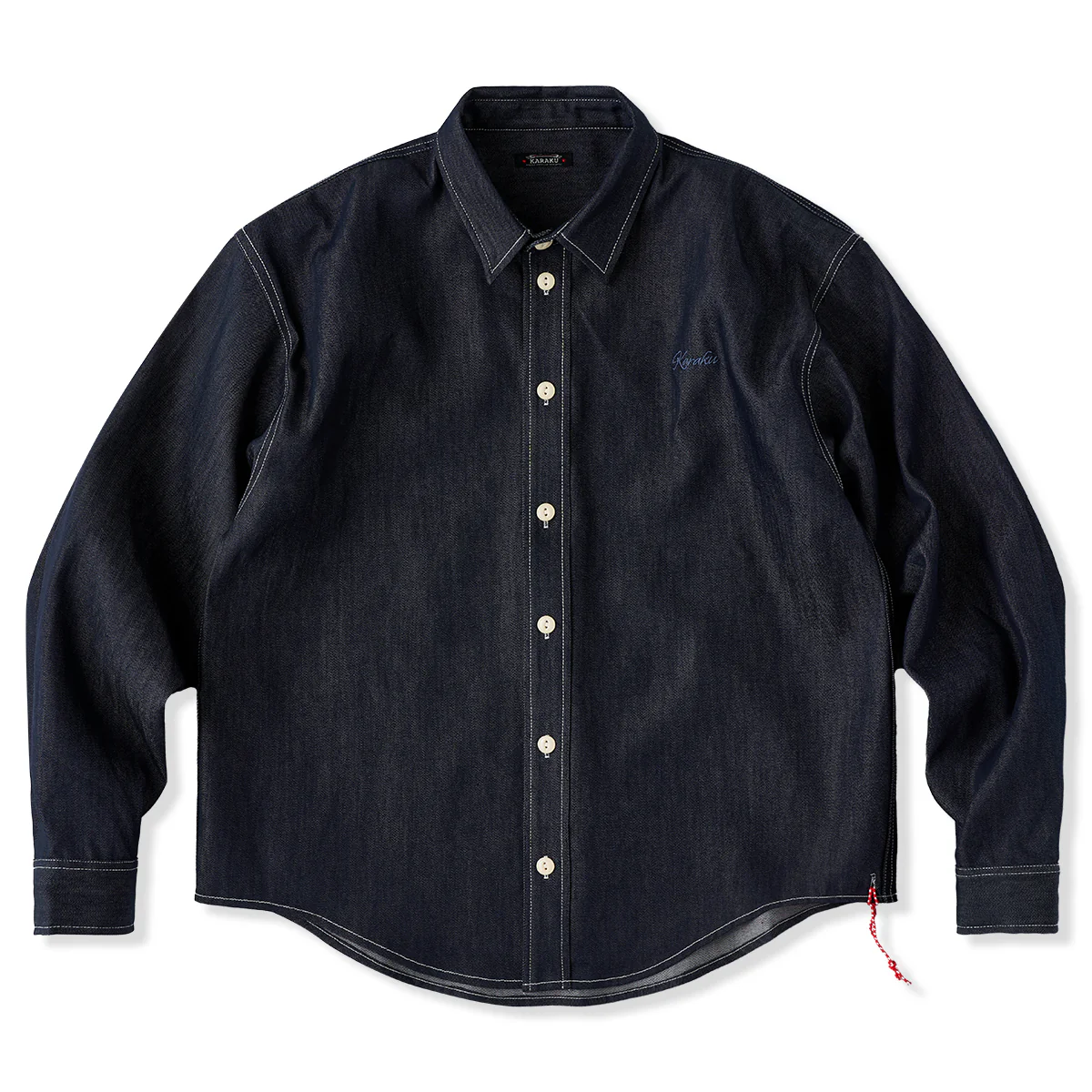 赤ヒモ付き 「Karaku」刺繍入りホワイトステッチデニムシャツ