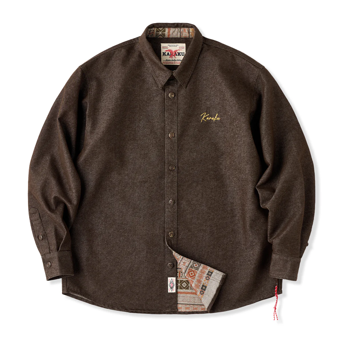 赤ヒモ付き 「Karaku」刺繡ロゴ 裏エスニック調柄デニム長袖シャツ
