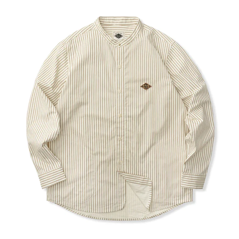 「STAY TRUE」刺繍ワッペン コーデュロイ切替裏フリースストライプシャツ