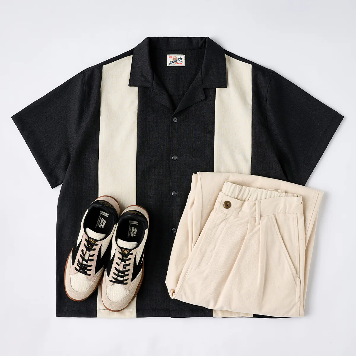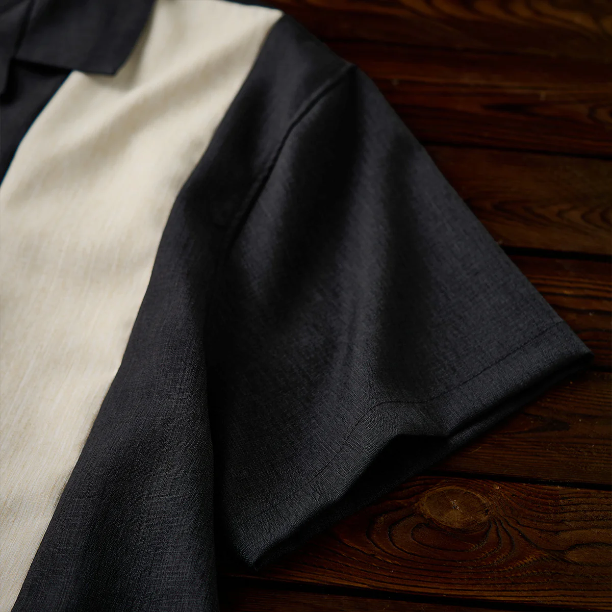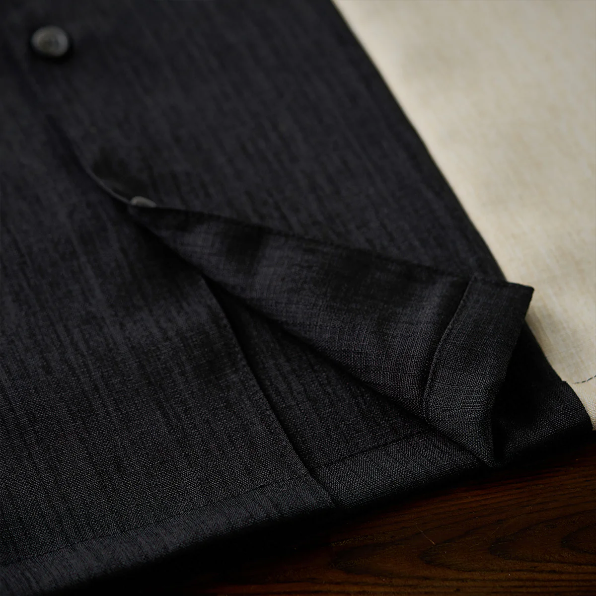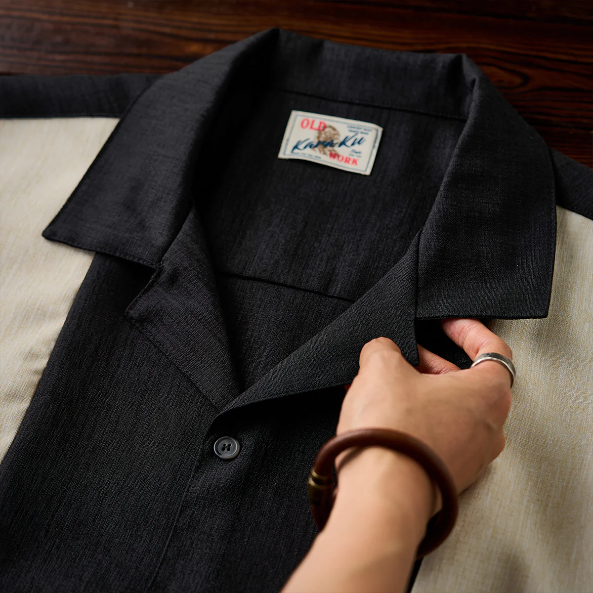 本アイテムは異素材コンビで仕上げられに加え、一番目立つのはフロントに黒と白でパッチワークデザイン、質感もテキスチャーも綺麗に現れ、スペシャル感とビンテージ感を兼ね備える。経糸と緯糸を2本ずつ引き揃えて織る、経糸にベージュ色、横糸に白を使用した生地。糸染め織物による軽さと柔らかさをもつ生地で、独特な霜降り感と光沢感が特長。発色を抑えたカラーバランスがとてもいい雰囲気で、先染め特有の立体感や奥行き感も手伝ってレギュラー生地には見られないような魅力があります。平織手法をナチュラルリネンのタッチを残す為に柔らかく生地になじむ加工、ウォッシュ加工でヴィンテージの風合いを演出。快適で通気性、サクサク感、トレンディなレトロスタイルを作りやすく、デイリーユースからアウトドアスタイルまで幅広くご使用頂けます。