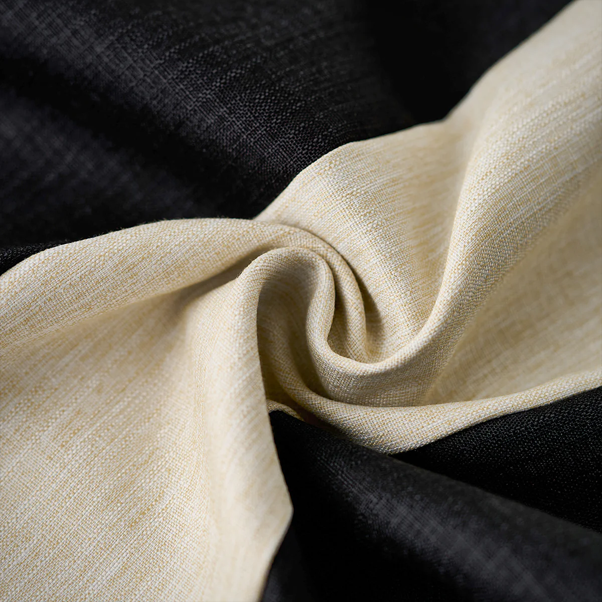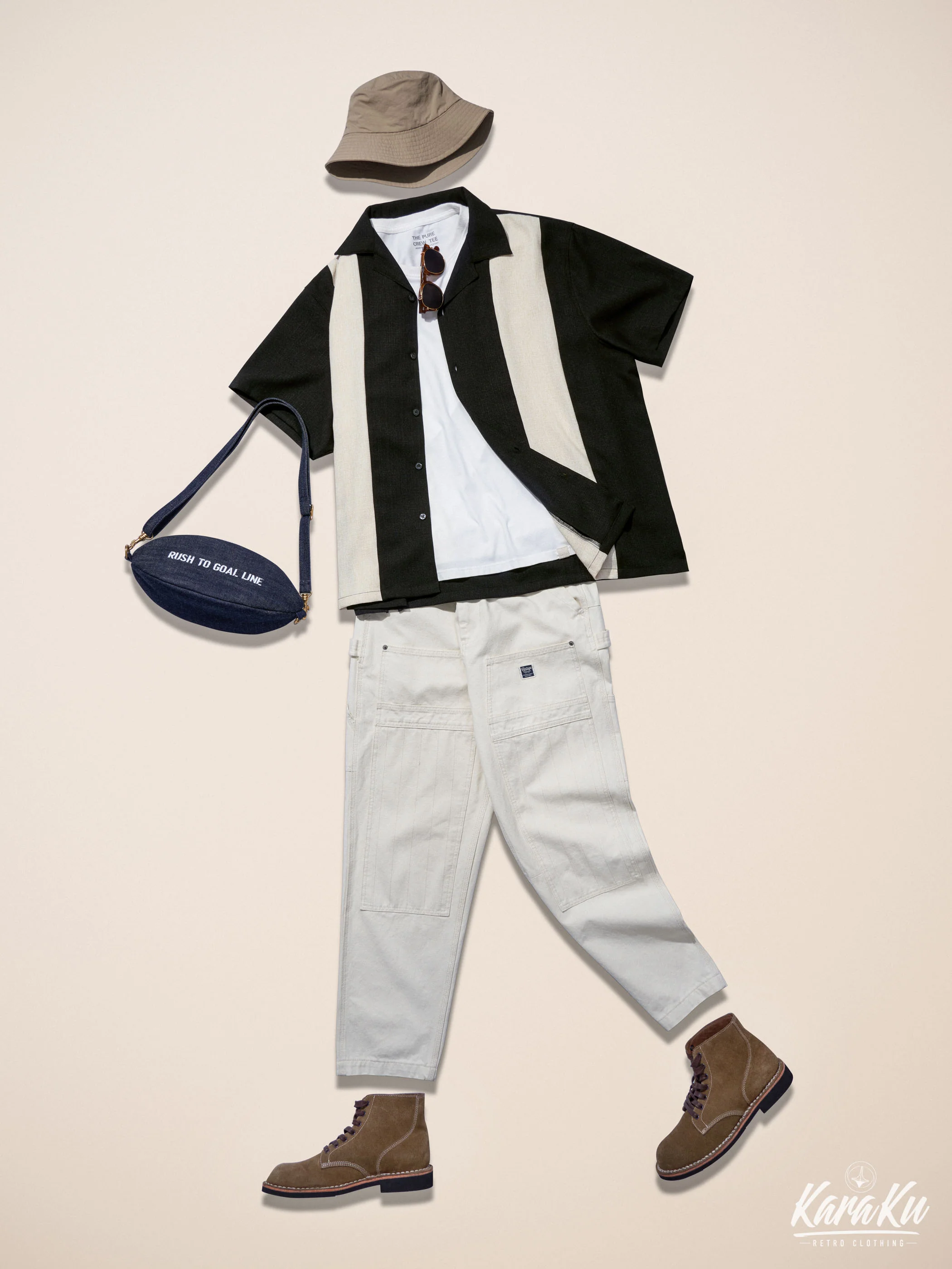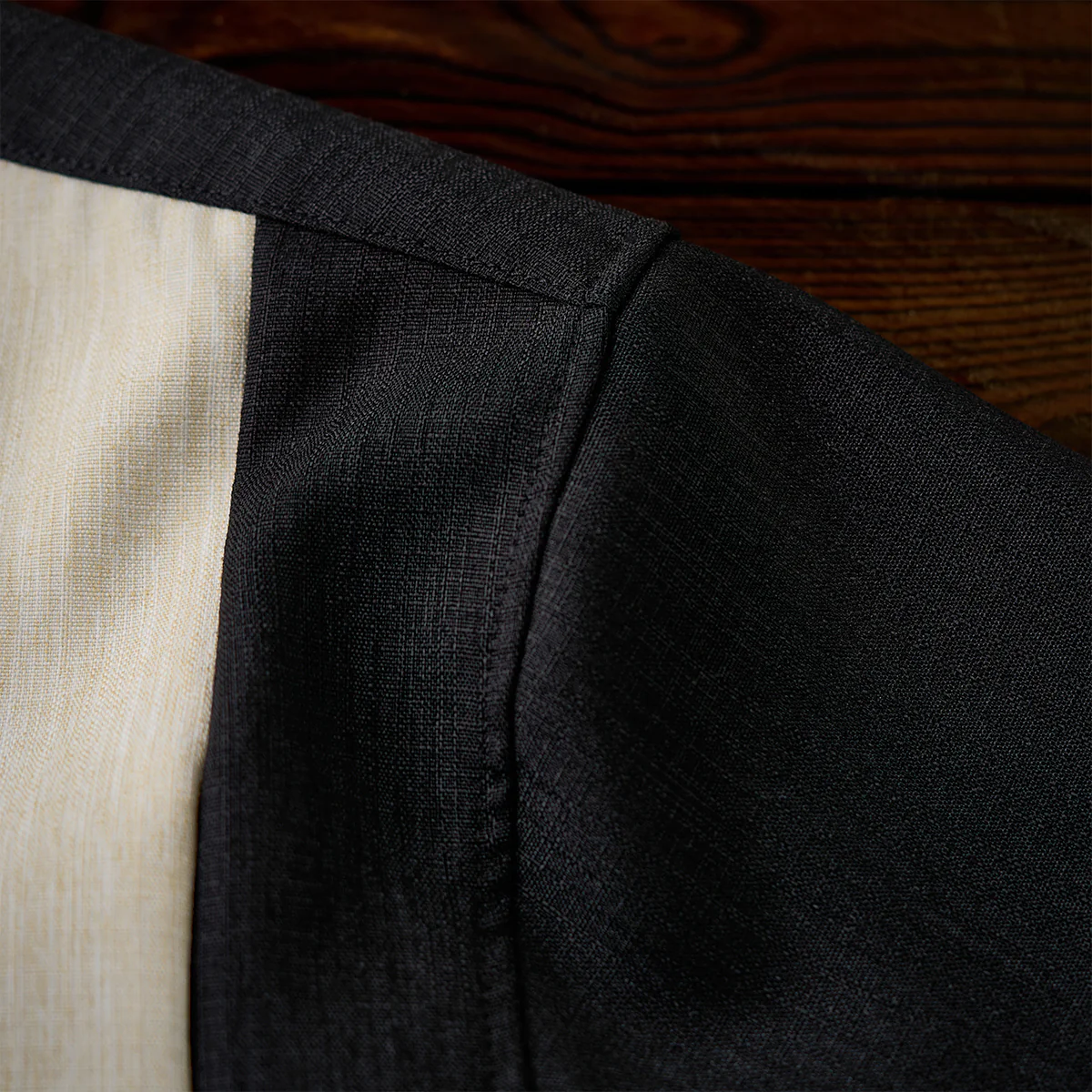 本アイテムは異素材コンビで仕上げられに加え、一番目立つのはフロントに黒と白でパッチワークデザイン、質感もテキスチャーも綺麗に現れ、スペシャル感とビンテージ感を兼ね備える。経糸と緯糸を2本ずつ引き揃えて織る、経糸にベージュ色、横糸に白を使用した生地。糸染め織物による軽さと柔らかさをもつ生地で、独特な霜降り感と光沢感が特長。発色を抑えたカラーバランスがとてもいい雰囲気で、先染め特有の立体感や奥行き感も手伝ってレギュラー生地には見られないような魅力があります。平織手法をナチュラルリネンのタッチを残す為に柔らかく生地になじむ加工、ウォッシュ加工でヴィンテージの風合いを演出。快適で通気性、サクサク感、トレンディなレトロスタイルを作りやすく、デイリーユースからアウトドアスタイルまで幅広くご使用頂けます。