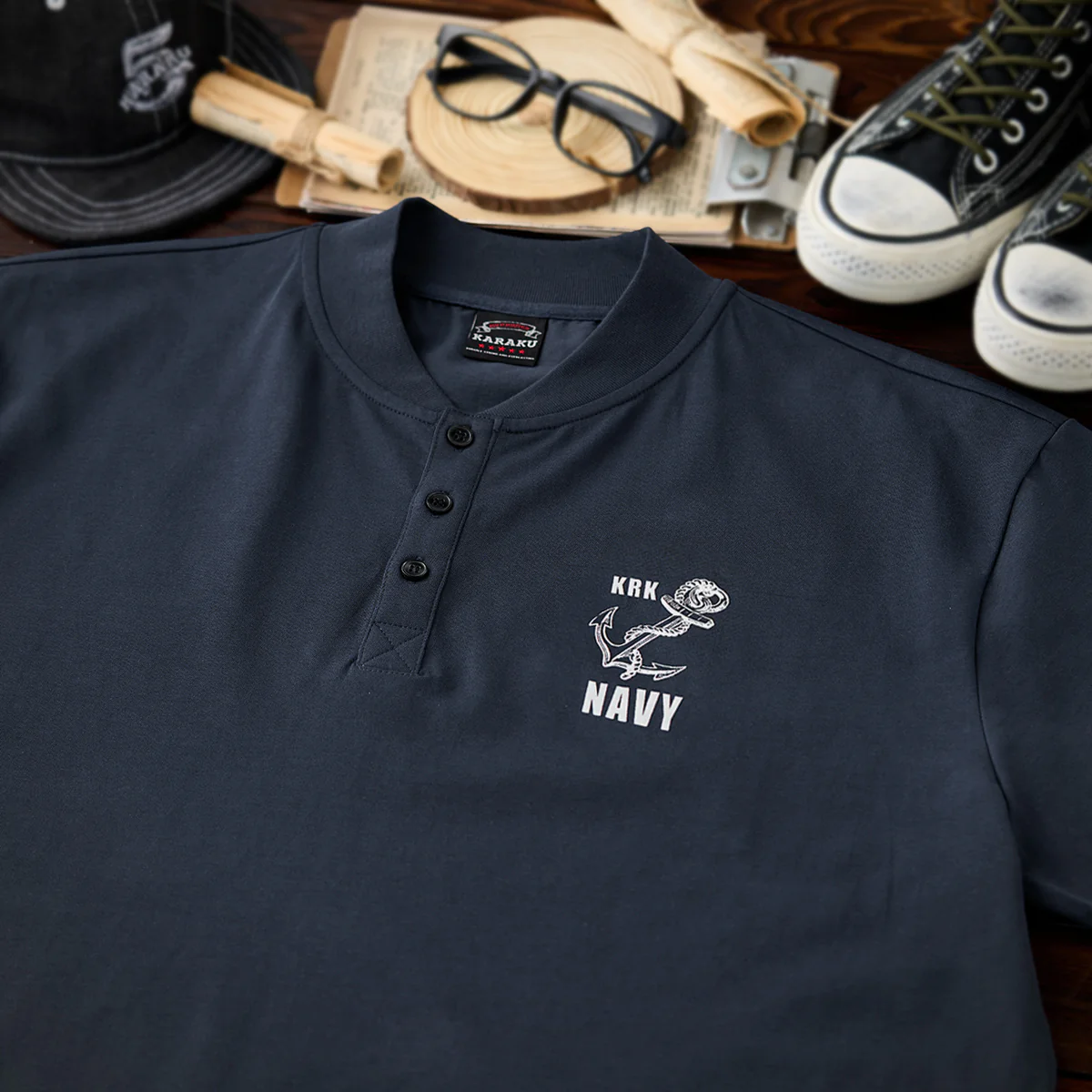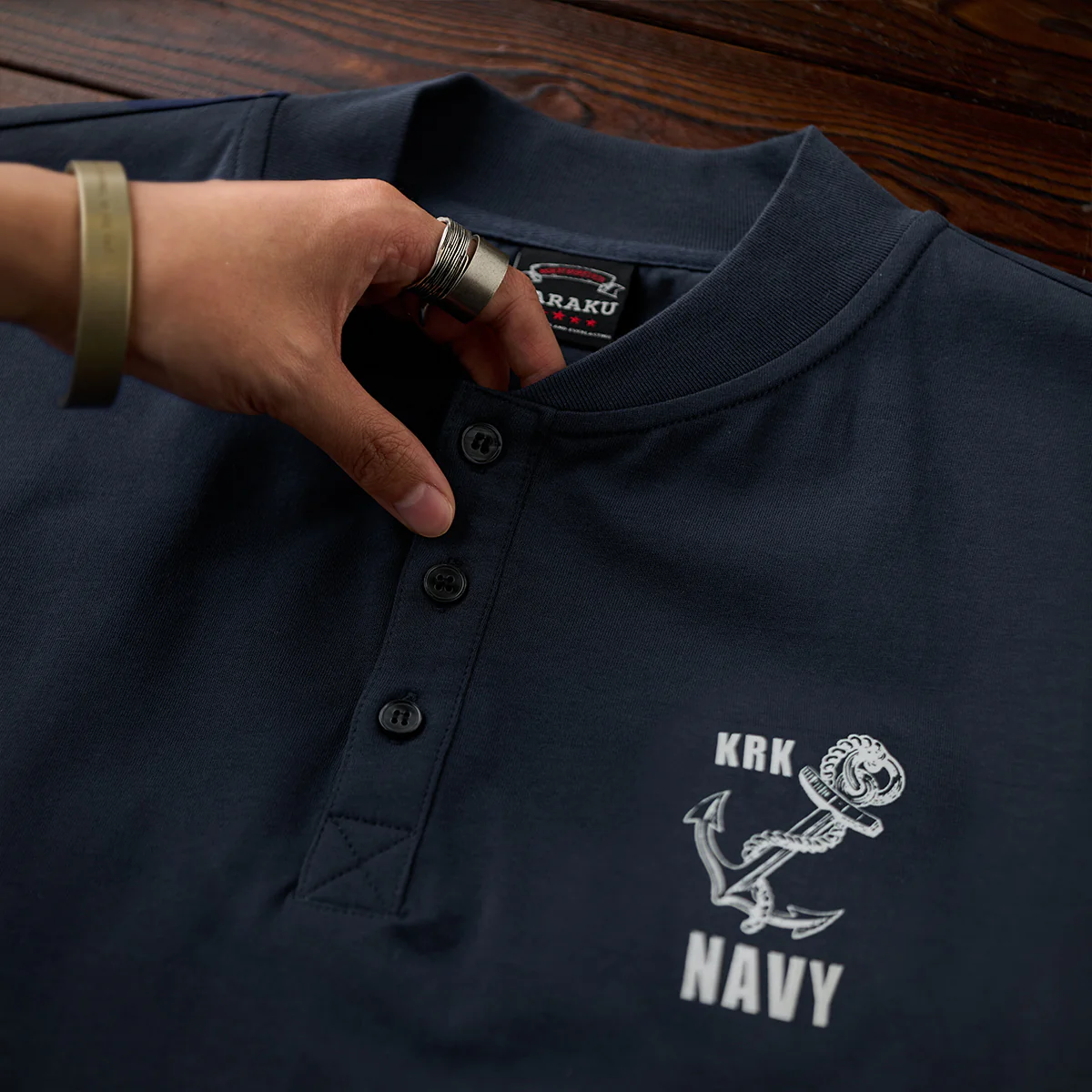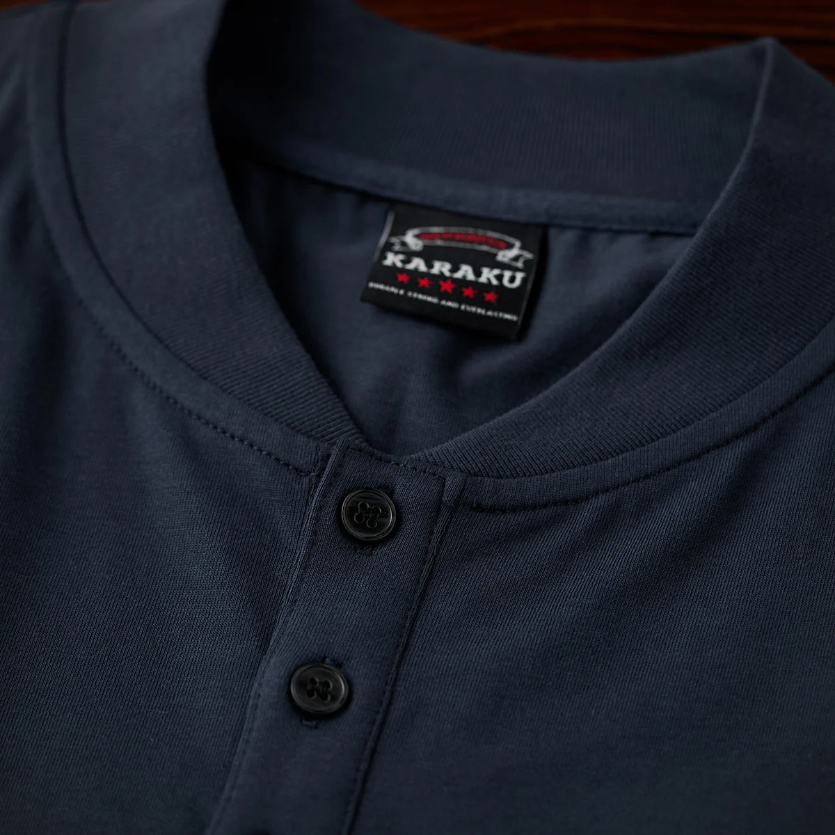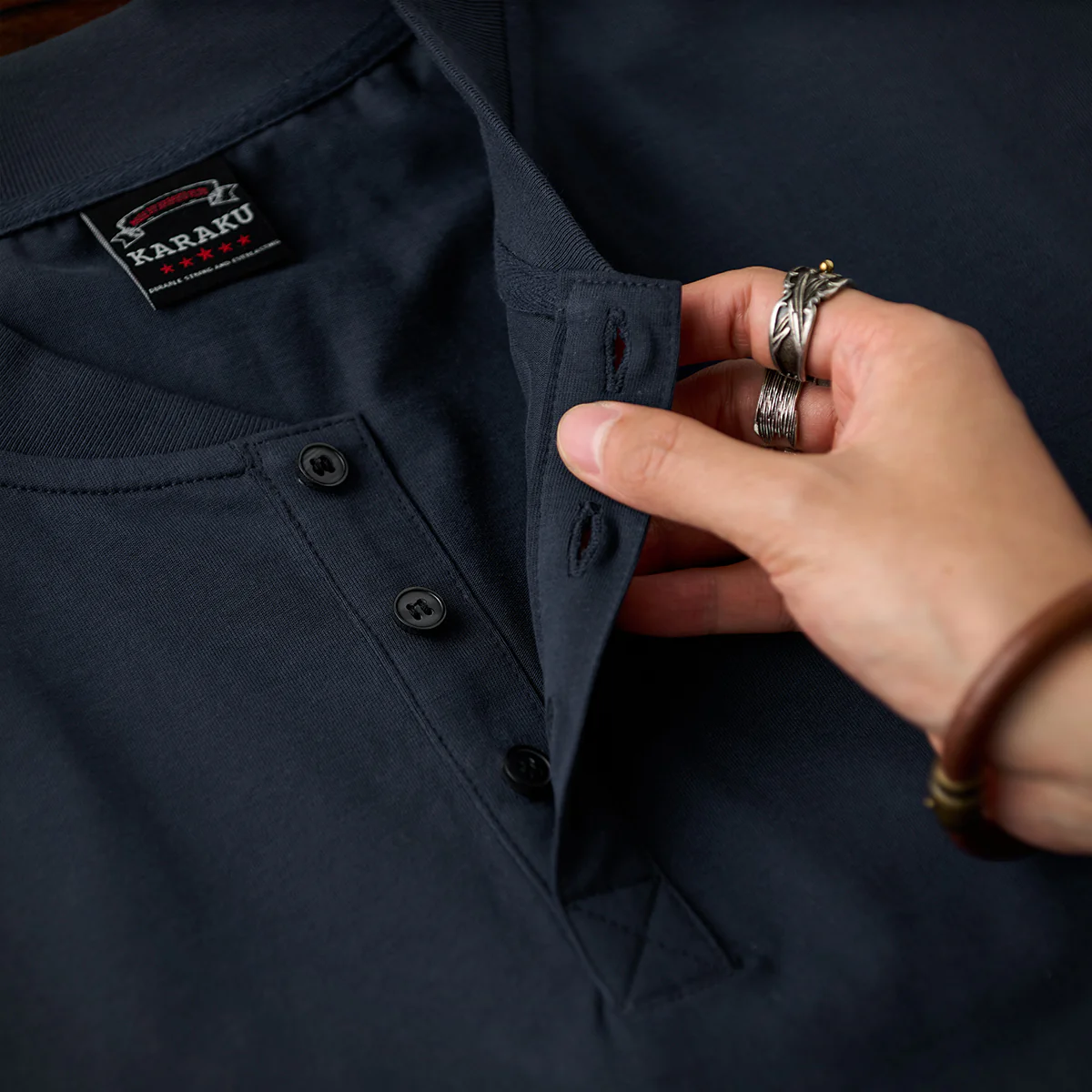 ヘンリーネックと呼ばれる特徴的な首元のスタイルで、襟が3ボタンで閉じられるデザインで、スタイリッシュで洗練された外観を与える。