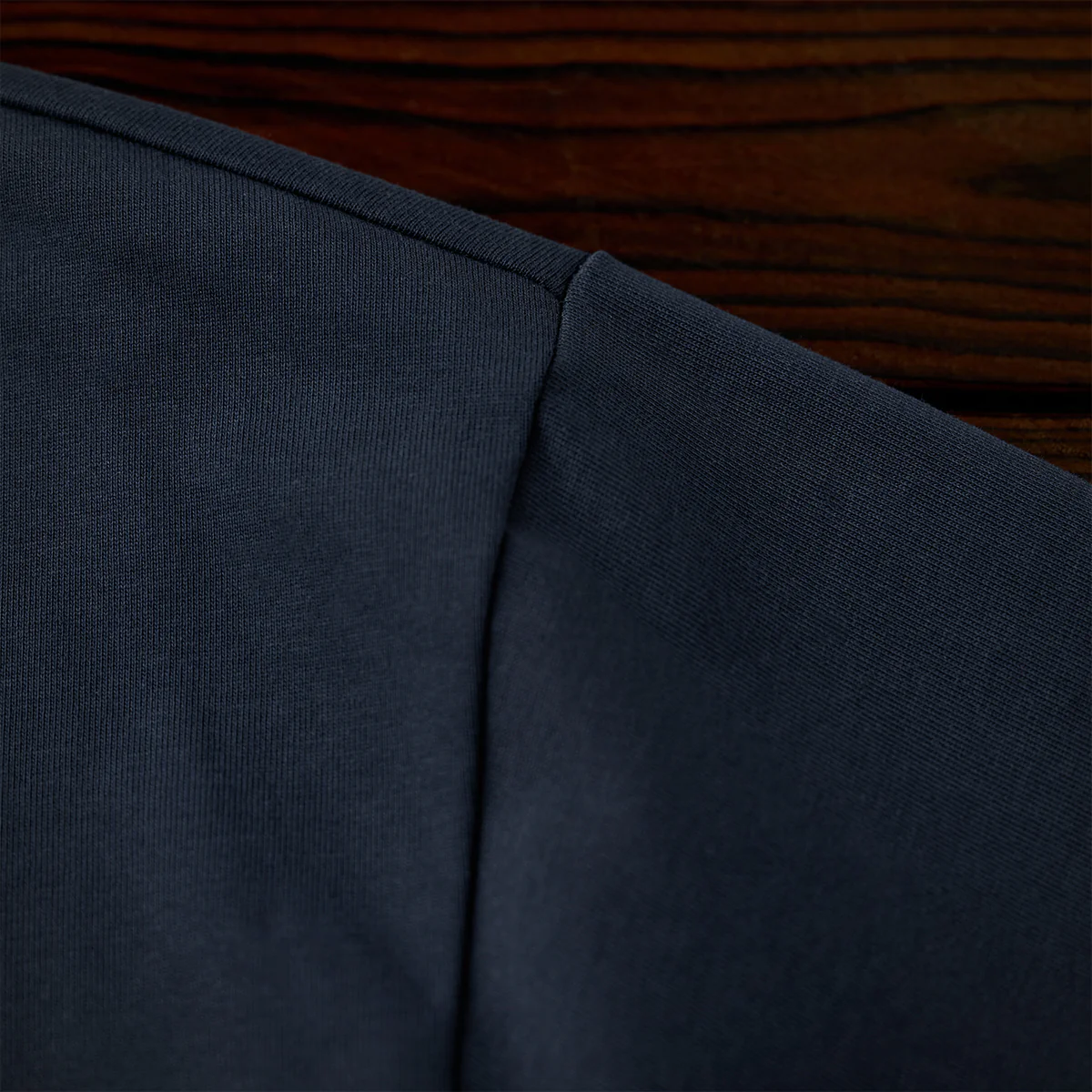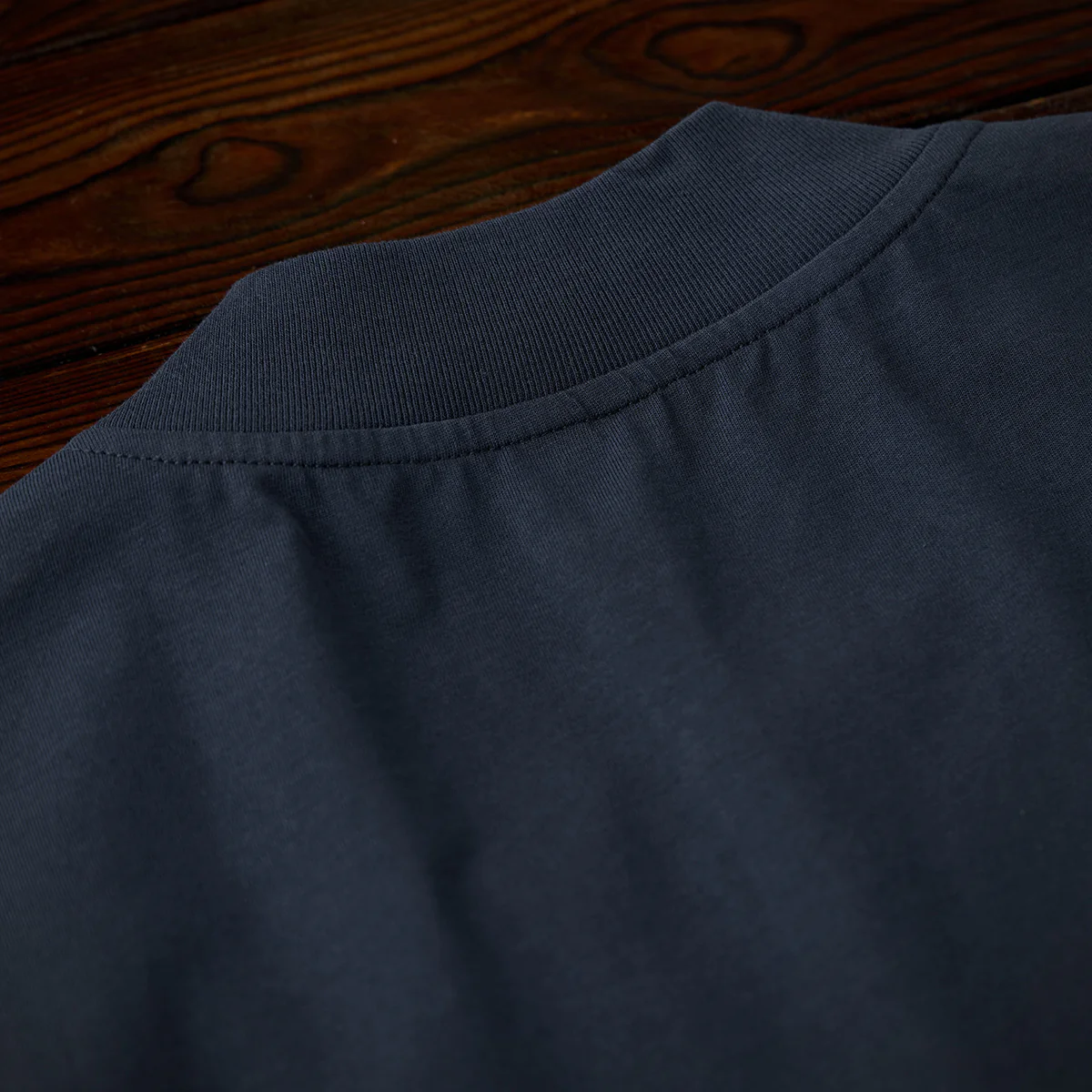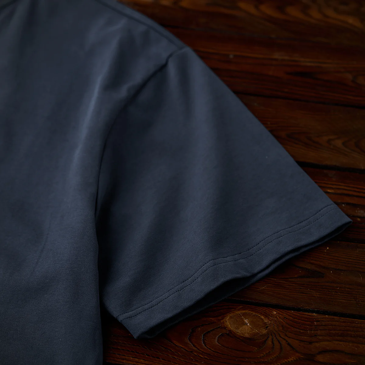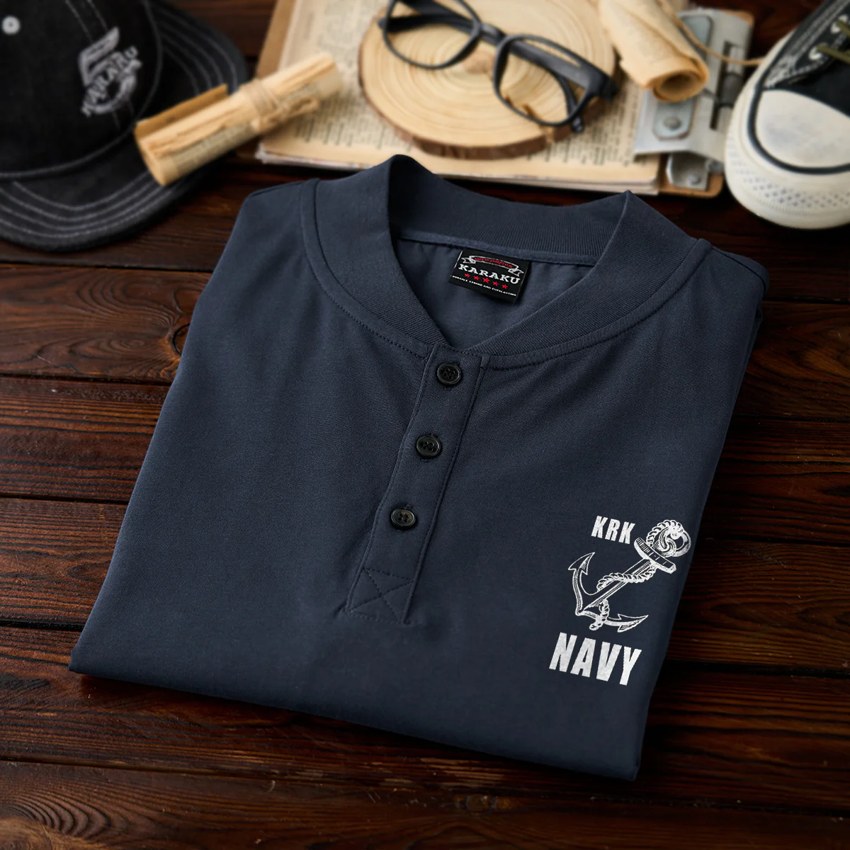ヘンリーネックと呼ばれる特徴的な首元のスタイルで、襟が3ボタンで閉じられるデザインで、スタイリッシュで洗練された外観を与える。