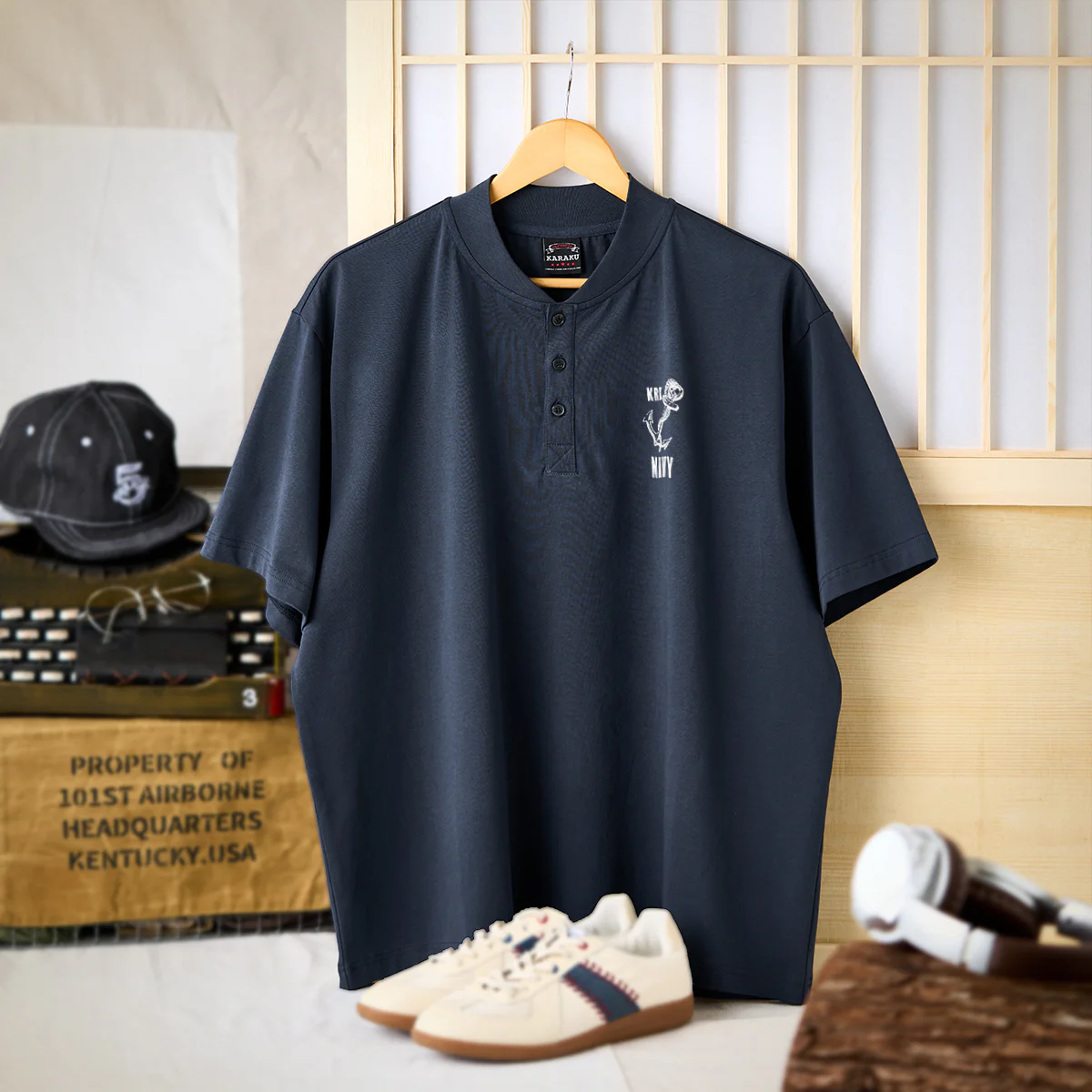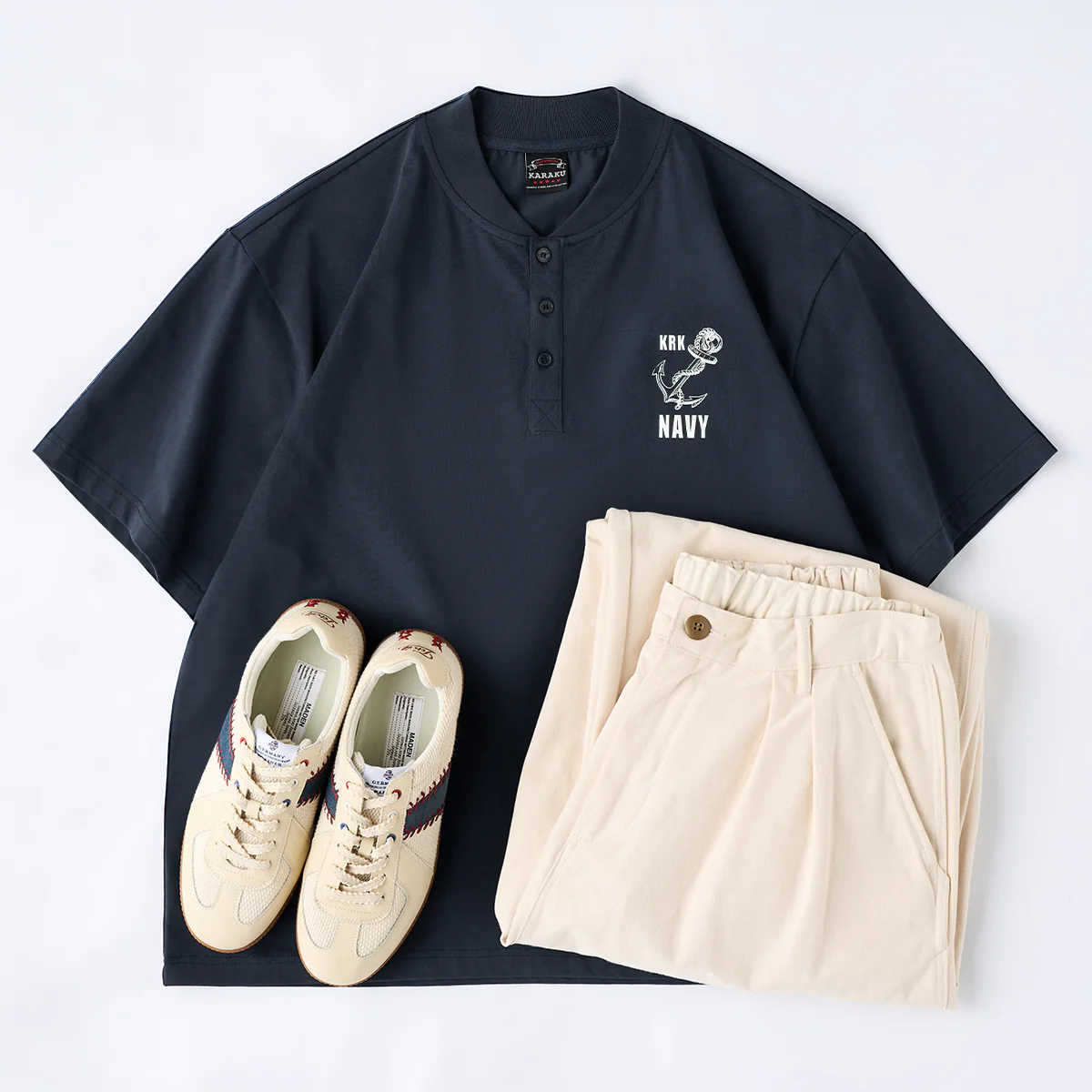 左胸に錨プリントがポイント、船をイカリで固定することから、安定・力・希望の象徴。人生の荒波から身を守るアイテム、商売繁盛のモチーフとされている。