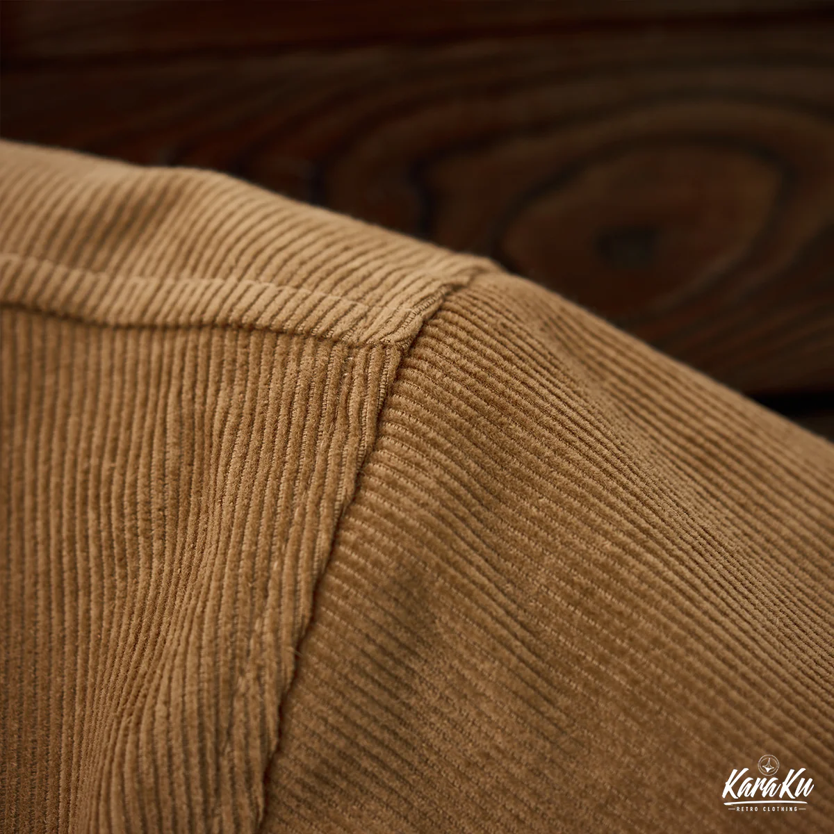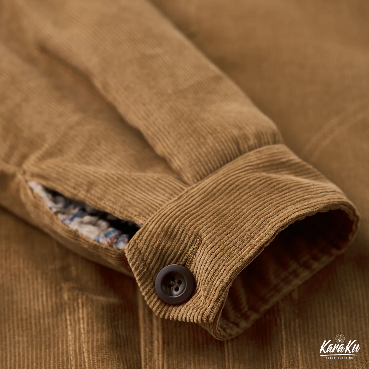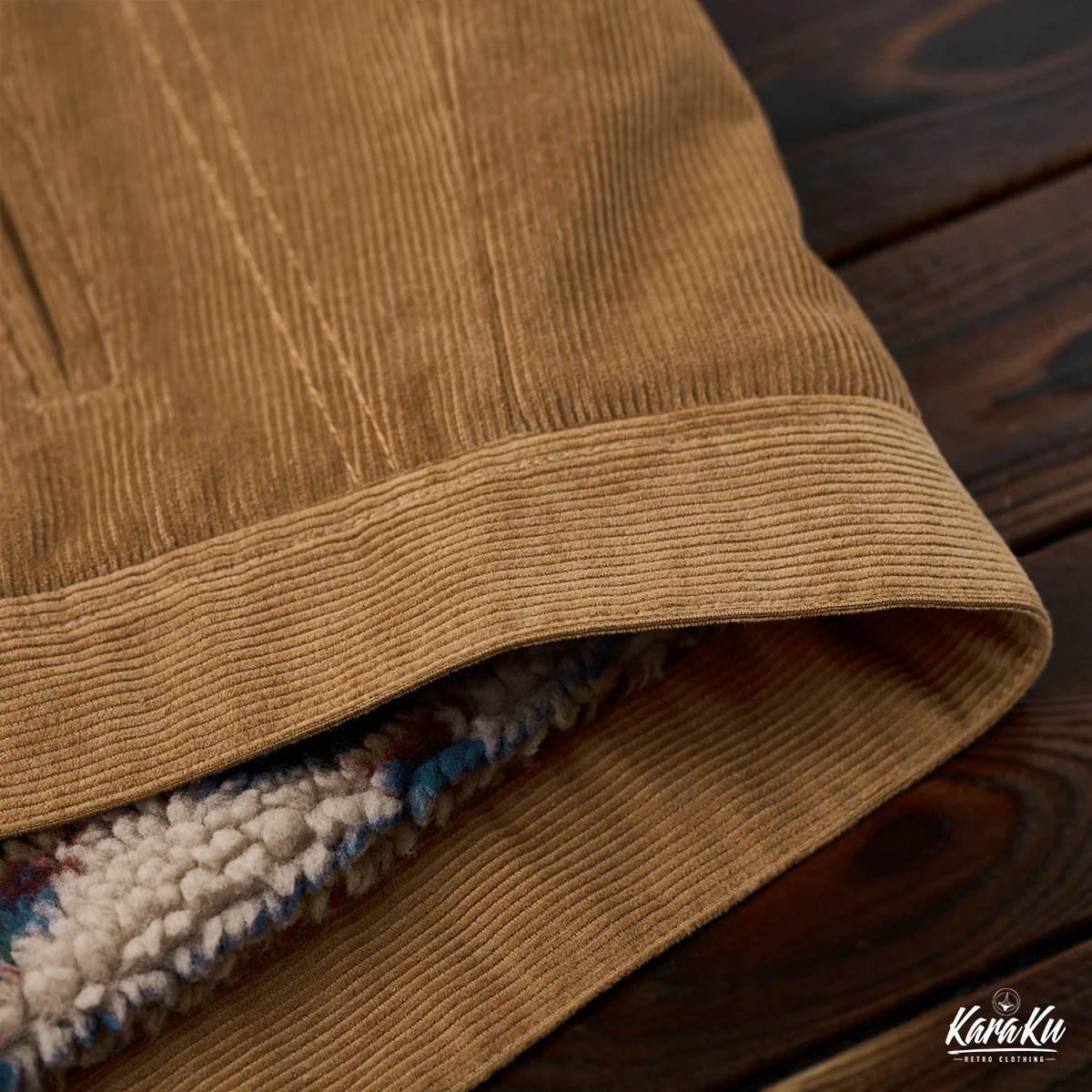 外側はカーキのコーデュロイ素材で構成されて、秋冬に適した温かみのある雰囲気を感じさせる。コーデュロイは丈夫でありながら柔らかい風合いを持つため、カジュアルでありながら洗練されたスタイルを演出。