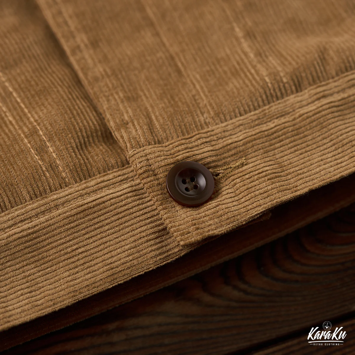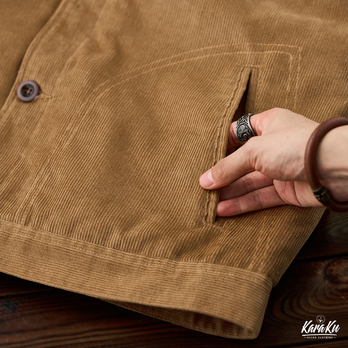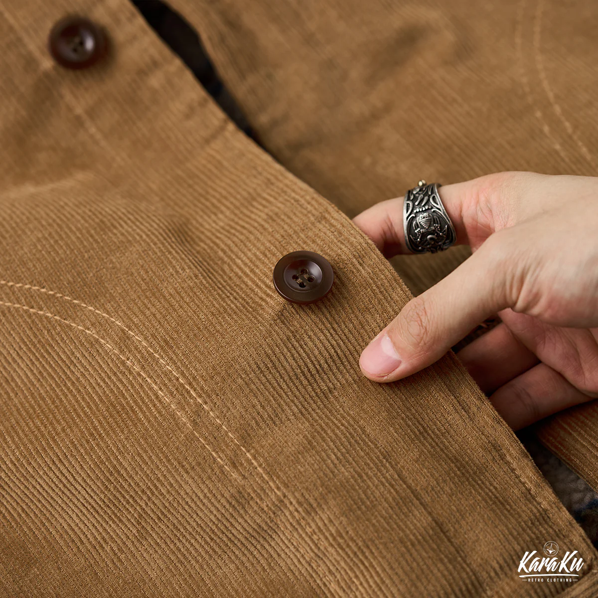 外側はカーキのコーデュロイ素材で構成されて、秋冬に適した温かみのある雰囲気を感じさせる。コーデュロイは丈夫でありながら柔らかい風合いを持つため、カジュアルでありながら洗練されたスタイルを演出。