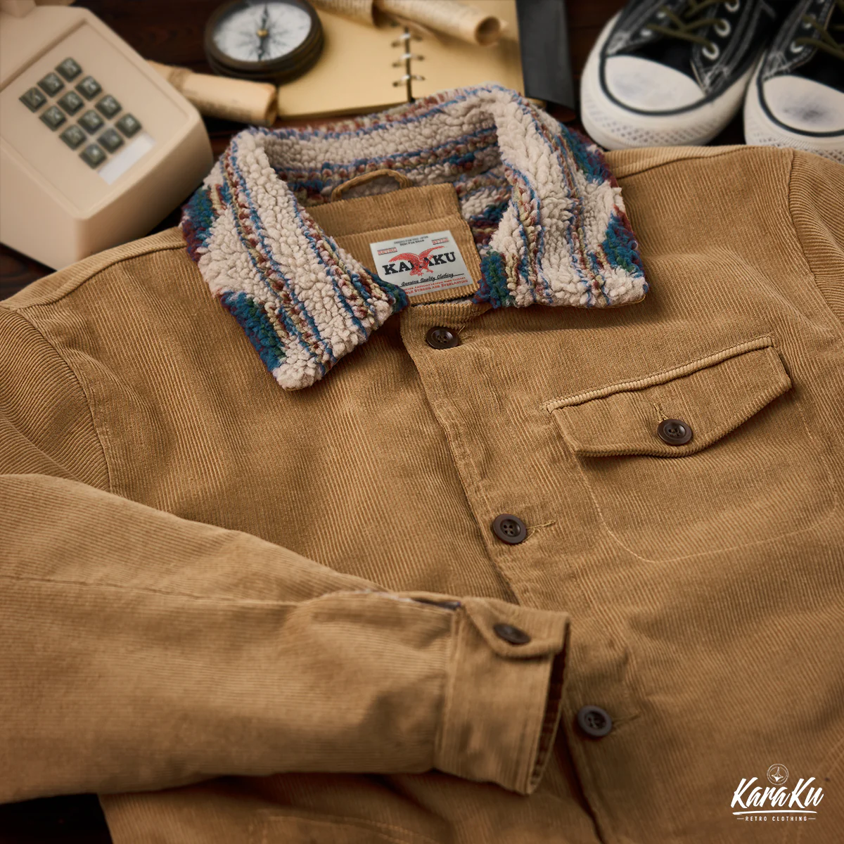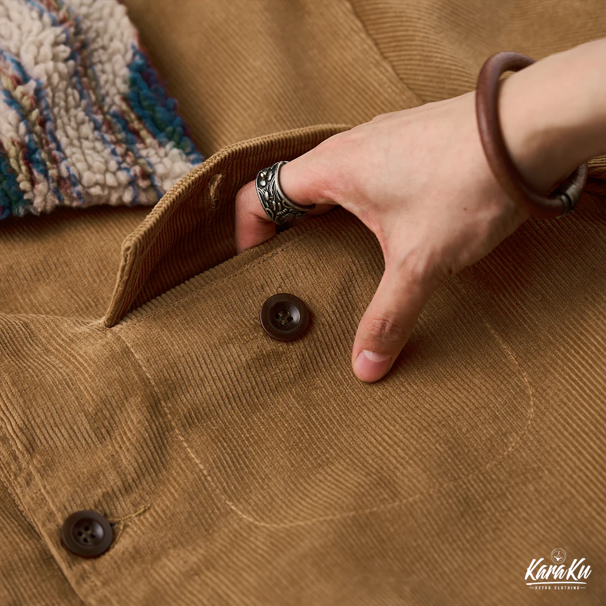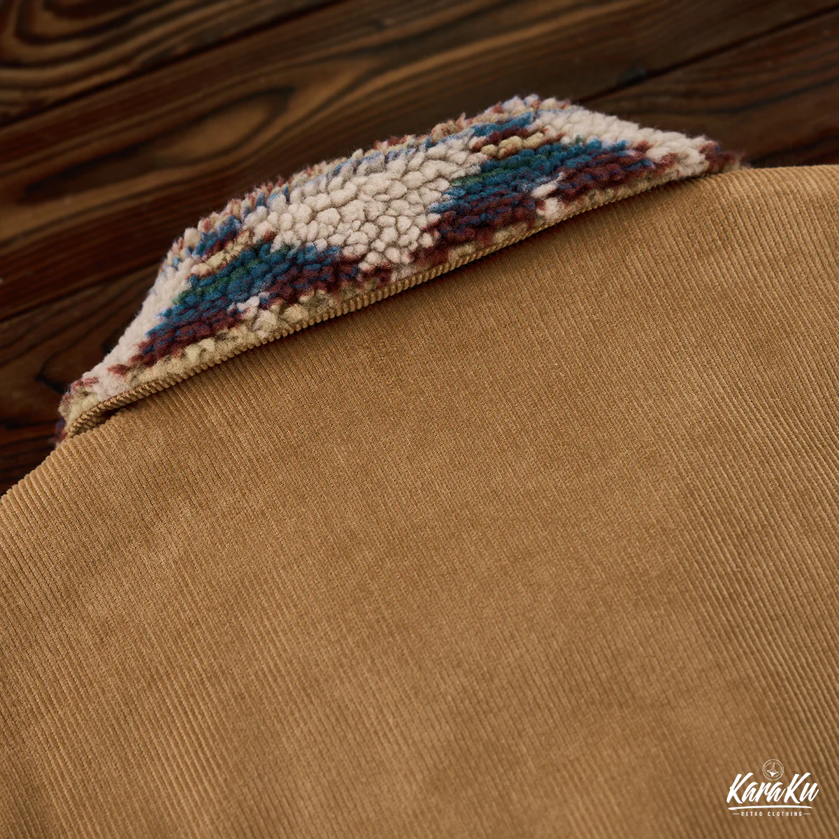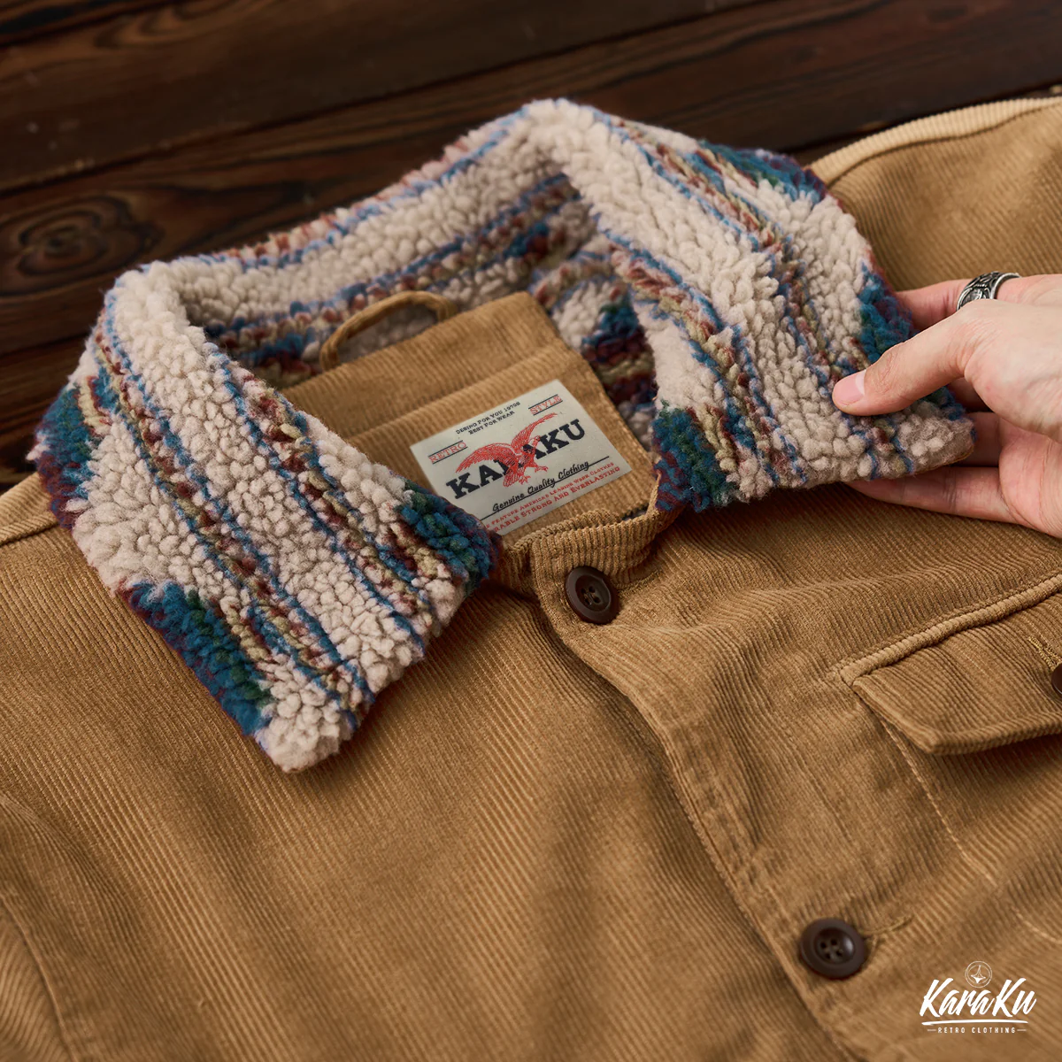 襟も裏地と同様にナバホ柄のボア素材が使われて、温かさを保ちながら視覚的なインパクトを与え。単調になりがちなコーデュロイジャケットに個性を与え、他のアウターと差別化している。
