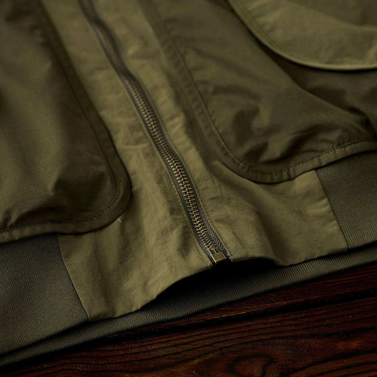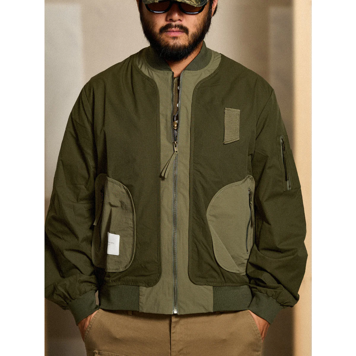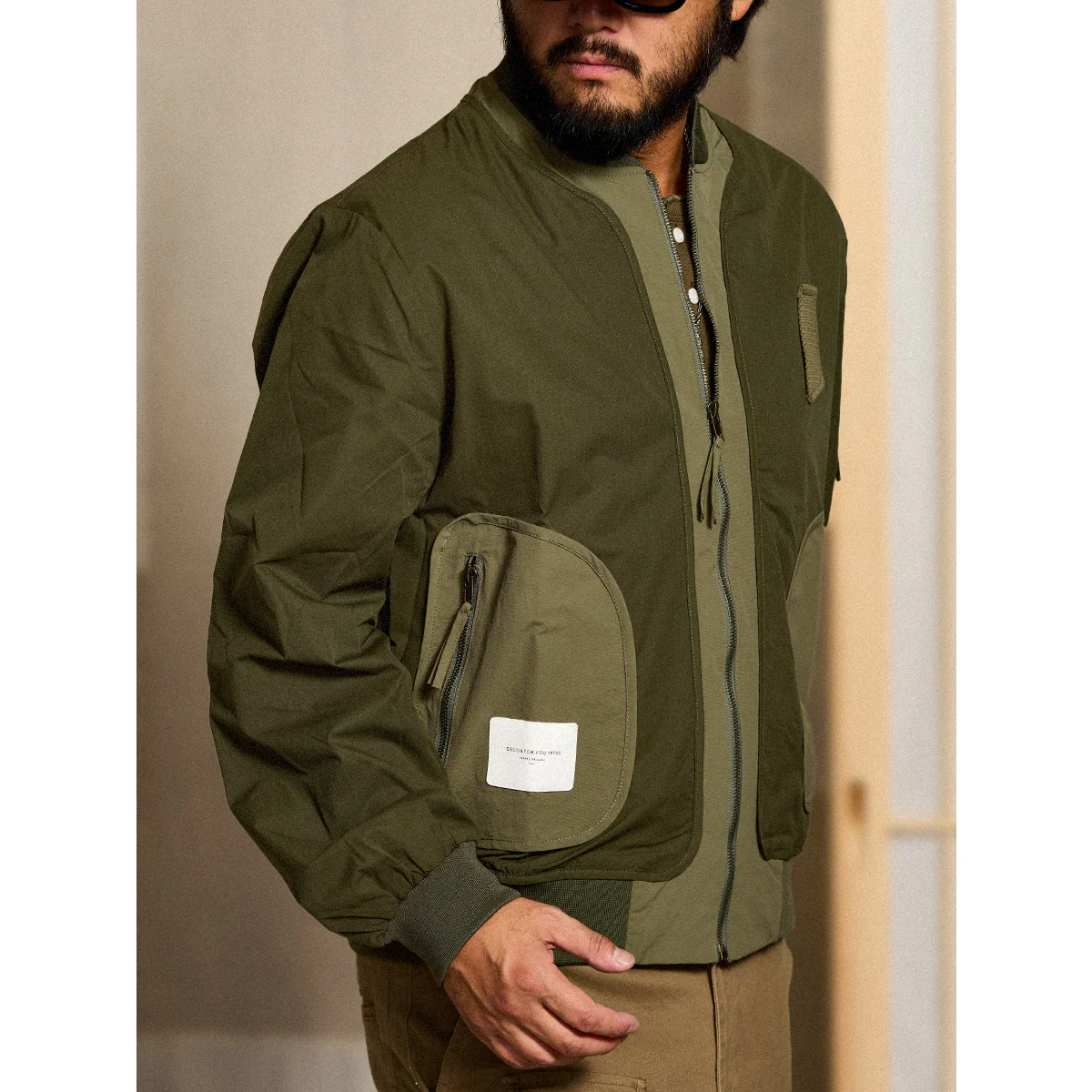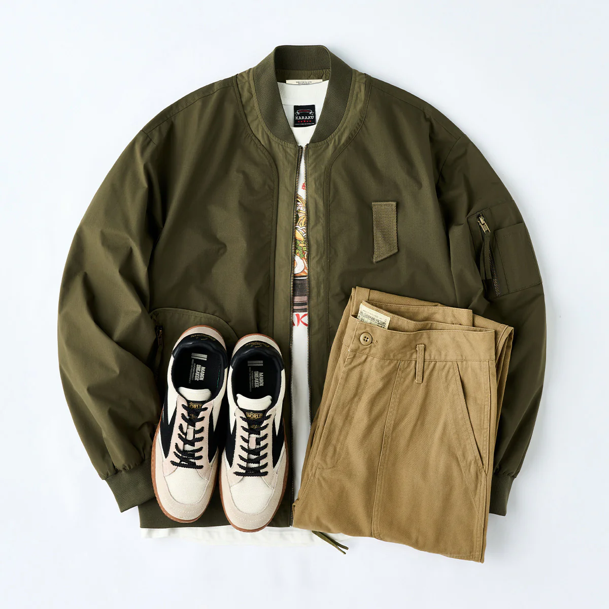 MA-1をベースに軽やかに仕上げたライトフライトジャケット。メインファブリックには撥水素材を採用し、デイリーからライトアクティビティまで幅広く対応。フロントの前立てやポケットには、フェイクレイヤードを思わせる配色切替を施し、スタイリングに奥行きを与えています。裏地には鮮やかなオレンジを配し、クラシックなフライトジャケットのディテールを都会的に再解釈。軽快な着心地ながら存在感のある一着は、季節の変わり目の主役アウターとして活躍します。