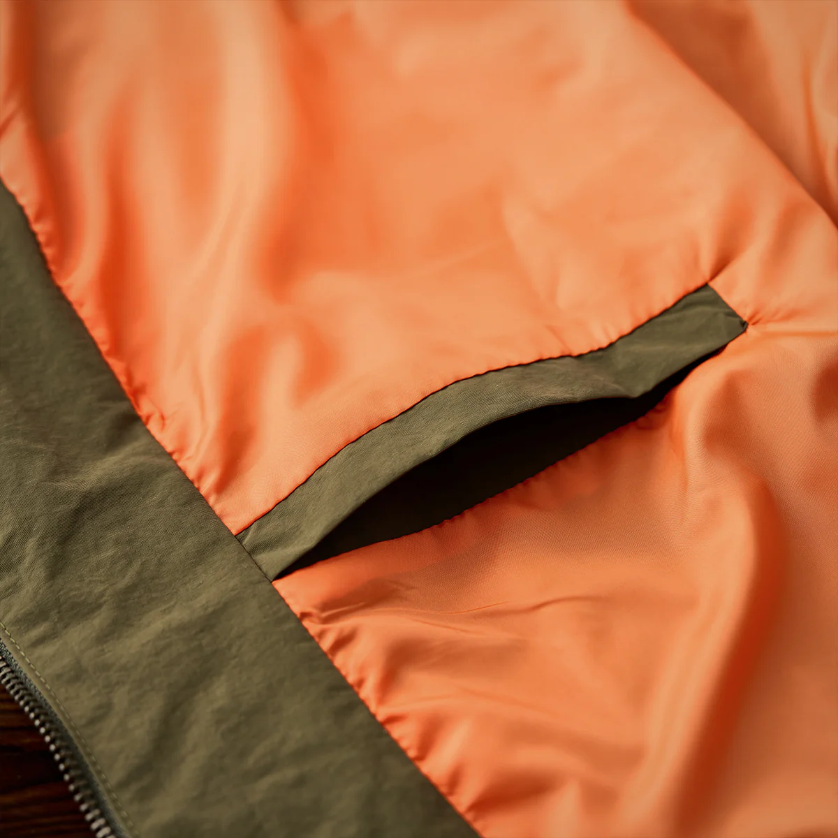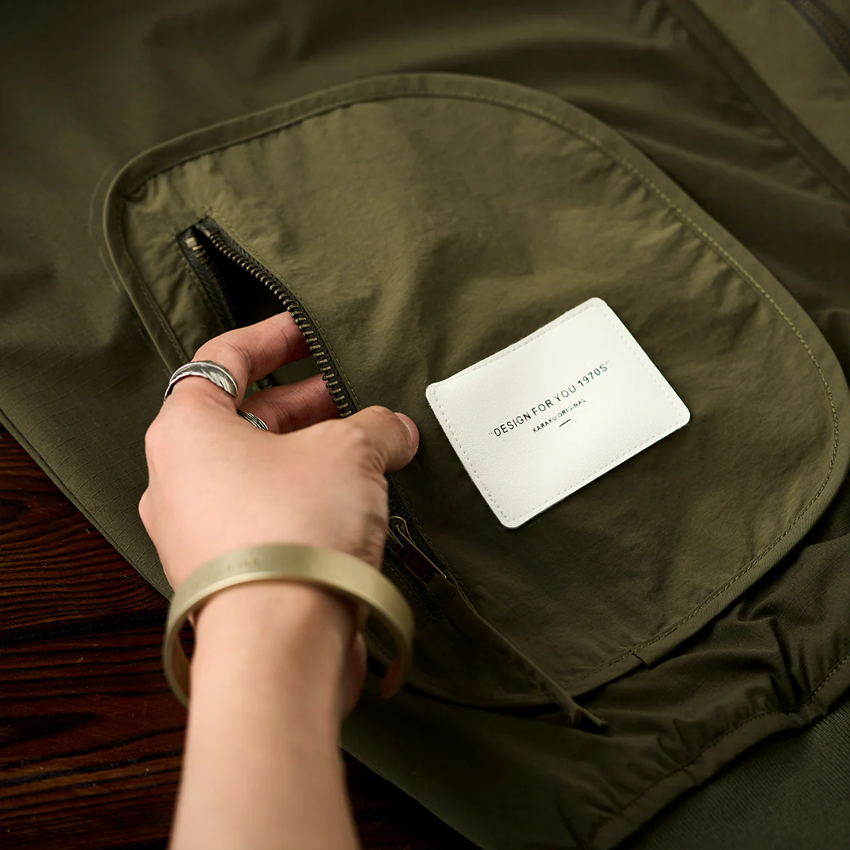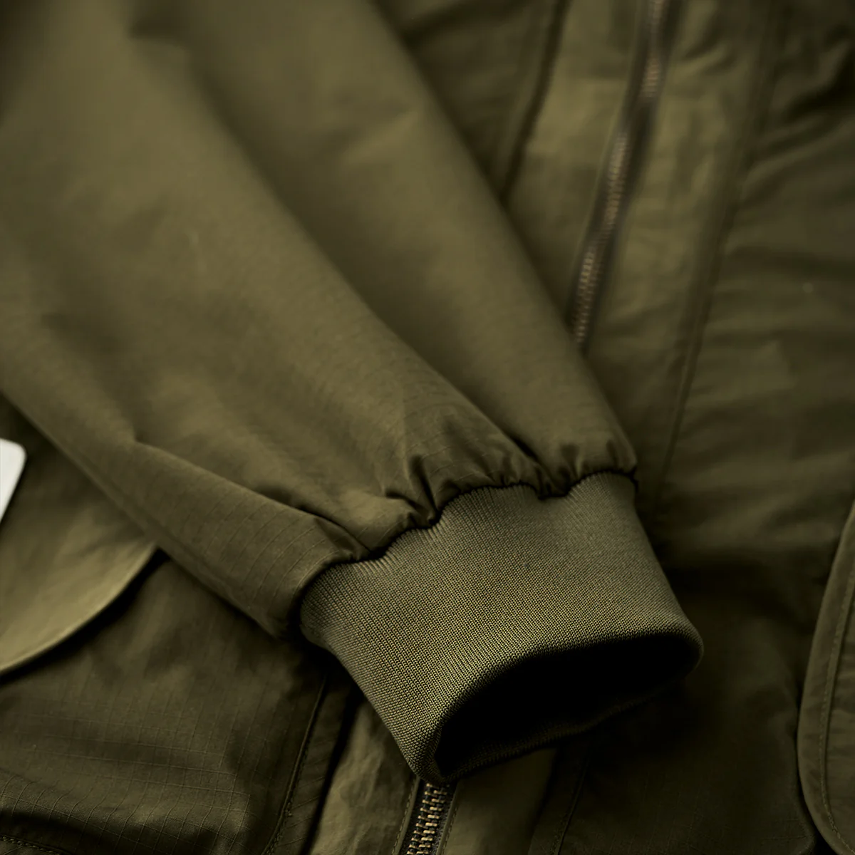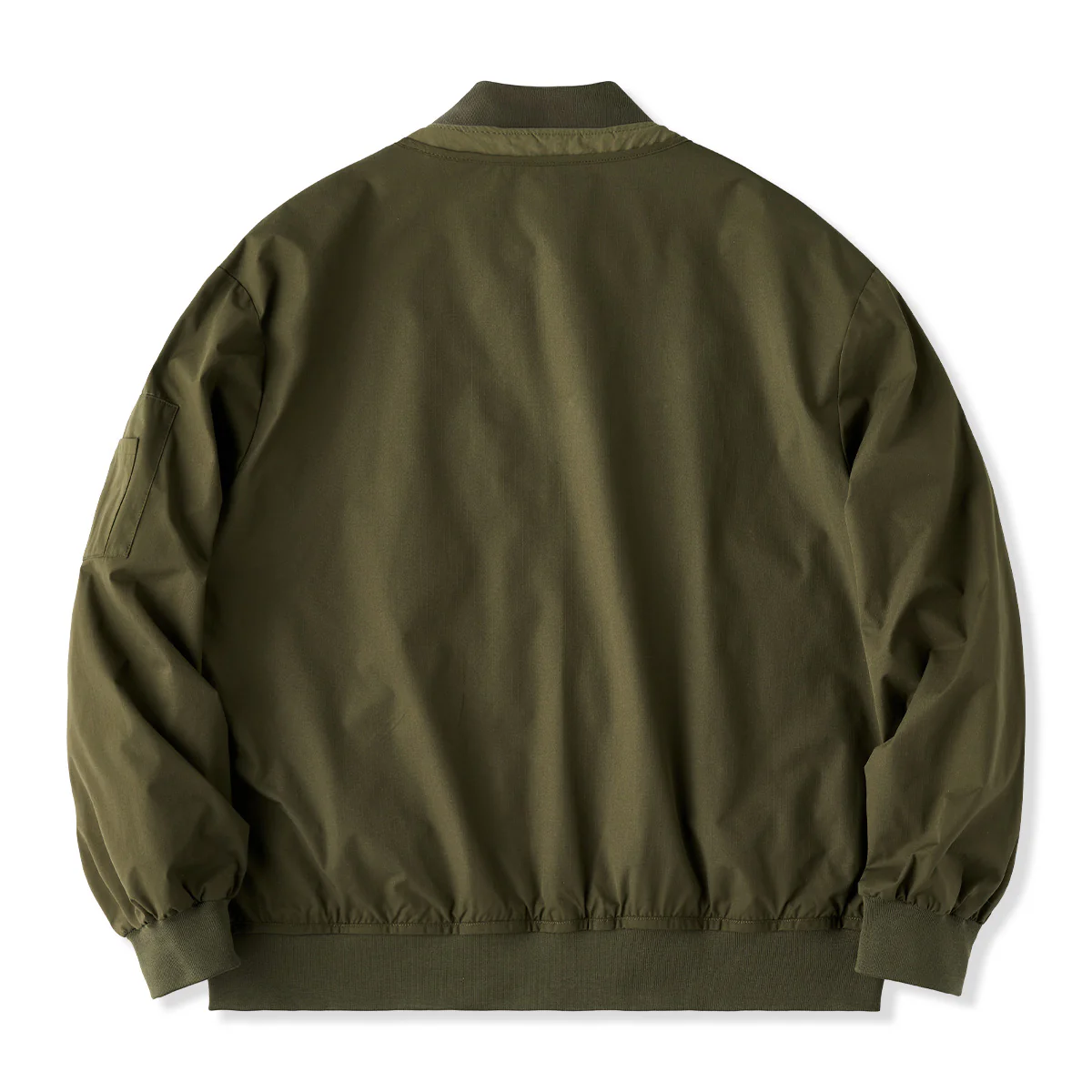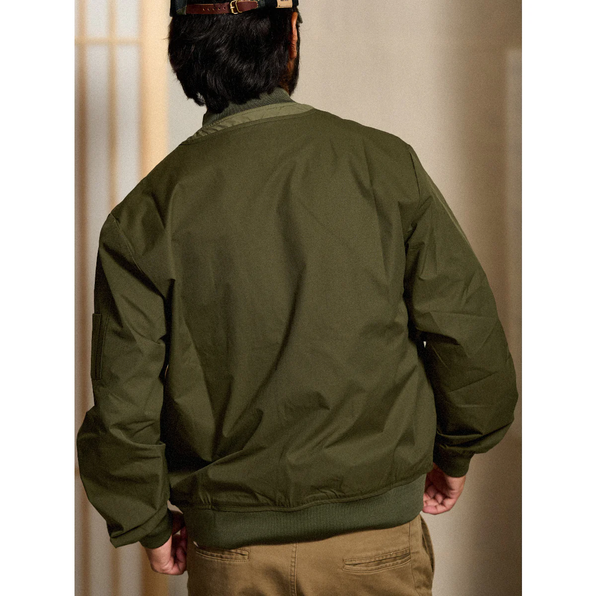 MA-1をベースに軽やかに仕上げたライトフライトジャケット。メインファブリックには撥水素材を採用し、デイリーからライトアクティビティまで幅広く対応。フロントの前立てやポケットには、フェイクレイヤードを思わせる配色切替を施し、スタイリングに奥行きを与えています。裏地には鮮やかなオレンジを配し、クラシックなフライトジャケットのディテールを都会的に再解釈。軽快な着心地ながら存在感のある一着は、季節の変わり目の主役アウターとして活躍します。
