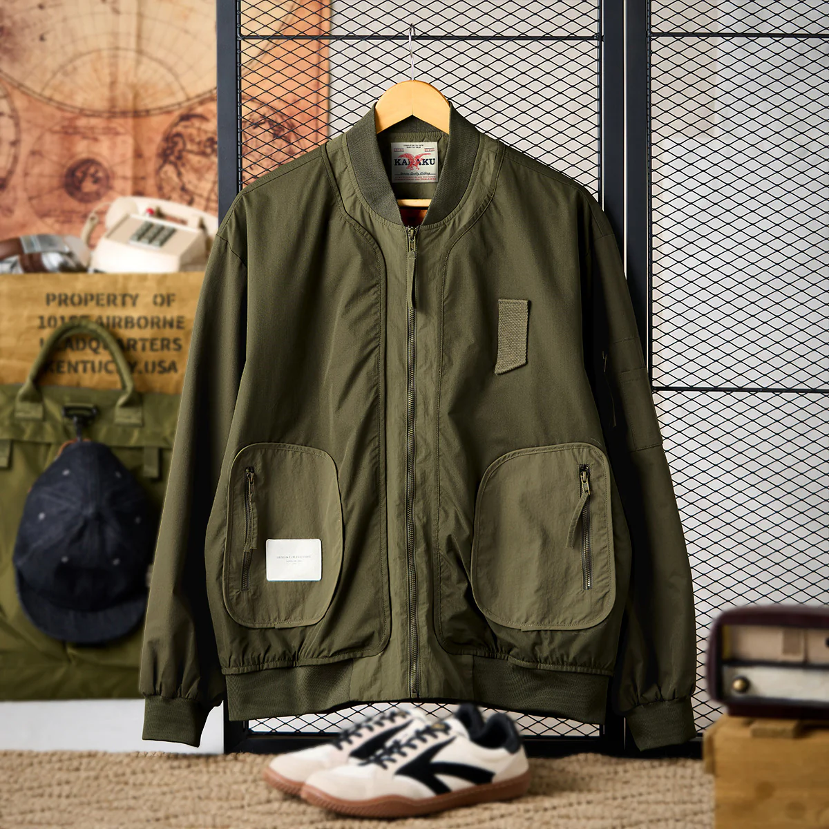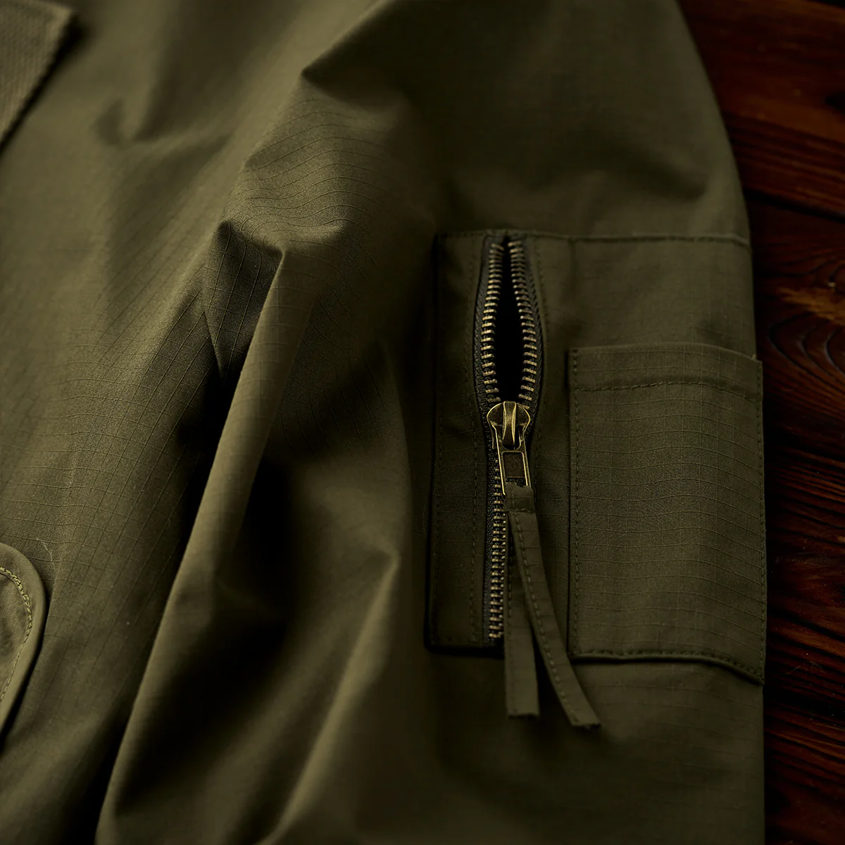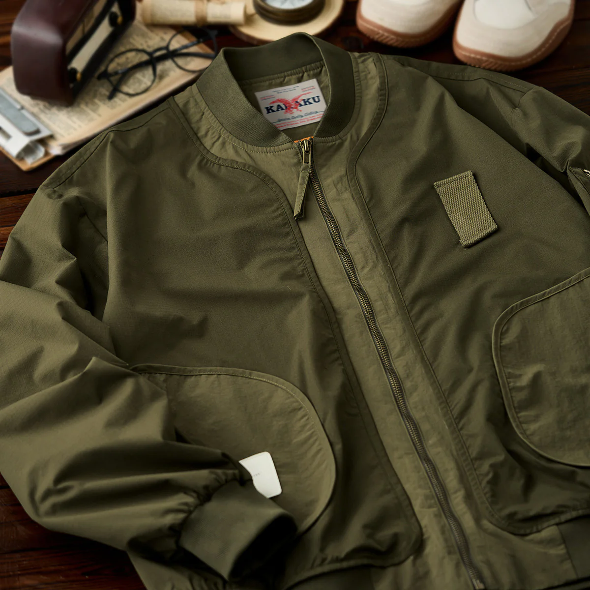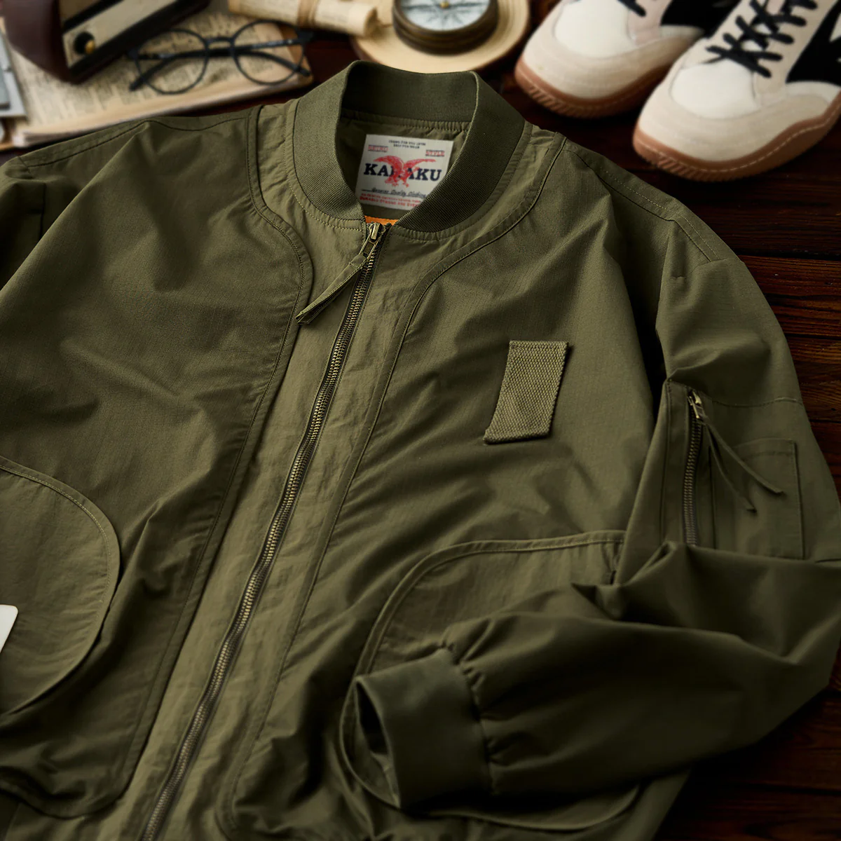 MA-1をベースに軽やかに仕上げたライトフライトジャケット。メインファブリックには撥水素材を採用し、デイリーからライトアクティビティまで幅広く対応。フロントの前立てやポケットには、フェイクレイヤードを思わせる配色切替を施し、スタイリングに奥行きを与えています。裏地には鮮やかなオレンジを配し、クラシックなフライトジャケットのディテールを都会的に再解釈。軽快な着心地ながら存在感のある一着は、季節の変わり目の主役アウターとして活躍します。