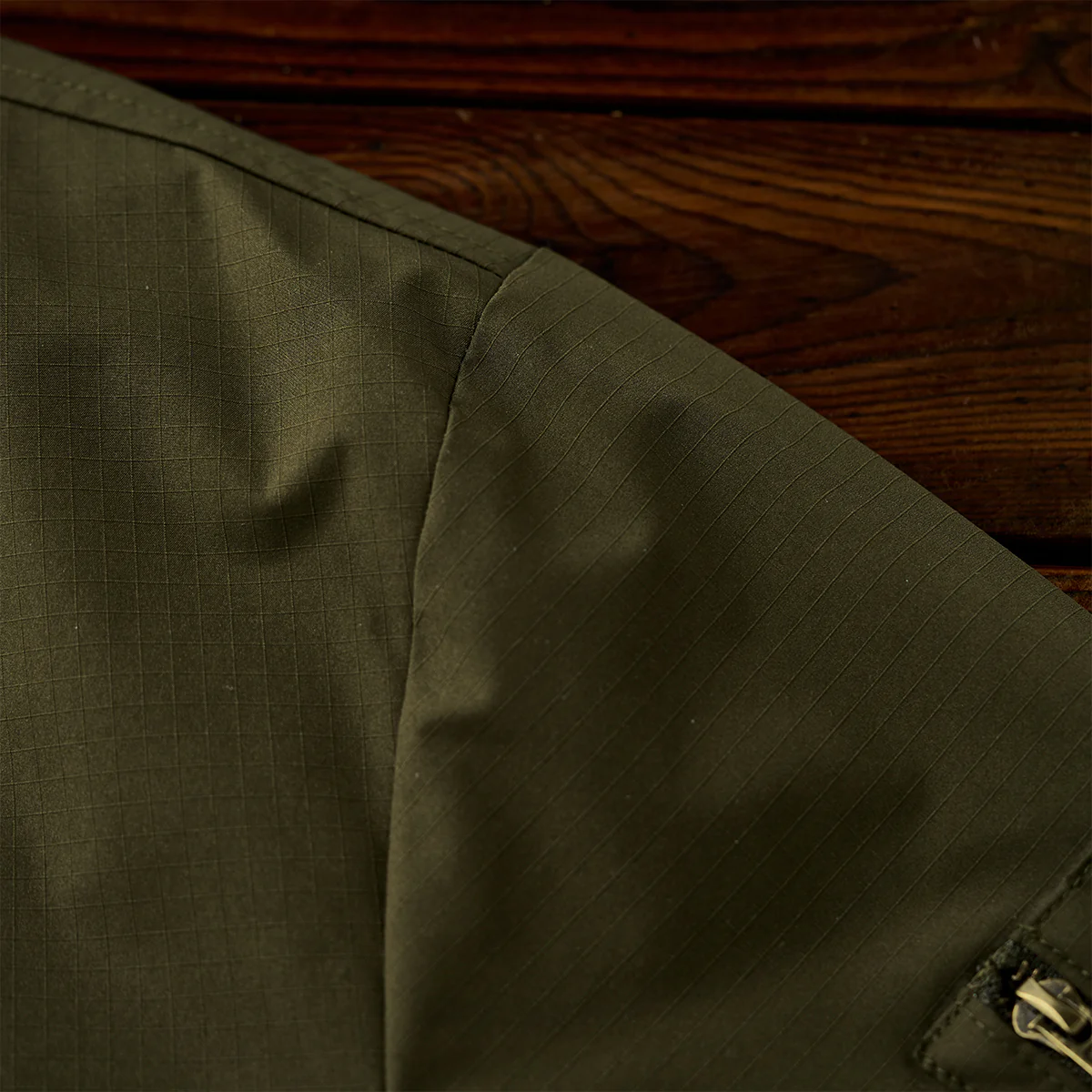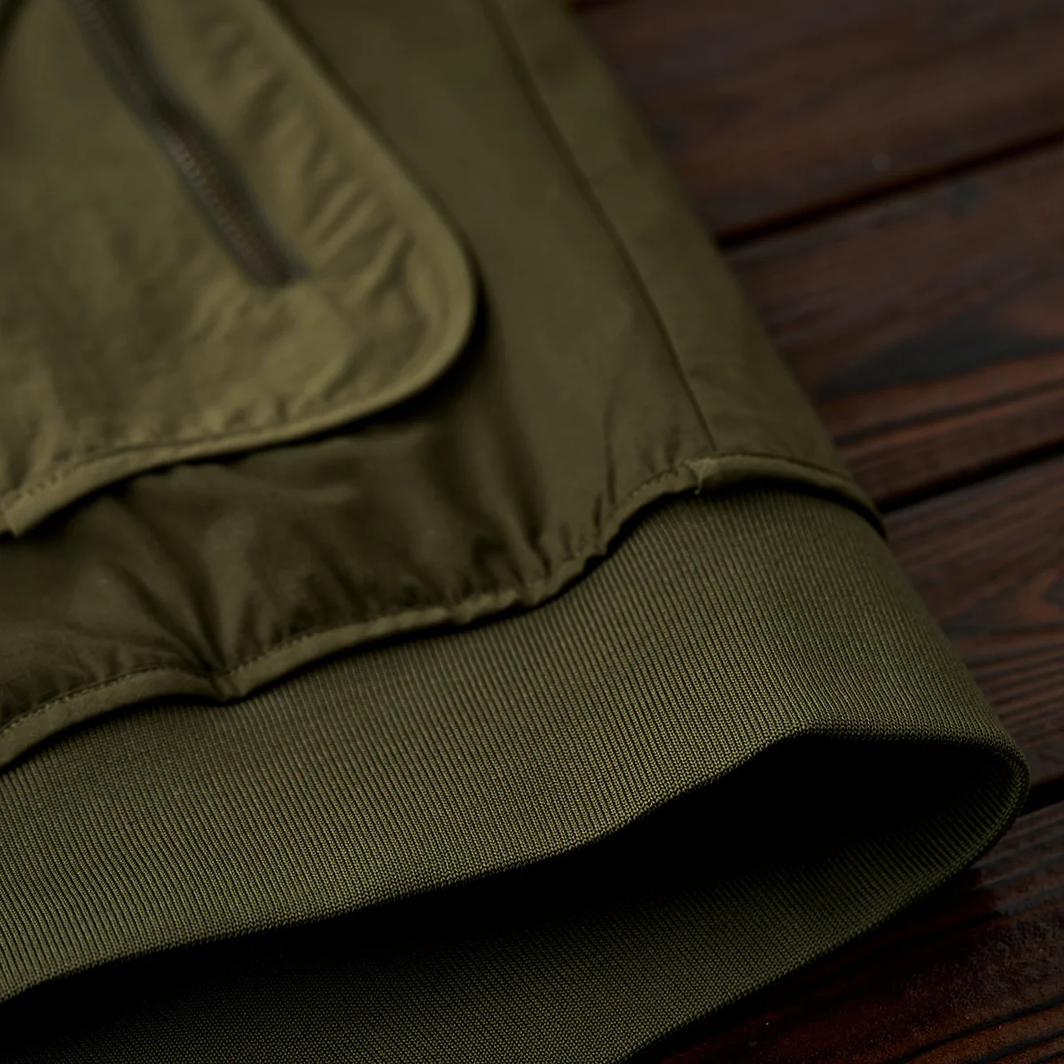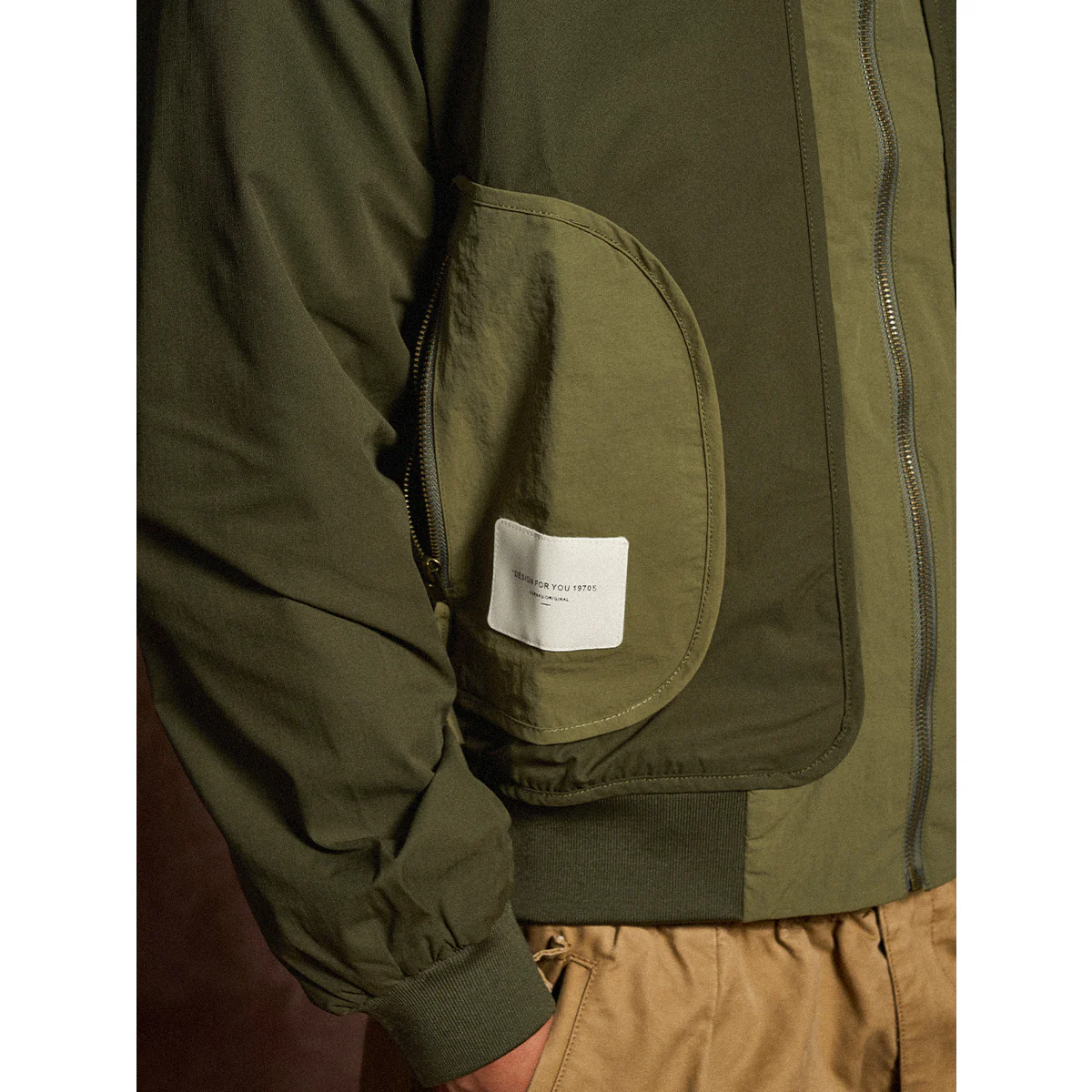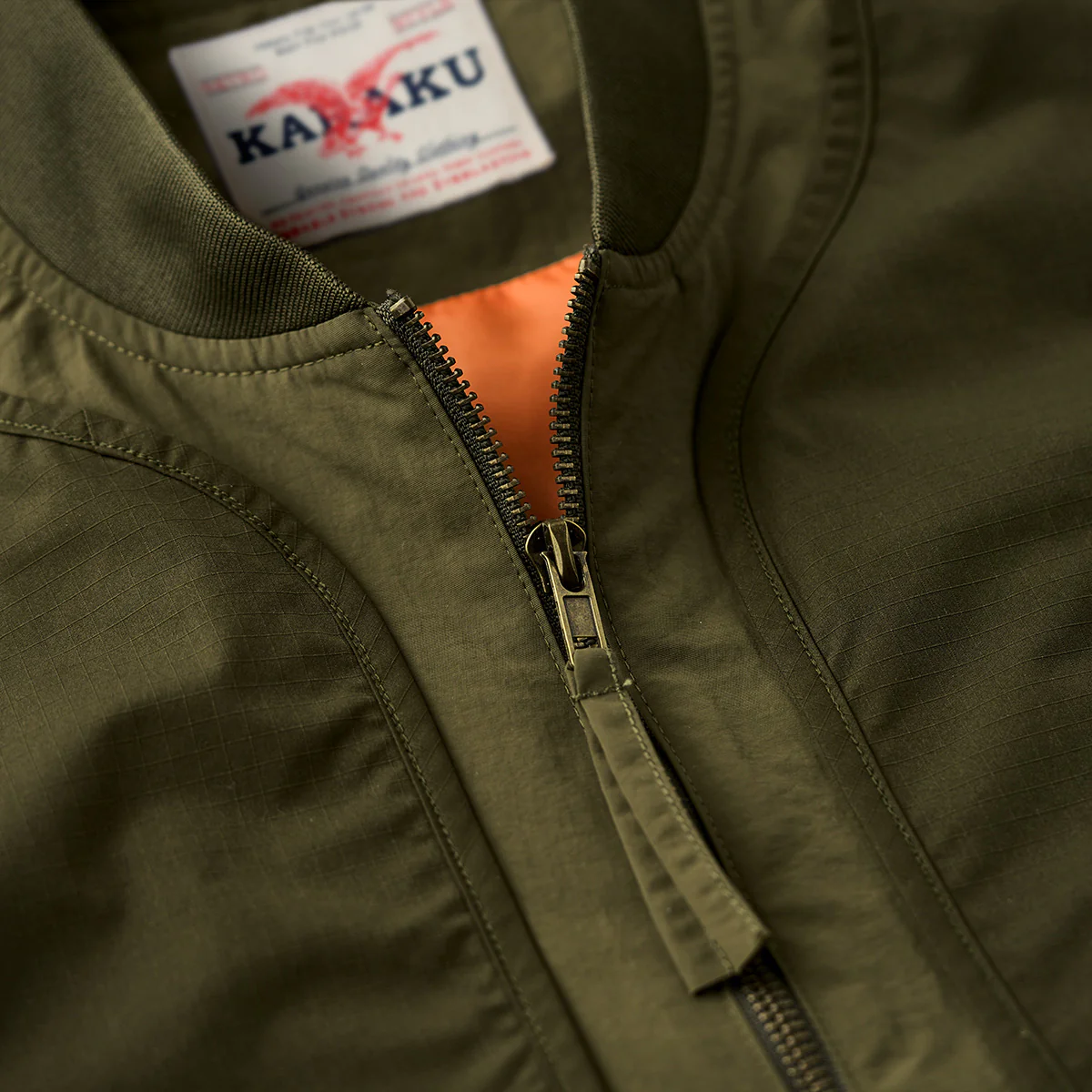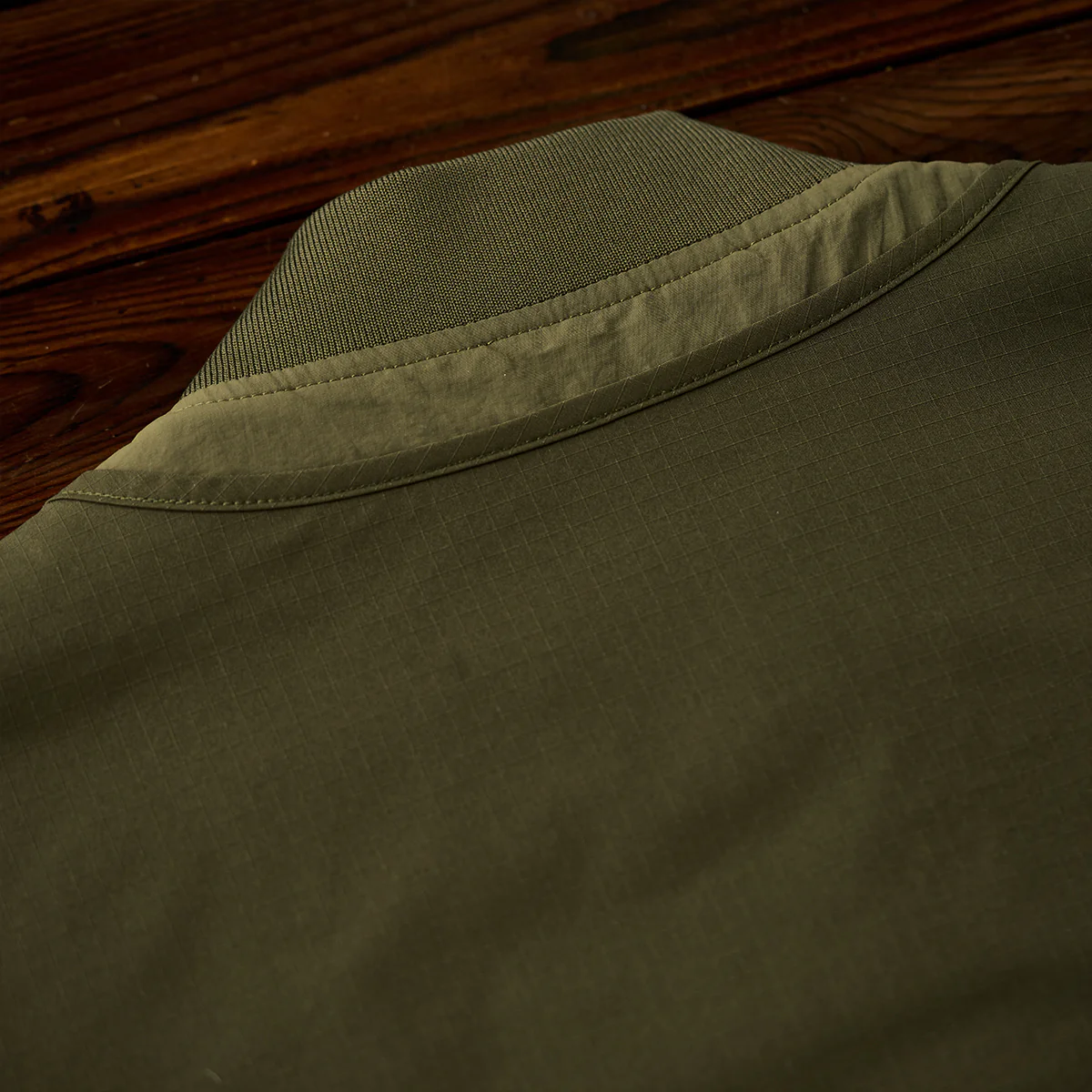 MA-1をベースに軽やかに仕上げたライトフライトジャケット。メインファブリックには撥水素材を採用し、デイリーからライトアクティビティまで幅広く対応。フロントの前立てやポケットには、フェイクレイヤードを思わせる配色切替を施し、スタイリングに奥行きを与えています。裏地には鮮やかなオレンジを配し、クラシックなフライトジャケットのディテールを都会的に再解釈。軽快な着心地ながら存在感のある一着は、季節の変わり目の主役アウターとして活躍します。