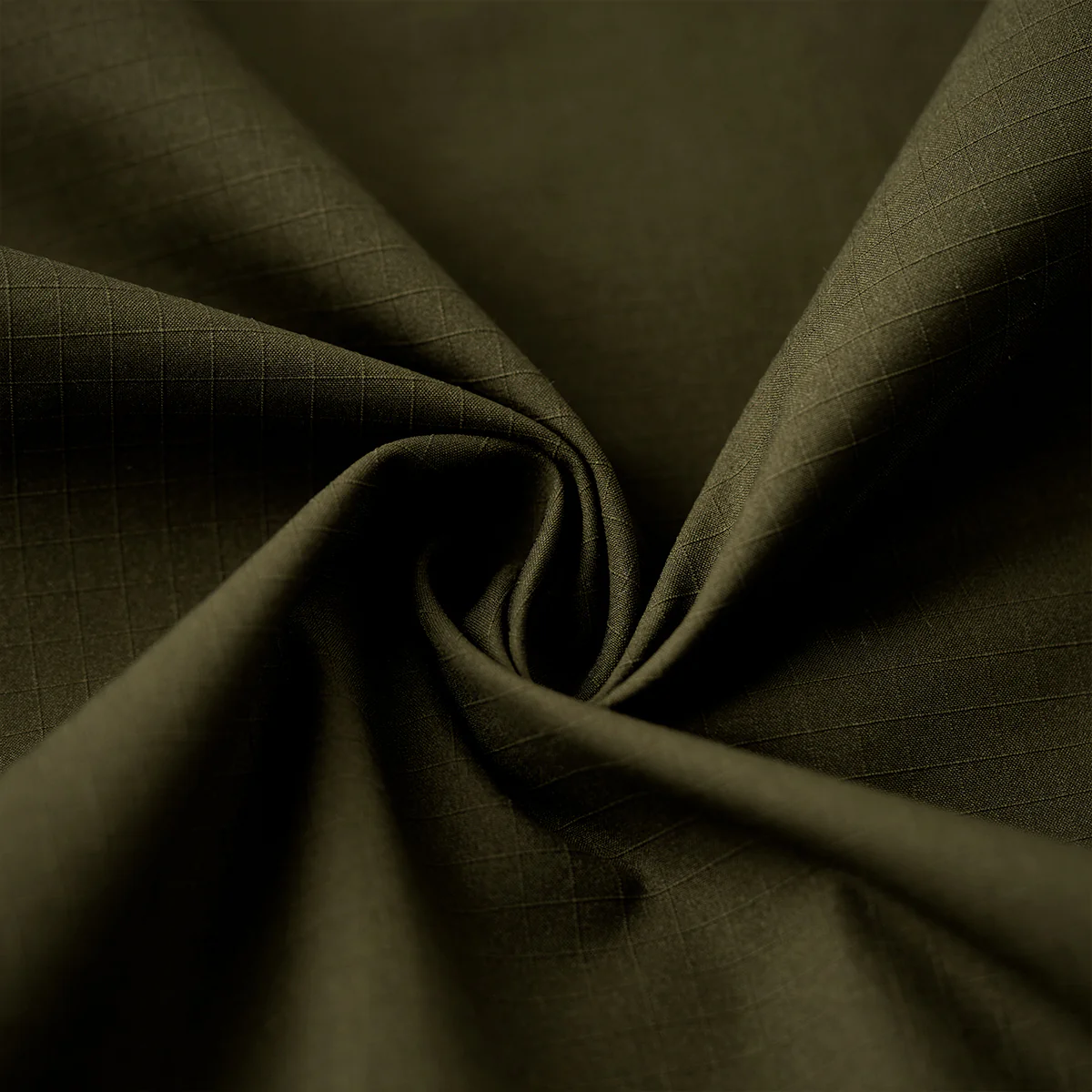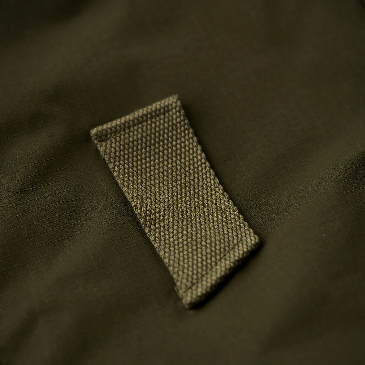 表地はナイロン素材を使用、軽量で撥水性があり、アウトドアシーンにも適した。裏地はポリエステル生地を使用、さらっとした滑りの良い質感で、インナーとの摩擦が少なく脱ぎ着がスムーズ。