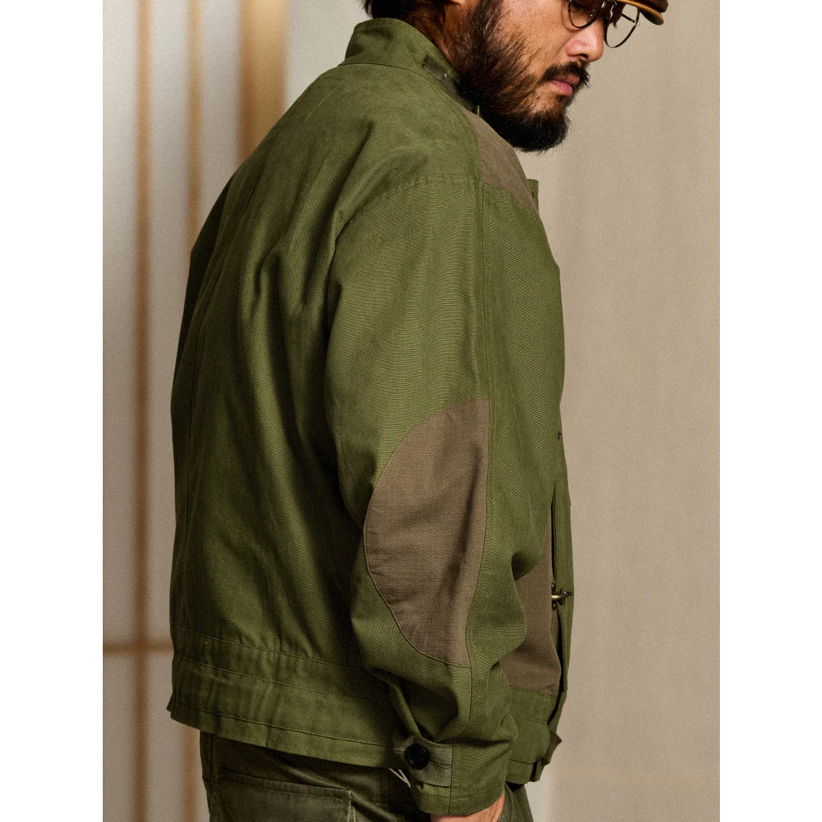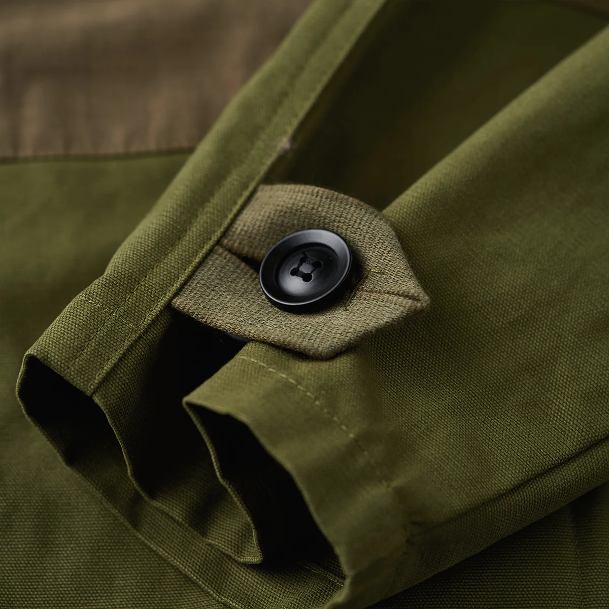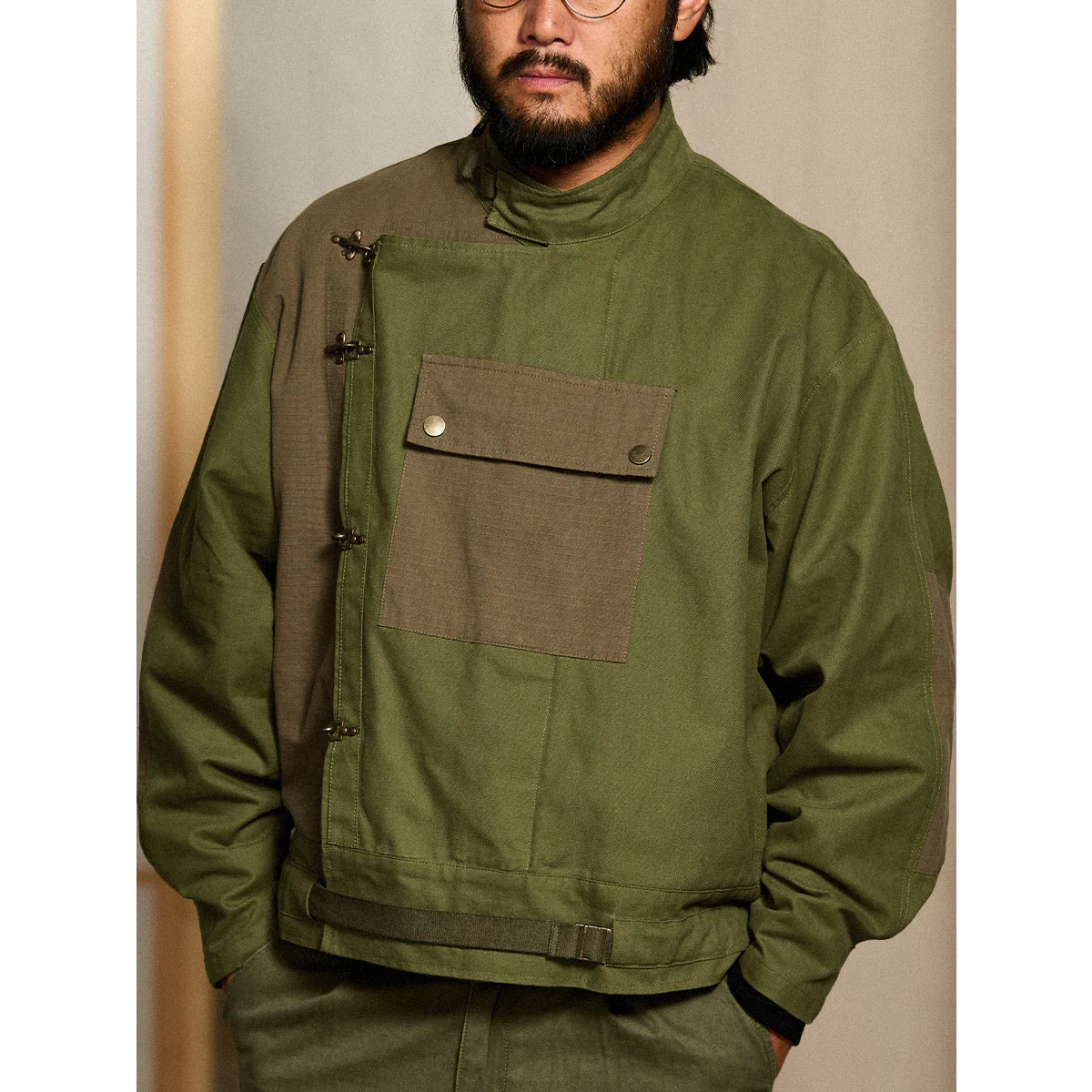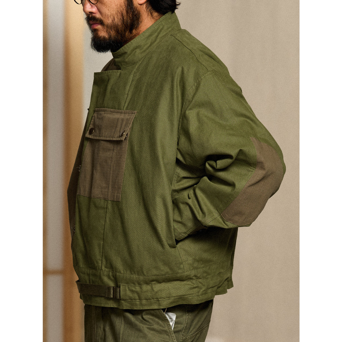 1960年代スウェーデン軍のモーターサイクルジャケットをベースに復刻した一着。防風性を高めるアシンメトリーのフロントデザインが印象的で、ヴィンテージミリタリー特有の無骨な存在感を放ちます。ワークテイスト漂うフックボタンもデザインのアクセント。本体にはミリタリーグリーンのキャンバス生地を採用し、部分的にカーキグリーンのコットンピケ生地を切り替えた異素材コンビネーションが魅力です。色のコントラストが映える配色は、クラシックな雰囲気を残しつつも現代的にアップデート。ゆったりとしたショート丈シルエットで、ジャストサイズはもちろん、オーバーサイズでざっくり羽織るスタイルもおすすめ。現行品ではなかなか味わえない、重厚感と存在感に満ちたミリタリーアウターをお探しの方にぴったりの一着です。