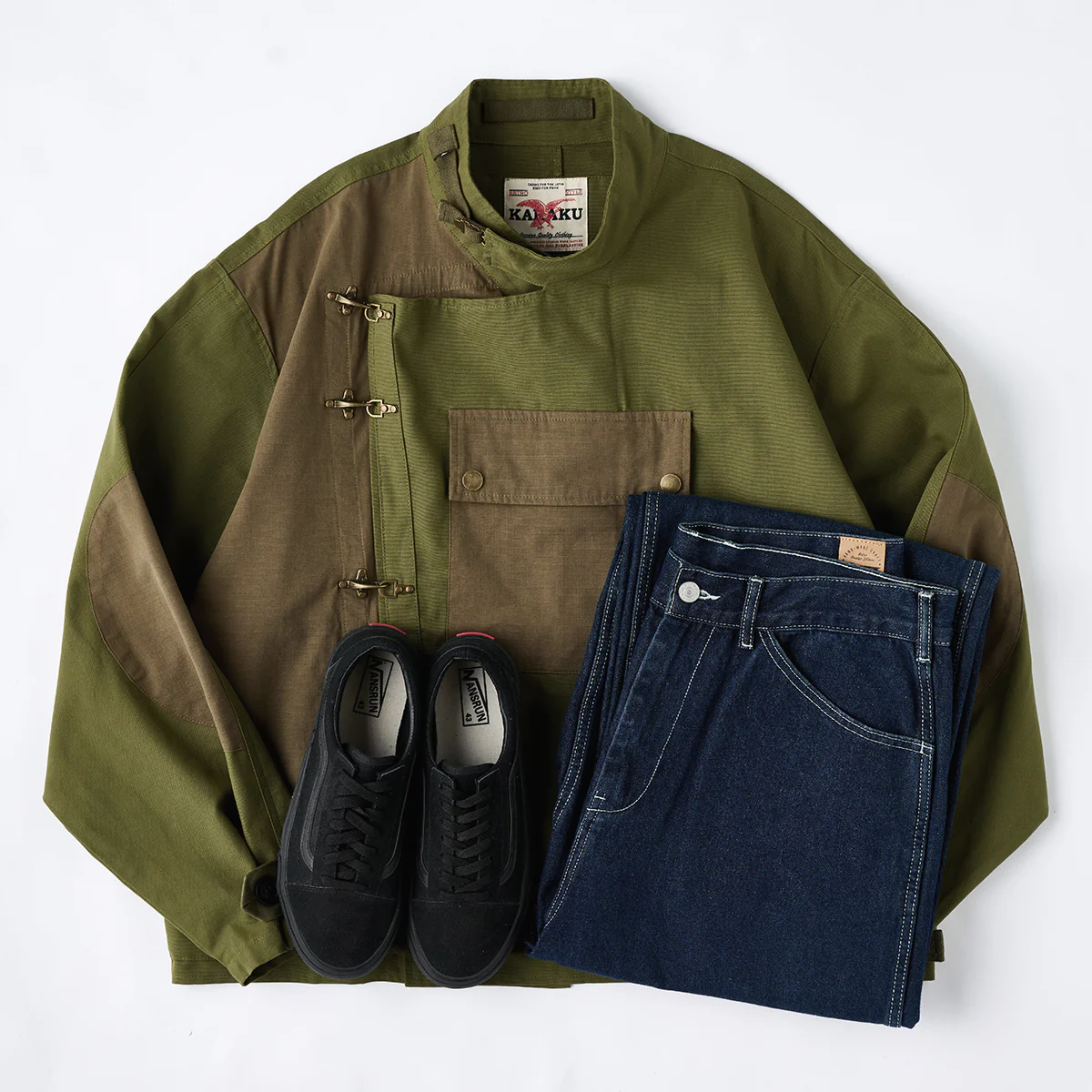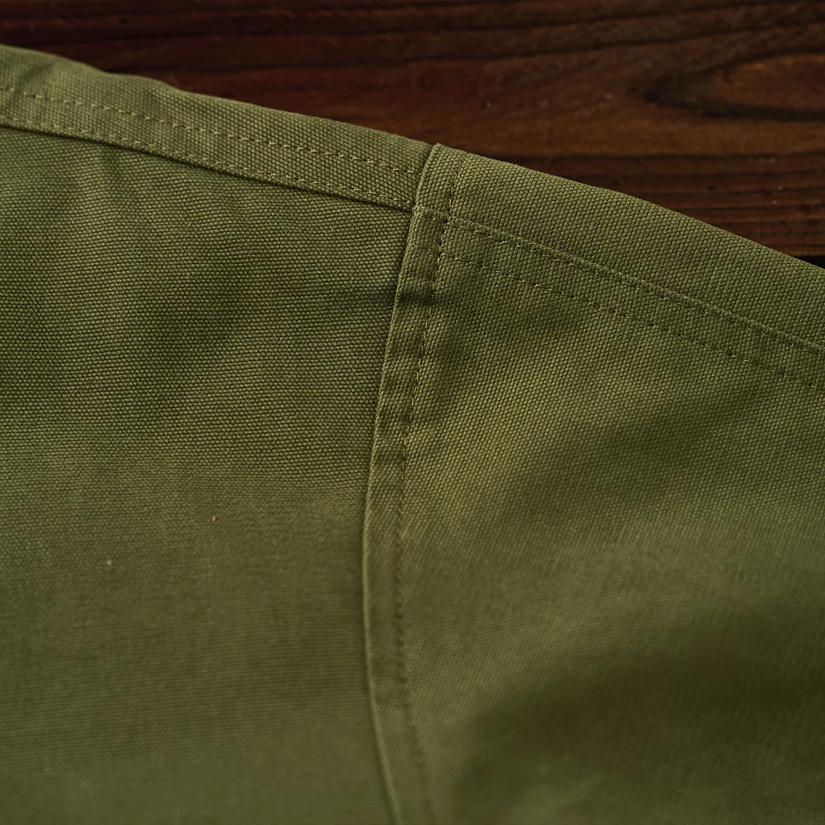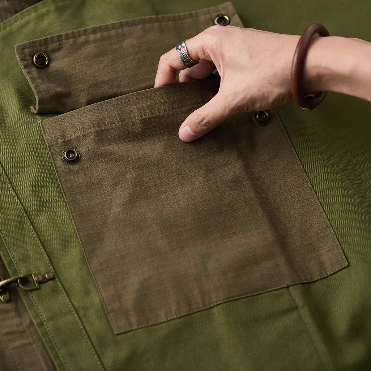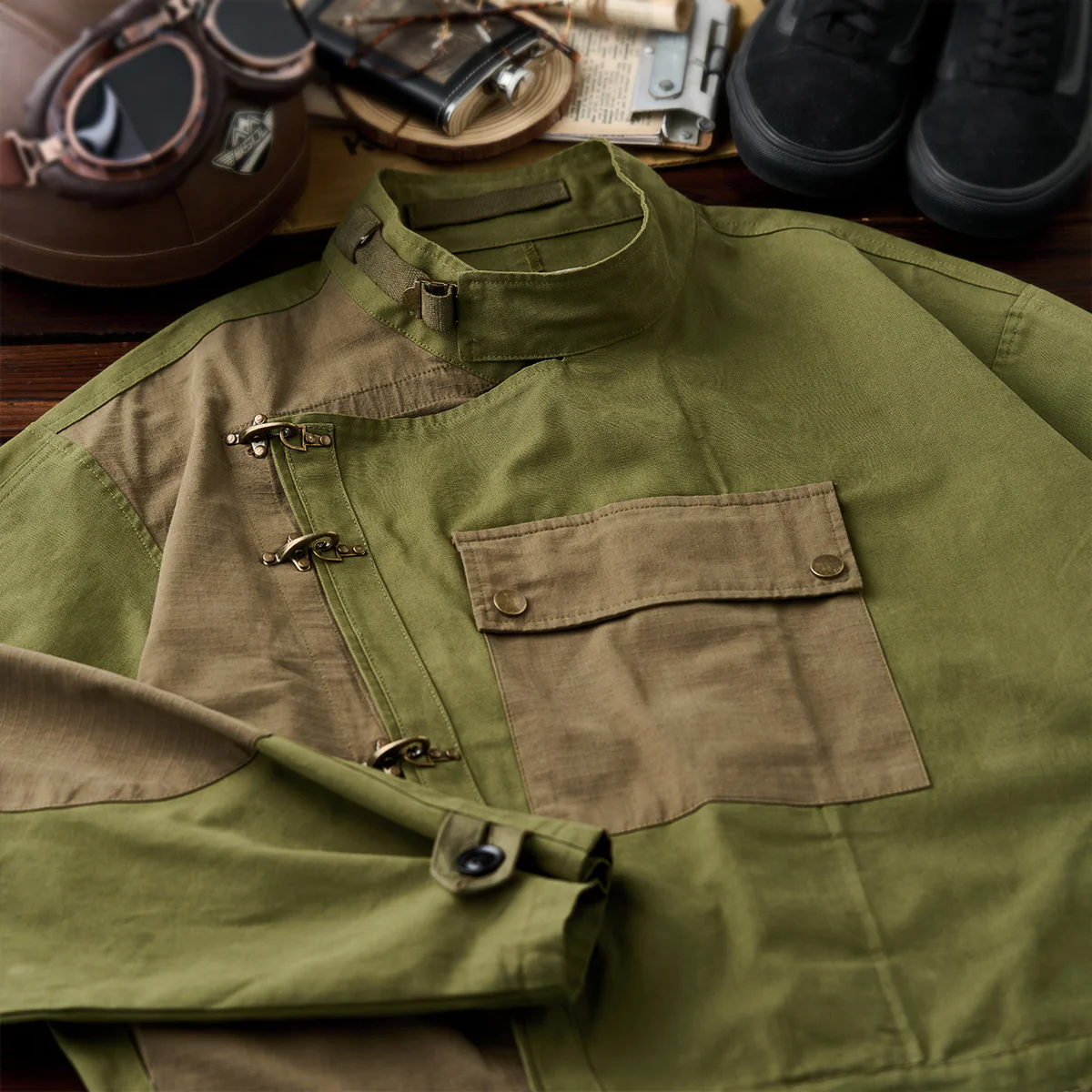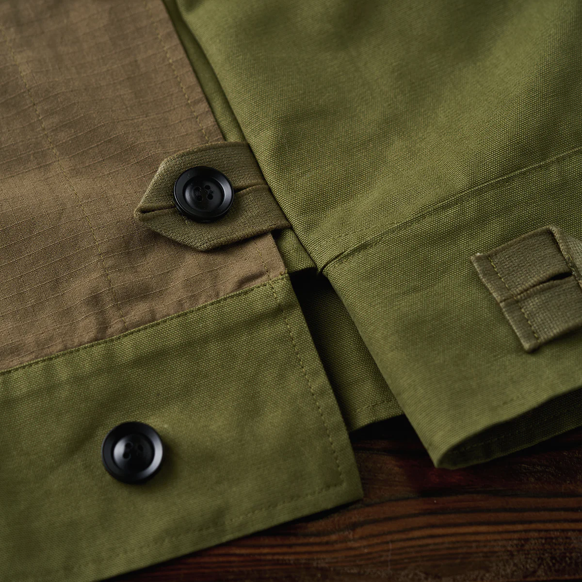 1960年代スウェーデン軍のモーターサイクルジャケットをベースに復刻した一着。防風性を高めるアシンメトリーのフロントデザインが印象的で、ヴィンテージミリタリー特有の無骨な存在感を放ちます。ワークテイスト漂うフックボタンもデザインのアクセント。本体にはミリタリーグリーンのキャンバス生地を採用し、部分的にカーキグリーンのコットンピケ生地を切り替えた異素材コンビネーションが魅力です。色のコントラストが映える配色は、クラシックな雰囲気を残しつつも現代的にアップデート。ゆったりとしたショート丈シルエットで、ジャストサイズはもちろん、オーバーサイズでざっくり羽織るスタイルもおすすめ。現行品ではなかなか味わえない、重厚感と存在感に満ちたミリタリーアウターをお探しの方にぴったりの一着です。