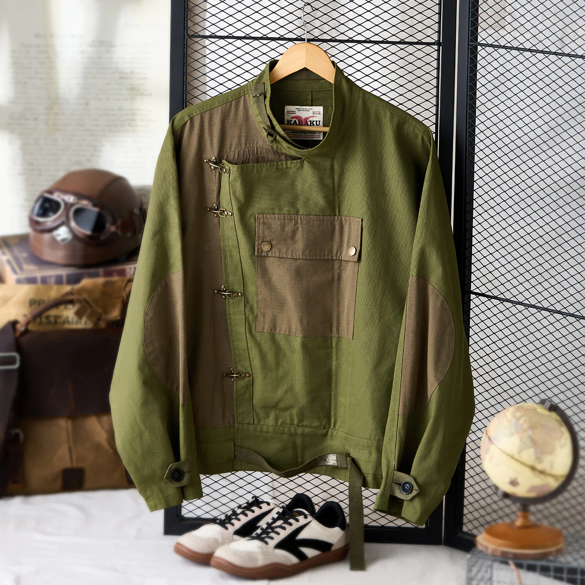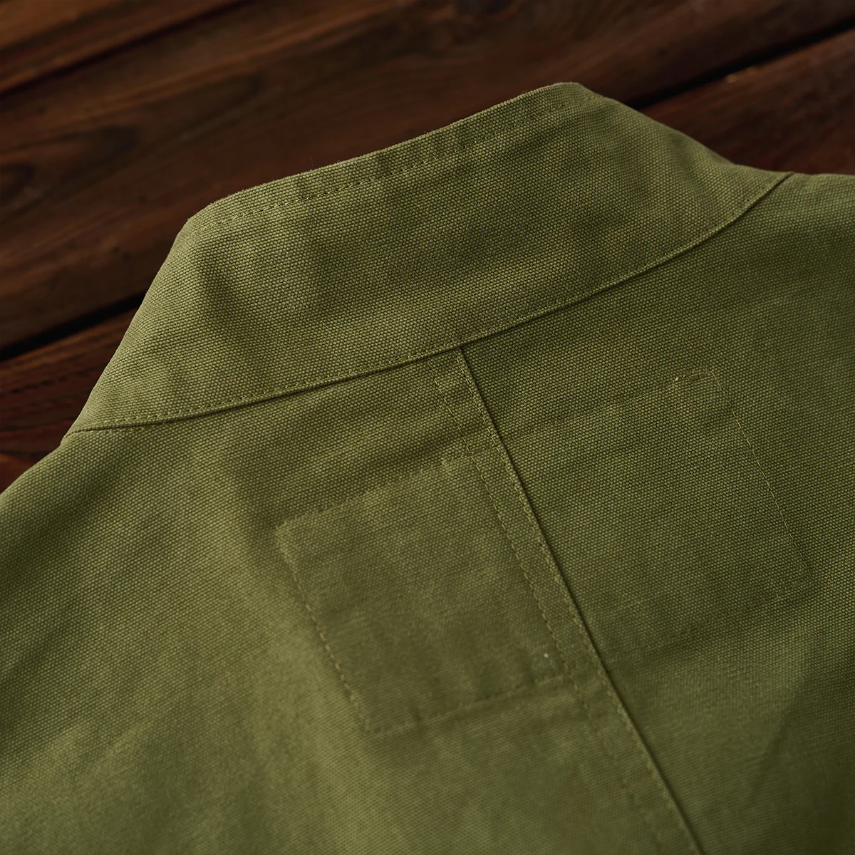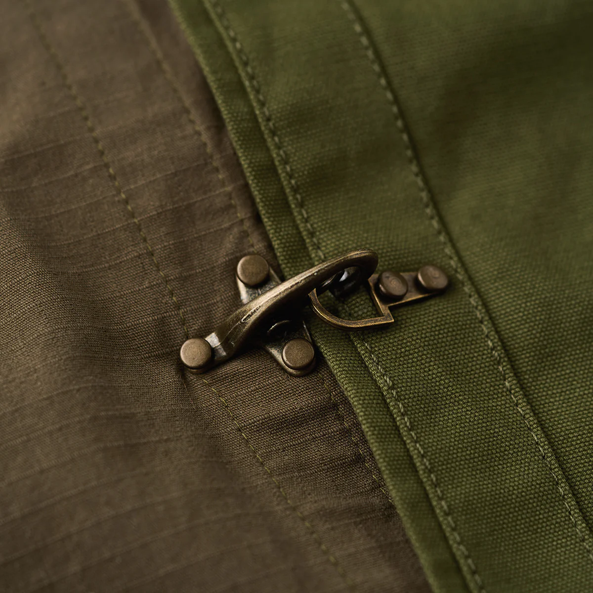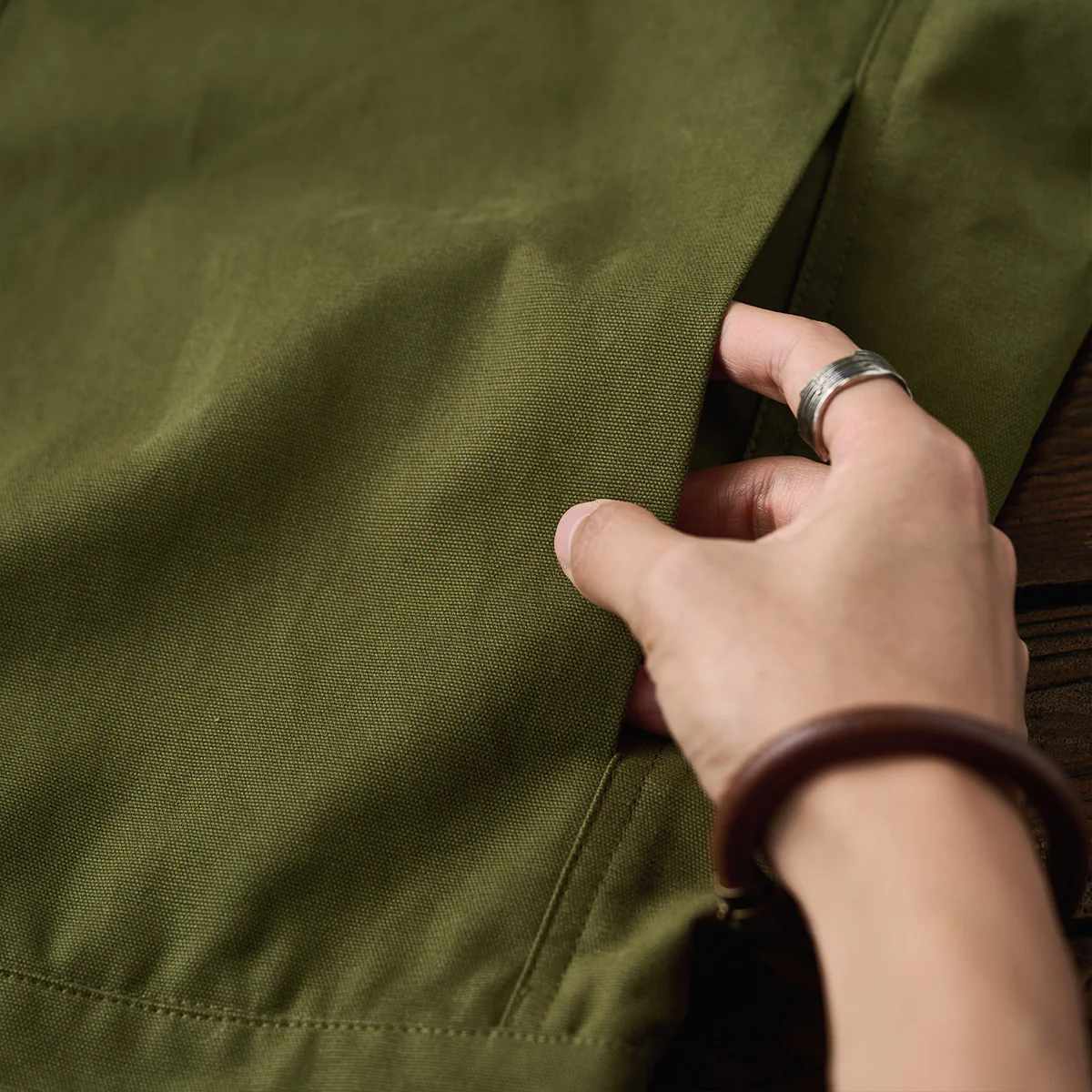 1960年代スウェーデン軍のモーターサイクルジャケットをベースに復刻した一着。防風性を高めるアシンメトリーのフロントデザインが印象的で、ヴィンテージミリタリー特有の無骨な存在感を放ちます。ワークテイスト漂うフックボタンもデザインのアクセント。本体にはミリタリーグリーンのキャンバス生地を採用し、部分的にカーキグリーンのコットンピケ生地を切り替えた異素材コンビネーションが魅力です。色のコントラストが映える配色は、クラシックな雰囲気を残しつつも現代的にアップデート。ゆったりとしたショート丈シルエットで、ジャストサイズはもちろん、オーバーサイズでざっくり羽織るスタイルもおすすめ。現行品ではなかなか味わえない、重厚感と存在感に満ちたミリタリーアウターをお探しの方にぴったりの一着です。