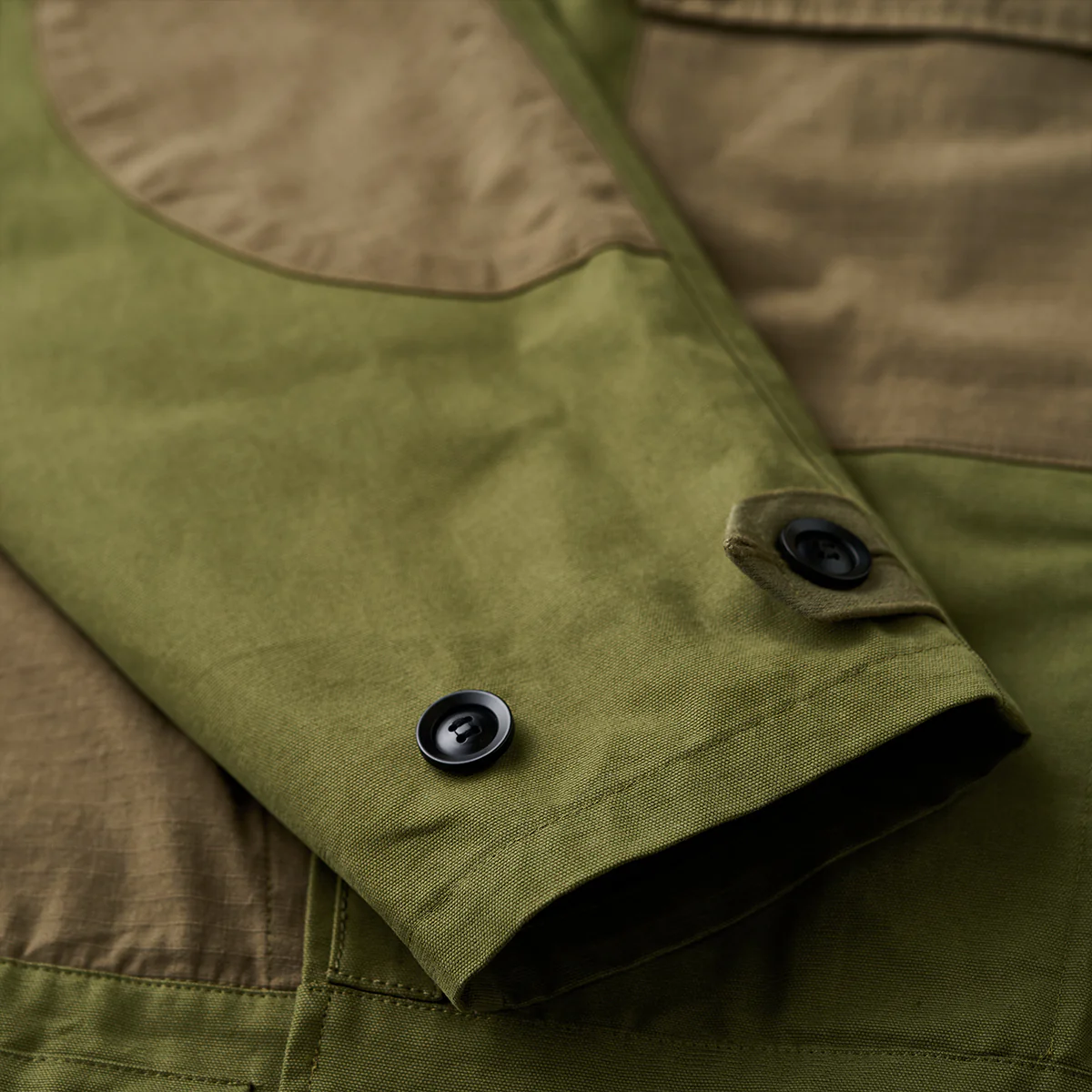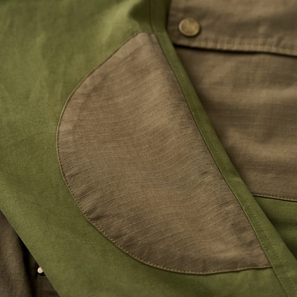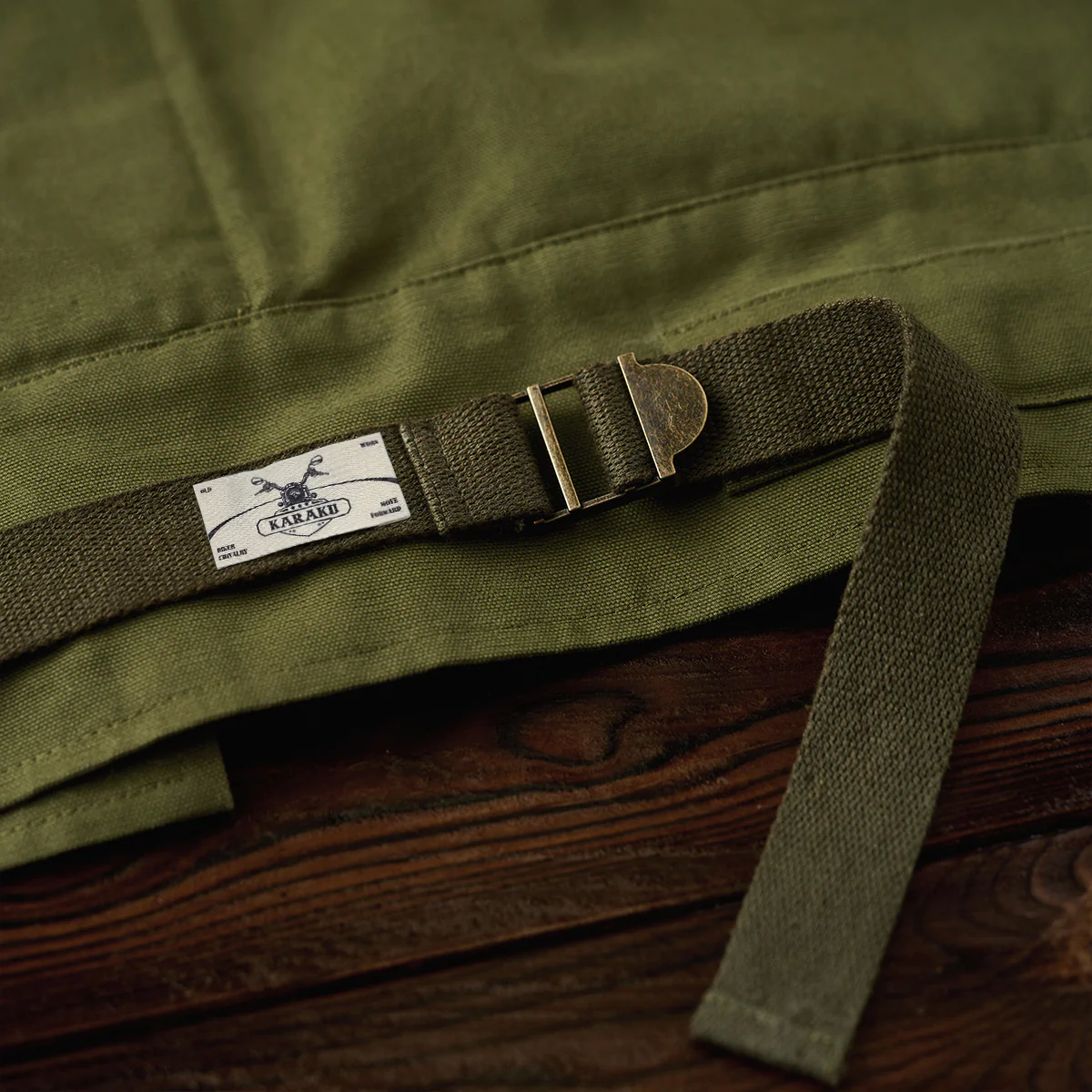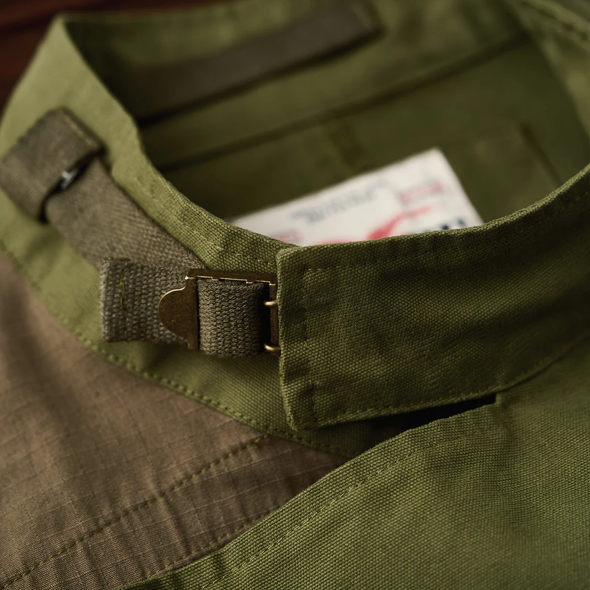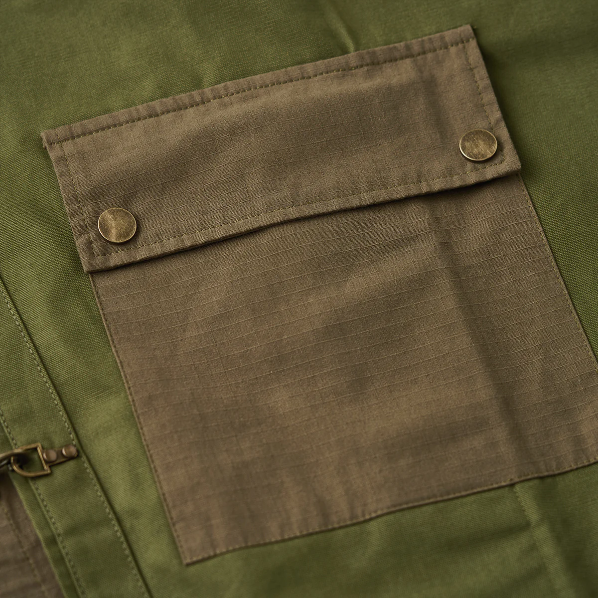 1960年代スウェーデン軍のモーターサイクルジャケットをベースに復刻した一着。防風性を高めるアシンメトリーのフロントデザインが印象的で、ヴィンテージミリタリー特有の無骨な存在感を放ちます。ワークテイスト漂うフックボタンもデザインのアクセント。本体にはミリタリーグリーンのキャンバス生地を採用し、部分的にカーキグリーンのコットンピケ生地を切り替えた異素材コンビネーションが魅力です。色のコントラストが映える配色は、クラシックな雰囲気を残しつつも現代的にアップデート。ゆったりとしたショート丈シルエットで、ジャストサイズはもちろん、オーバーサイズでざっくり羽織るスタイルもおすすめ。現行品ではなかなか味わえない、重厚感と存在感に満ちたミリタリーアウターをお探しの方にぴったりの一着です。