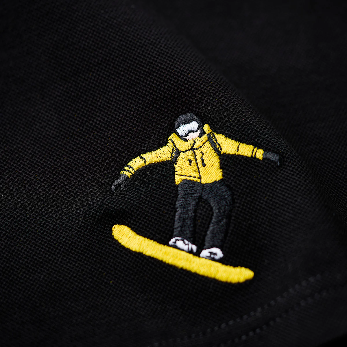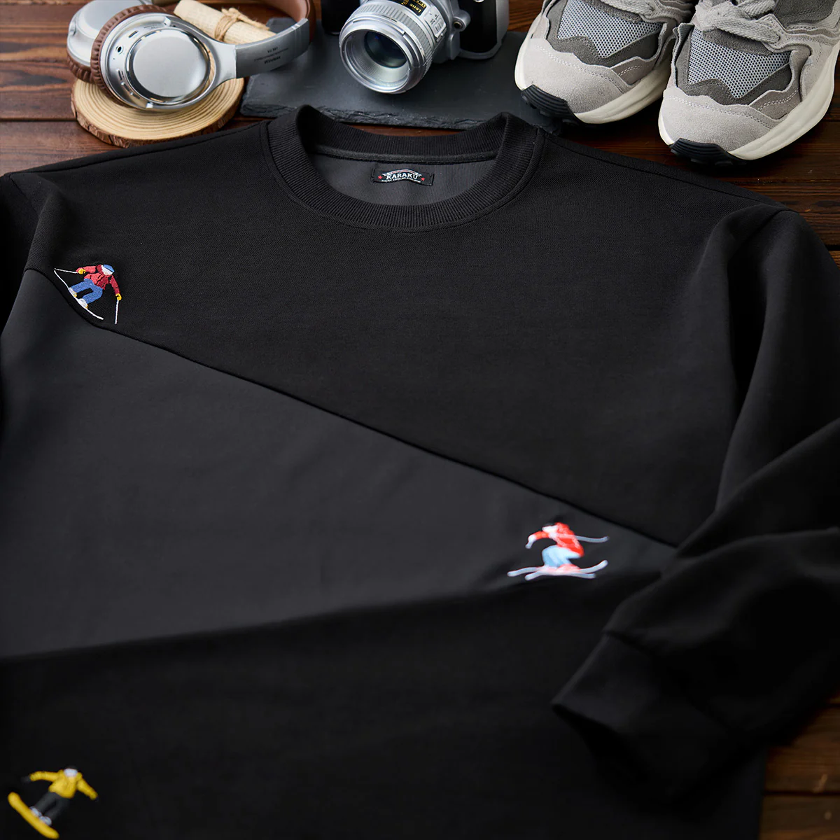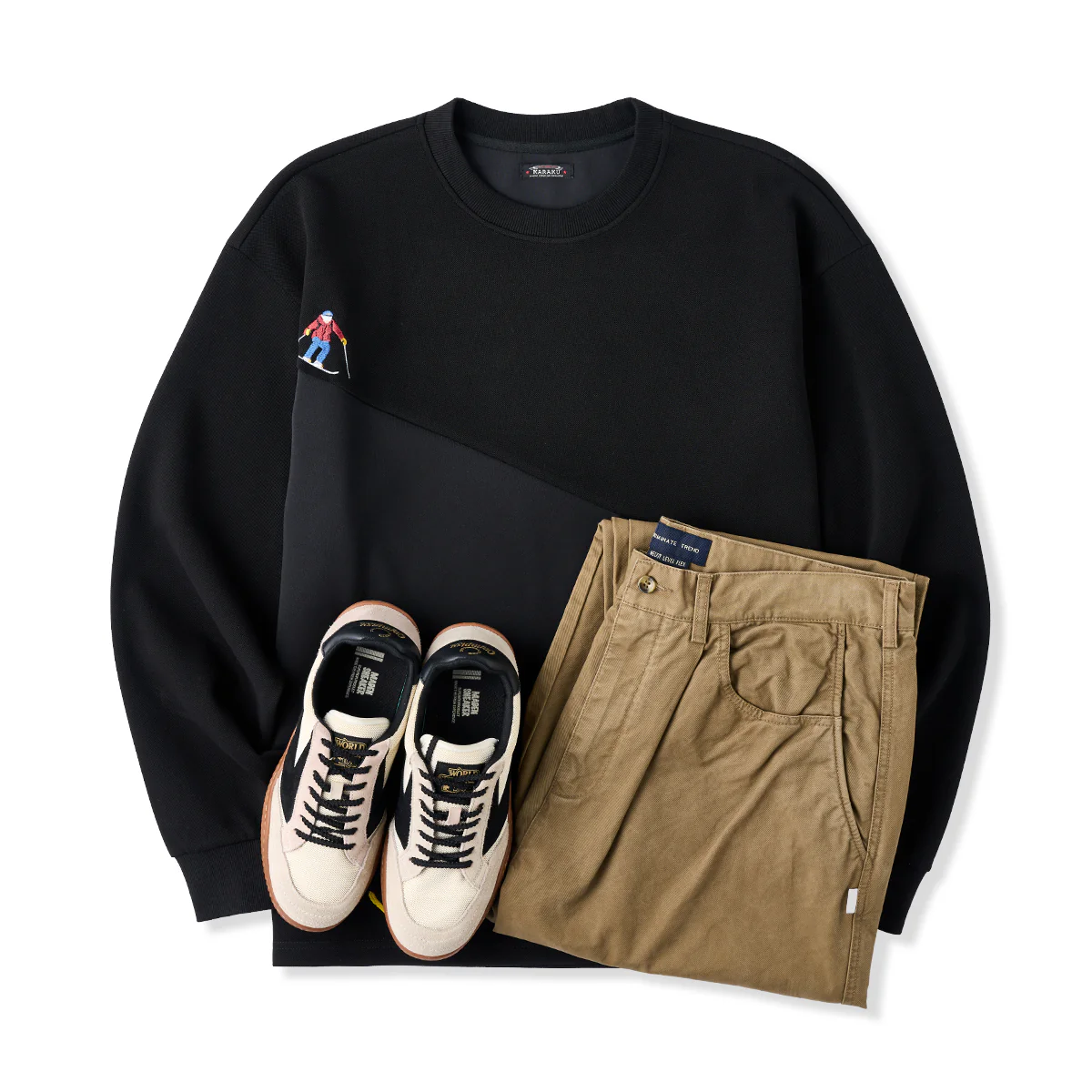 大人気の刺繍入りTシャツが長袖で新登場!半袖モデルは清潔感あるホワイト、長袖はシックなブラックで展開。異素材の切り替えで雪山の斜面を表現したユニークな一着です。前身頃には立体感のあるピケ編み生地を採用し、斜めの切り替えラインが雪山の傾斜を想起させるデザインに。その"斜面"には軽やかに滑走するスキーヤーが刺繍で配置され、遊び心のあるディテールがシンプルなTシャツにストーリーを加えます。街でもアウトドアでも映える、“着るグラフィック”を楽しめるアイテムです。